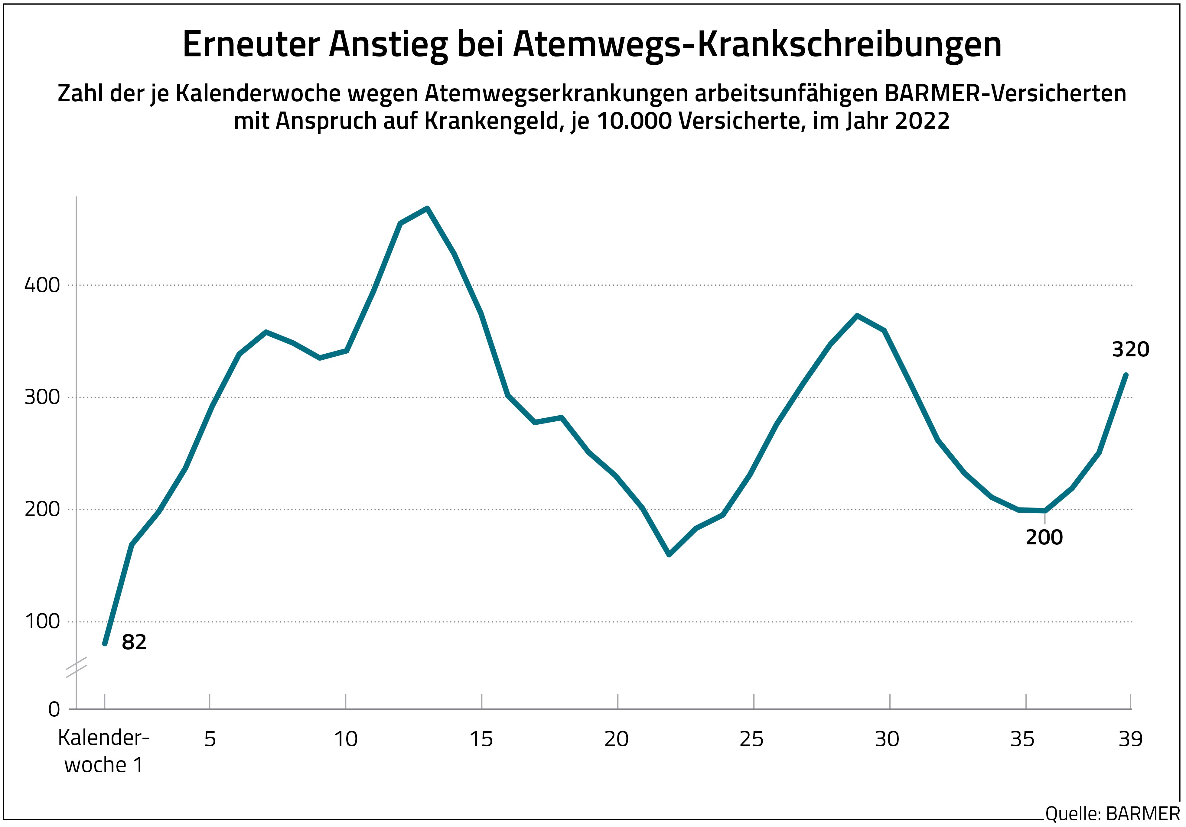 Berlin, 25. Oktober 2022 – Atemwegserkrankungen führen inzwischen wieder zu deutlich mehr Krankschreibungen. Das geht aus einer aktuellen Analyse des Barmer Instituts für Gesundheitssystemforschung (bifg) hervor. Darin werden alle Krankschreibungen aufgrund von typischen saisonalen Atemwegsinfekten erfasst, auch Corona-, Grippe- und Pneumonie-Fälle sind darin enthalten. Nach einem Tiefstand in Kalenderwoche 36 (4. bis 10. September) mit rund 200 Krankgeschriebenen je 10.000 anspruchsberechtigte Barmer-Versicherte waren in KW 40 (2. Oktober bis 8. Oktober) rund 410 je 10.000 Krankengeld-Anspruchsberechtigte arbeitsunfähig. Das entspricht einem Anstieg von mehr als 100 Prozent. Die Corona-Krankschreibungen machen von allen Atemwegs-Krankschreibungen 31 Prozent aus. Auch hier steigt die Zahl der Krankschreibungen langsam wieder an. In KW 40 waren 130 je 10.000 Anspruchsberechtigte mit einer Covid-19-Infektion krankgeschrieben.