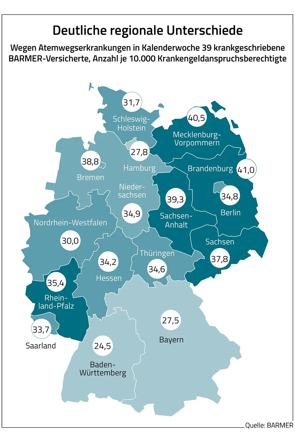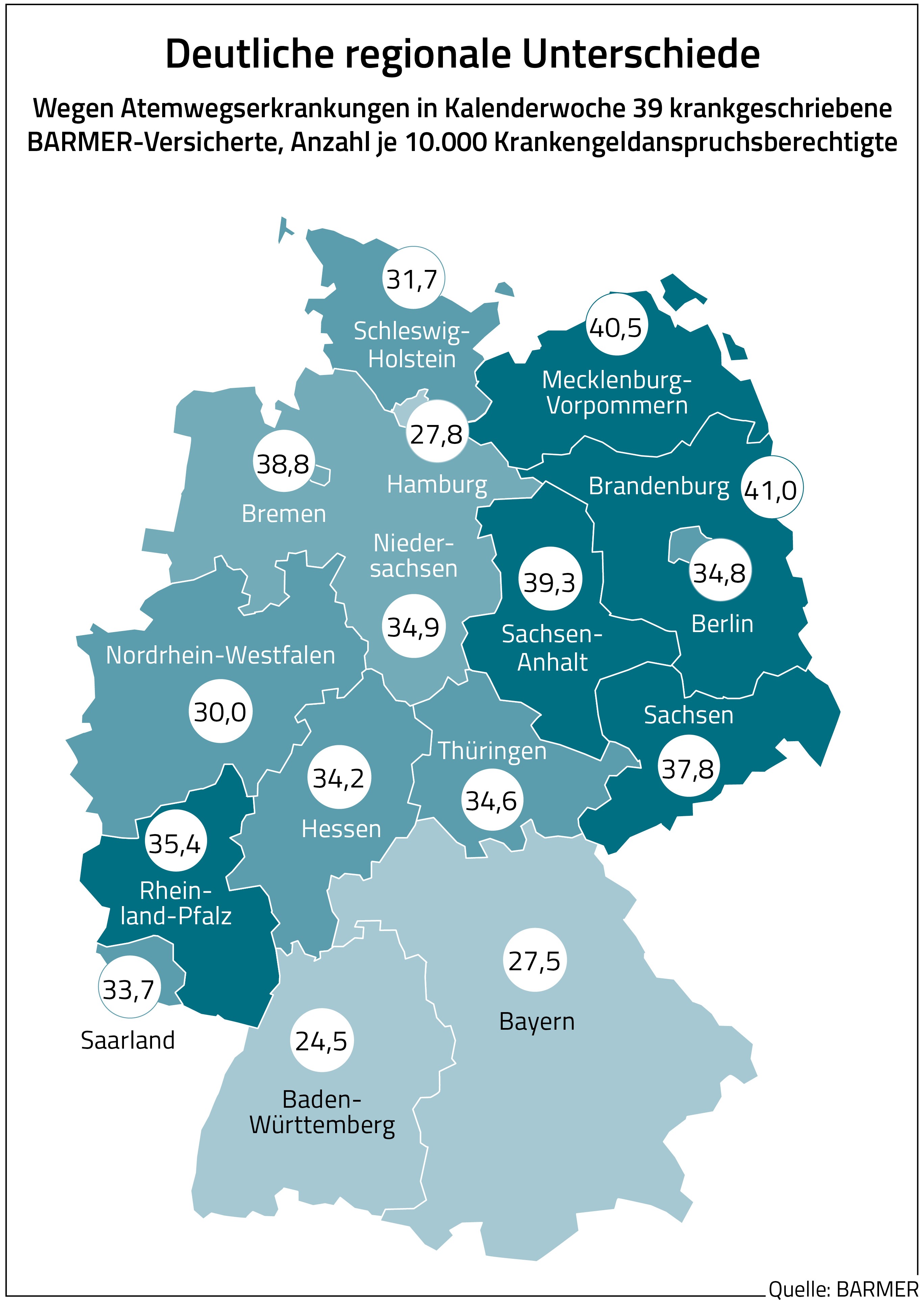 Den Ergebnissen der Analyse zufolge gibt es massive regionale Unterschiede bei der Rate der Atemwegs-Krankschreibungen. In KW 40 war Thüringen mit 493 je 10.000 Krankengeld-Anspruchsberechtigten am stärksten betroffen. Auf Platz zwei und drei befanden sich Rheinland-Pfalz und Sachsen-Anhalt mit jeweils 479 je 10.000 Krankengeld-Anspruchsberechtige, die wegen Atemwegserkrankungen arbeitsunfähig waren. Den niedrigsten Wert gab es in Hamburg mit 326 je 10.000 Anspruchsberechtigte. Baden-Württemberg und Nordrhein-Westfalen hatten mit 368 beziehungsweise 361 je 10.000 Anspruchsberechtige ebenfalls vergleichsweise geringe AU-Zahlen in diesem Zeitraum.
