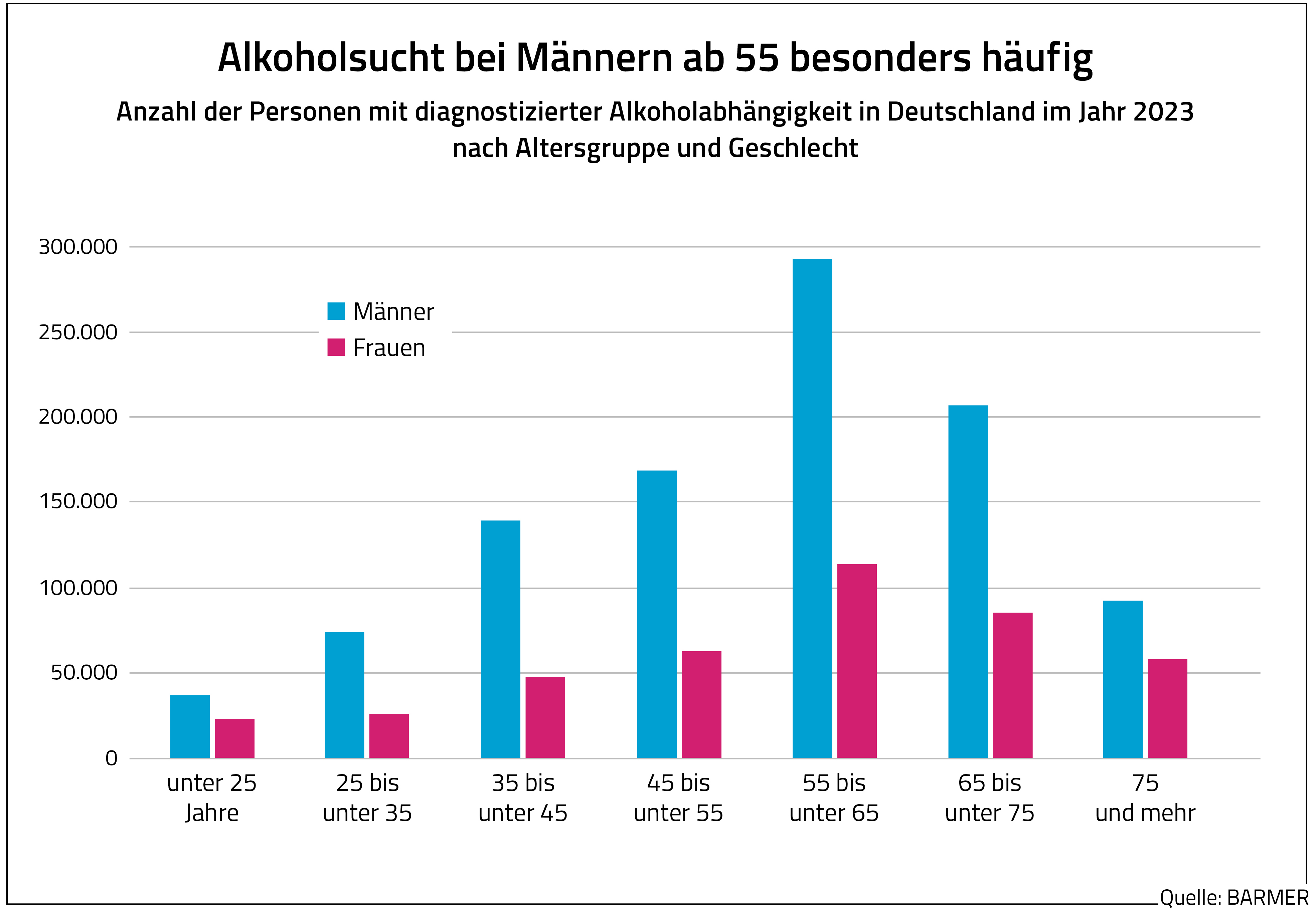 Berlin, 15. Januar 2025 – Mehr als 1,4 Millionen Menschen in Deutschland sind aufgrund von Alkoholsucht in medizinischer Behandlung. Das geht aus einer aktuellen Auswertung des BARMER Instituts für Gesundheitssystemforschung (bifg) für das Jahr 2023 hervor. Demnach waren etwa 1.013.000 Männer und 418.000 Frauen alkoholabhängig. Besonders häufig betroffen waren Menschen in der zweiten Lebenshälfte. Bei den 55- bis 64-Jährigen wurde für den genannten Zeitraum Alkoholsucht bei rund 293.000 Männern und 114.000 Frauen diagnostiziert. „Mit unseren Daten können wir medizinische Behandlungen in Zusammenhang mit einer Alkoholerkrankung erfassen. Die tatsächliche Zahl der Betroffenen wird wesentlich höher liegen. Es ist an der Zeit, das Thema stärker in den Fokus der Gesundheitsvorsorge zu rücken und die gesellschaftliche Verharmlosung von Alkohol hierzulande kritisch zu hinterfragen“, sagt Prof. Dr. med. Christoph Straub, Vorstandsvorsitzender der BARMER. Alkoholsucht sei eine zerstörerische Krankheit mit tiefgreifenden Folgen für Gesundheit, Psyche, soziale Bindungen und berufliche Perspektiven. Trotz gravierender Auswirkungen werde das Problem oft unterschätzt und tabuisiert. Alkohol sei leicht zugänglich und deshalb in der Gesellschaft weit verbreitet, was die frühzeitige Erkennung und Behandlung von Abhängigkeit erschwere.