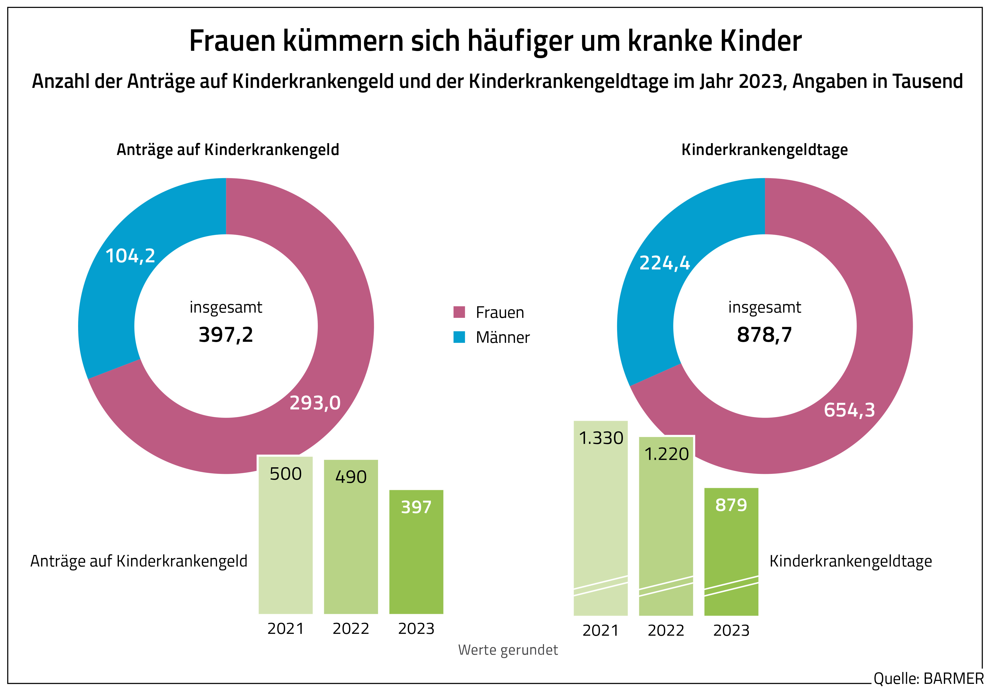 Berlin, 19. Juli 2024 – Frauen beantragen nach wie vor dreimal häufiger als Männer Kinderkrankengeld. Das belegt eine aktuelle Analyse der BARMER. So wurden vom 1. Januar bis zum 31. Dezember des vergangenen Jahres 292.962 entsprechende Anträge von Frauen und 104.259 Anträge von Männern gestellt. „Das Kinderkrankengeld ist ein wichtiges Instrument, um Belastungen von Eltern zu mindern und eine gesunde Umgebung für Familien zu schaffen. Allerdings zeigt unsere Untersuchung auch, dass Frauen nach wie vor die Hauptlast bei der Kinderbetreuung tragen. Sie bleiben häufiger zuhause, um bei Krankheit des Kindes die Betreuung sicherzustellen“, sagt Prof. Dr. med. Christoph Straub, Vorstandsvorsitzender der BARMER. Insgesamt sei das Kinderkrankengeld bis Ende letzten Jahres 397.221 Mal beantragt worden. In den Jahren 2021 und 2022 seien bundesweit rund 500.000 beziehungsweise 490.000 entsprechende Anträge auf die Geldleistung gestellt worden.