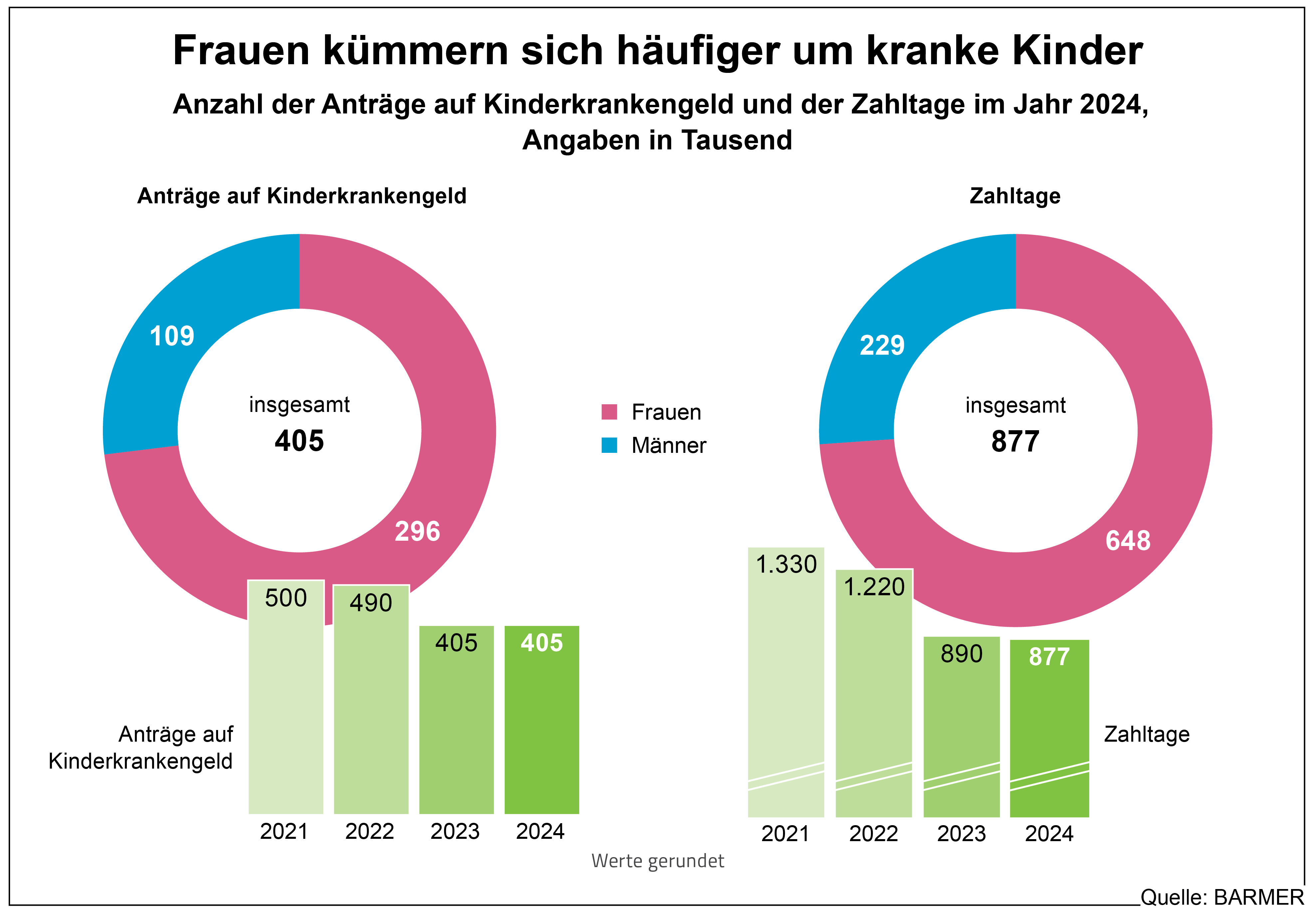 Berlin, 01. August 2025 – Frauen beantragen fast dreimal häufiger als Männer Kinderkrankengeld. Das zeigt eine aktuelle Analyse der BARMER. Demnach wurden im Jahr 2024 bundesweit rund 296.000 Anträge von Frauen eingereicht, während Männer die Leistung im gleichen Zeitraum 109.000 Mal beantragten. „Dass Frauen das Kinderkrankengeld deutlich häufiger in Anspruch nehmen als Männer, spiegelt augenscheinlich die fortbestehende ungleiche Verteilung der familiären Betreuungsverantwortung wider“, sagt Prof. Dr. med. Christoph Straub, Vorstandsvorsitzender der BARMER. Insgesamt seien für die Jahre 2023 und 2024 jeweils 405.000 Anträge verzeichnet worden. In den Jahren 2021 und 2022 hätten die Antragszahlen mit 500.000 und 490.000 hingegen noch höher gelegen.