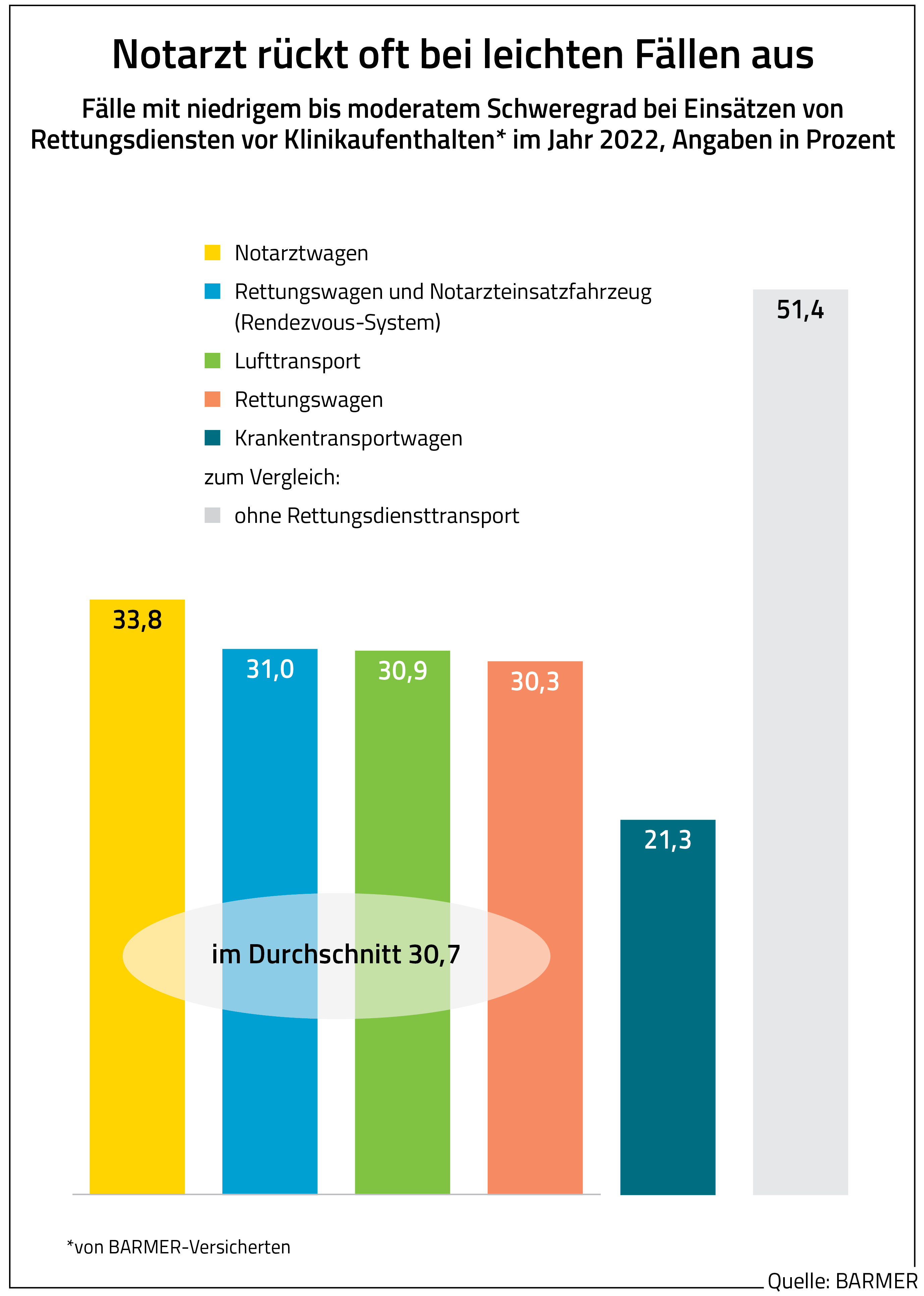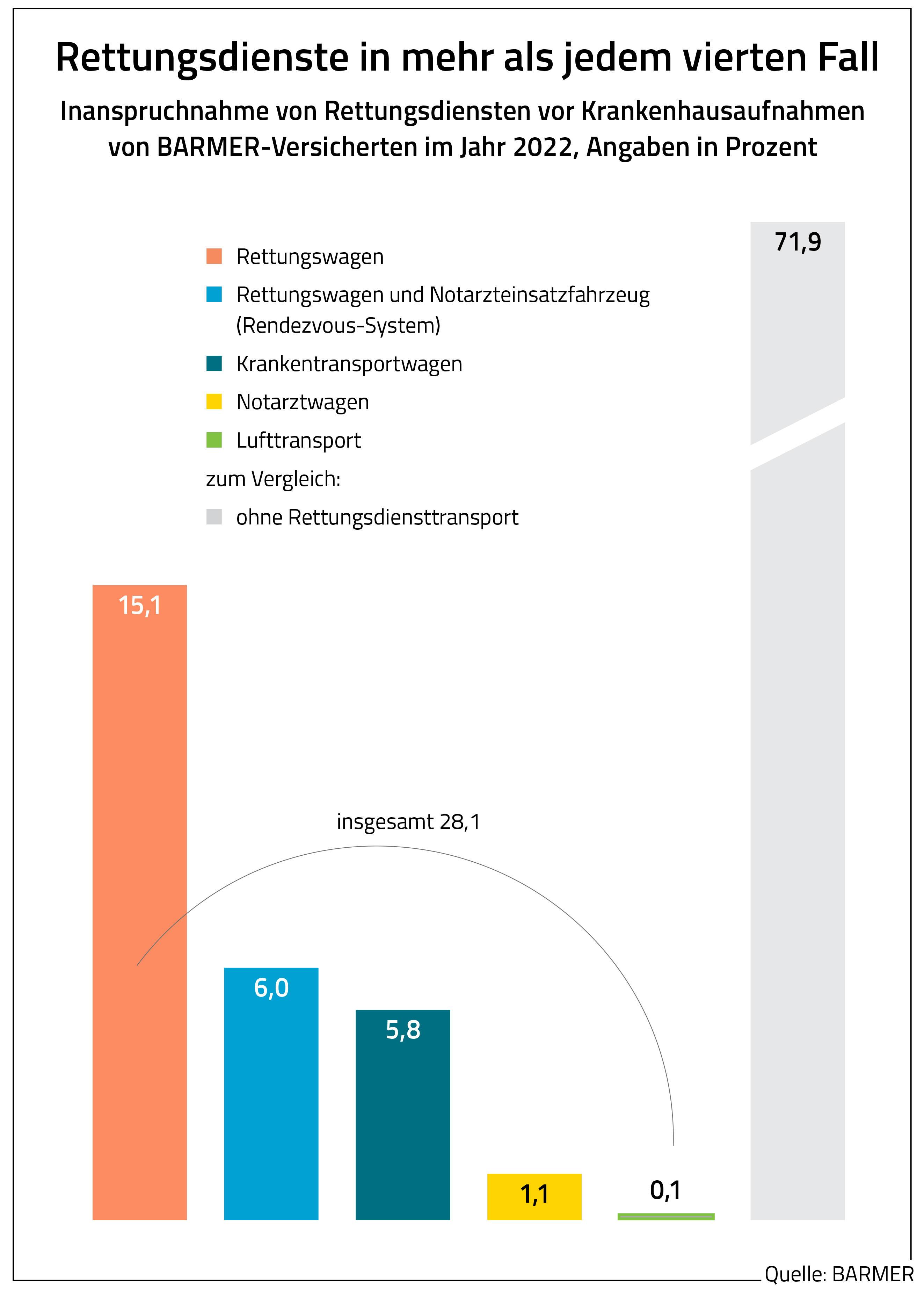 Berlin, 8. Mai 2024 – Der Einsatz des Rettungsdienstes in Deutschland ist häufig nicht zwingend erforderlich. Diesen Schluss legt eine Analyse des BARMER Instituts für Gesundheitssystemforschung (bifg) in Kooperation mit dem Notfallmediziner und Mitglied der „Regierungskommission Krankenhaus“ Prof. Dr. Christian Karagiannidis nahe. Dabei wurden rund zwei Millionen Krankenhausfälle von BARMER-Versicherten im Jahr 2022 untersucht. Mit Ausnahme von Krankentransporten erfolgte demnach fast jeder dritte Rettungsdiensteinsatz bei Fällen mit niedrigem oder moderatem Schweregrad. Häufig auftretende Diagnosen sind dabei etwa Bluthochdruck oder Flüssigkeitsverlust. Prof. Dr. med. Christoph Straub, Vorstandsvorsitzender der BARMER, sagt: „Rettungsdienst und Krankenhäuser könnten massiv entlastet werden, wenn Patientinnen und Patienten in leichteren Fällen ambulant versorgt würden. Bei weitem nicht jeder vermeintliche Notfall ist tatsächlich einer und muss auch nicht per Rettungstransport in die Klinik.“ Karagiannidis betont: „Mehr als 15 Prozent aller Rettungsdienst-Patienten bleiben maximal einen Tag in der Klinik. Hier gibt es ein beträchtliches Ambulantisierungs-Potenzial. Dazu muss die Versorgung vor Ort aber weiter verbessert werden.“