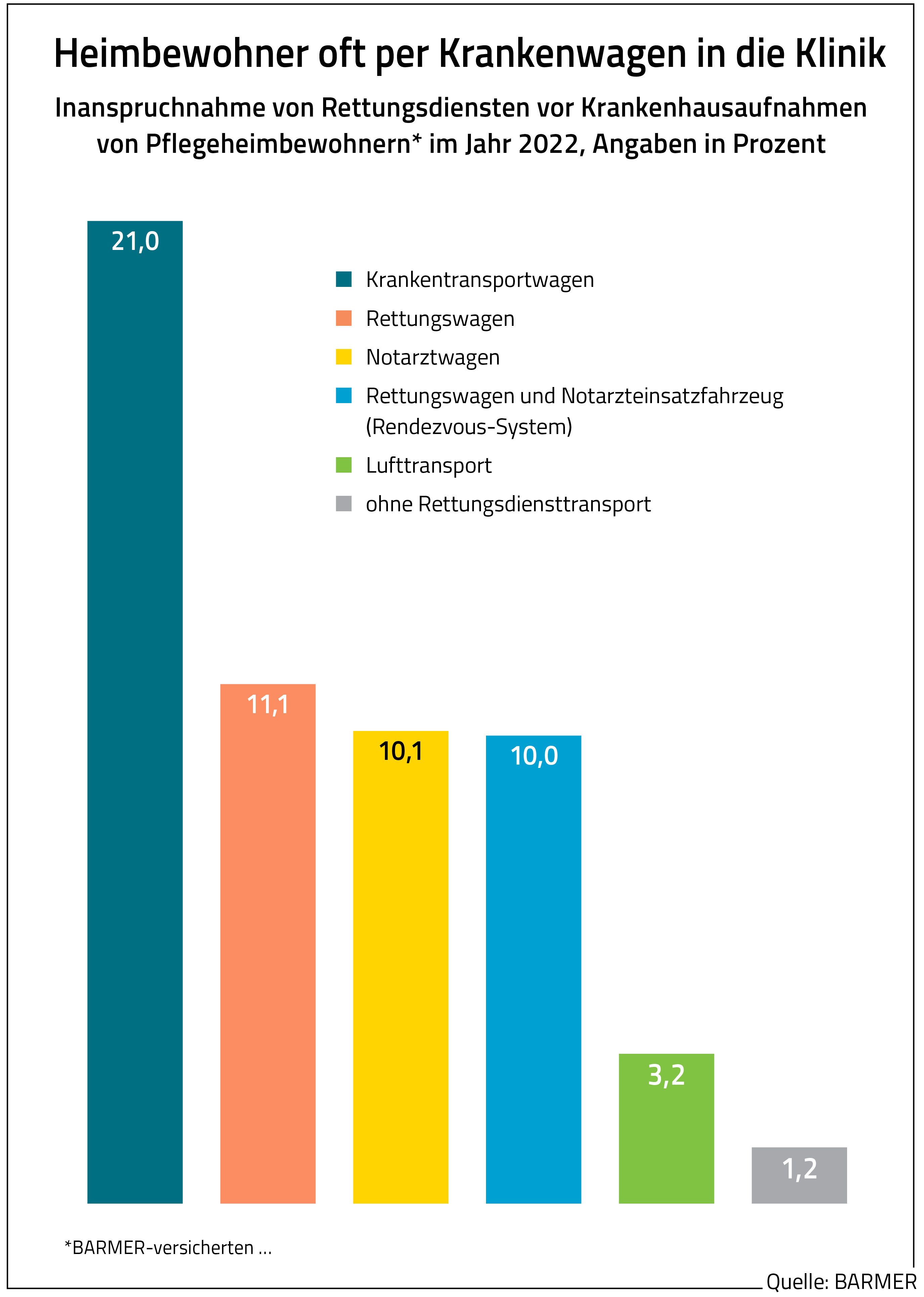 Wie aus der bifg-Analyse weiter hervorgeht, werden vor allem Patienten zwischen 80 und 90 Jahren mit dem Rettungsdienst ins Krankenhaus eingeliefert. So sind zum Beispiel 12,8 Prozent aller Erkrankten, die mit dem Rettungsdienst transportiert werden, Bewohner aus Pflegeheimen.