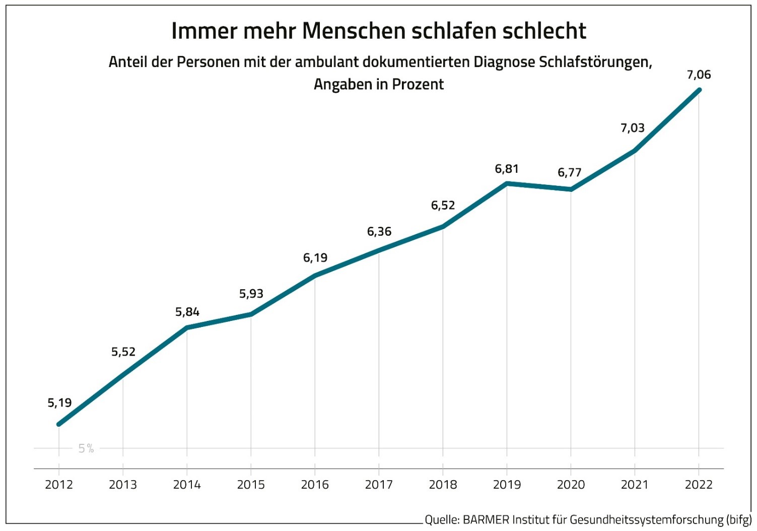 Berlin, 25. Oktober 2023 – Seit Jahren steigt die Zahl der Menschen in Deutschland mit Schlafstörungen. Das geht aus einer aktuellen Analyse der Barmer hervor, nach der die Zahl ihrer Versicherten mit entsprechender Diagnose in den Jahren 2012 bis 2022 von fünf auf rund sieben Prozent gewachsen ist. Das entspricht rund sechs Millionen Fällen im Jahr 2022 und damit einer Steigerungsrate von 36 Prozent. „Schlafstörungen erhöhen das Risiko für Übergewicht, Schlaganfall, Demenz und Herz-Kreislauf-Erkrankungen. Auslöser für Probleme beim Einschlafen oder Durchschlafen können beruflicher und privater Stress oder bei Frauen die Wechseljahre sein. Schlafstörungen können aber auch erste Anzeichen einer Depression sein. Andauernde Schlaflosigkeit sollte unbedingt in der Arztpraxis abgeklärt werden“, sagt Dr. Ursula Marschall, leitende Medizinerin bei der Barmer.