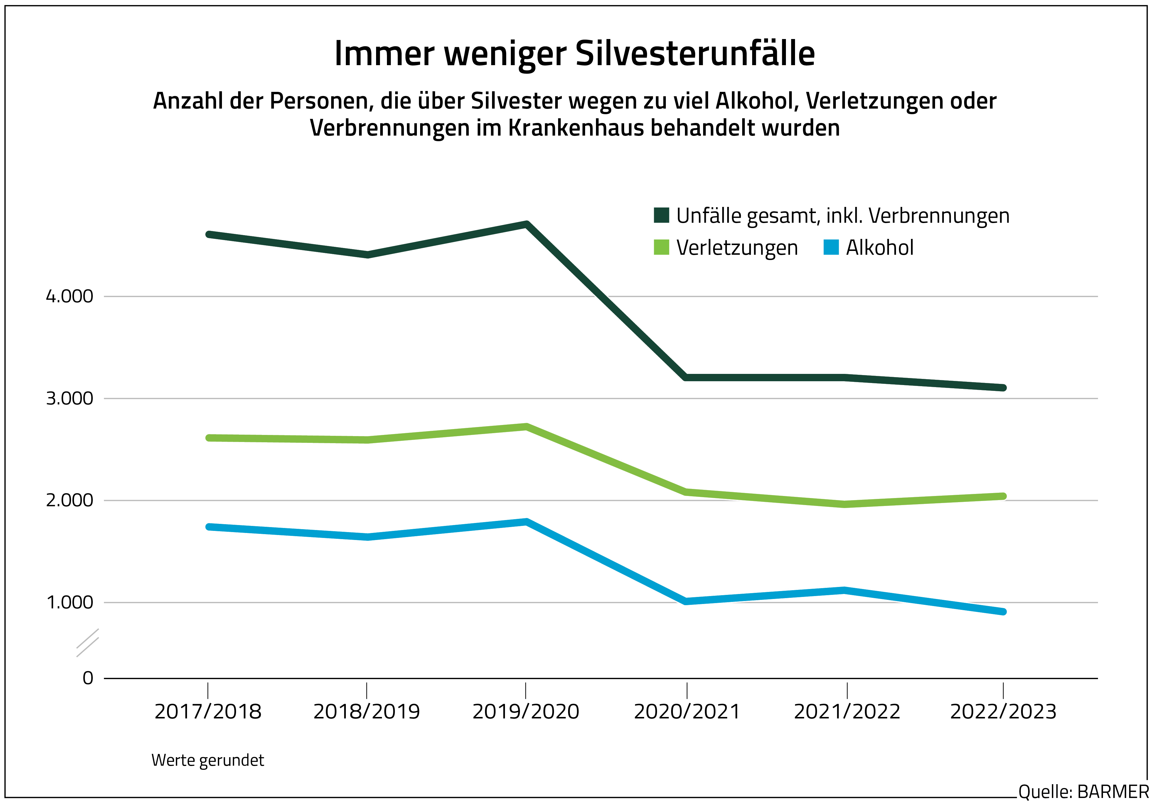 Berlin, 31. Dezember 2023 – Immer weniger Menschen müssen wegen Verletzungen, Verbrennungen oder übermäßigem Alkoholkonsum in der Silvesternacht ins Krankenhaus. Das belegt eine aktuelle Analyse der BARMER. Demnach sind die Fälle bundesweit von etwa 8.950 zum Jahreswechsel 2017/2018 auf rund 6.050 Ende vergangenen Jahres gesunken. Das entspricht einem Rückgang von 32,4 Prozent. Die Analyse betrachtet die Krankenhausfälle in der Silvesternacht über sechs Jahreswechsel. Untersucht wurden stationäre Behandlungen, die durch den Konsum von zu viel Alkohol oder durch den mutmaßlich unsachgemäßen Gebrauch von Feuerwerkskörpern notwendig wurden. Dabei kann es sich zum Beispiel um Alkoholvergiftungen, Verletzungen an Kopf, Auge oder Hand sowie um Verbrennungen handeln. Der BARMER-Analyse zufolge sind die Fälle stationärer Behandlungen aufgrund von Unfällen inklusive Verbrennungen von etwa 4.600 auf rund 3.100 gesunken. Die Fälle von übermäßigem Alkoholkonsum gingen von 1.740 auf 910 zurück und haben sich somit nahezu halbiert. Die Behandlungen der Verletzungen im Krankenhaus sind von 2.610 auf 2.040 gesunken. Das entspricht einem Rückgang von rund 22 Prozent.