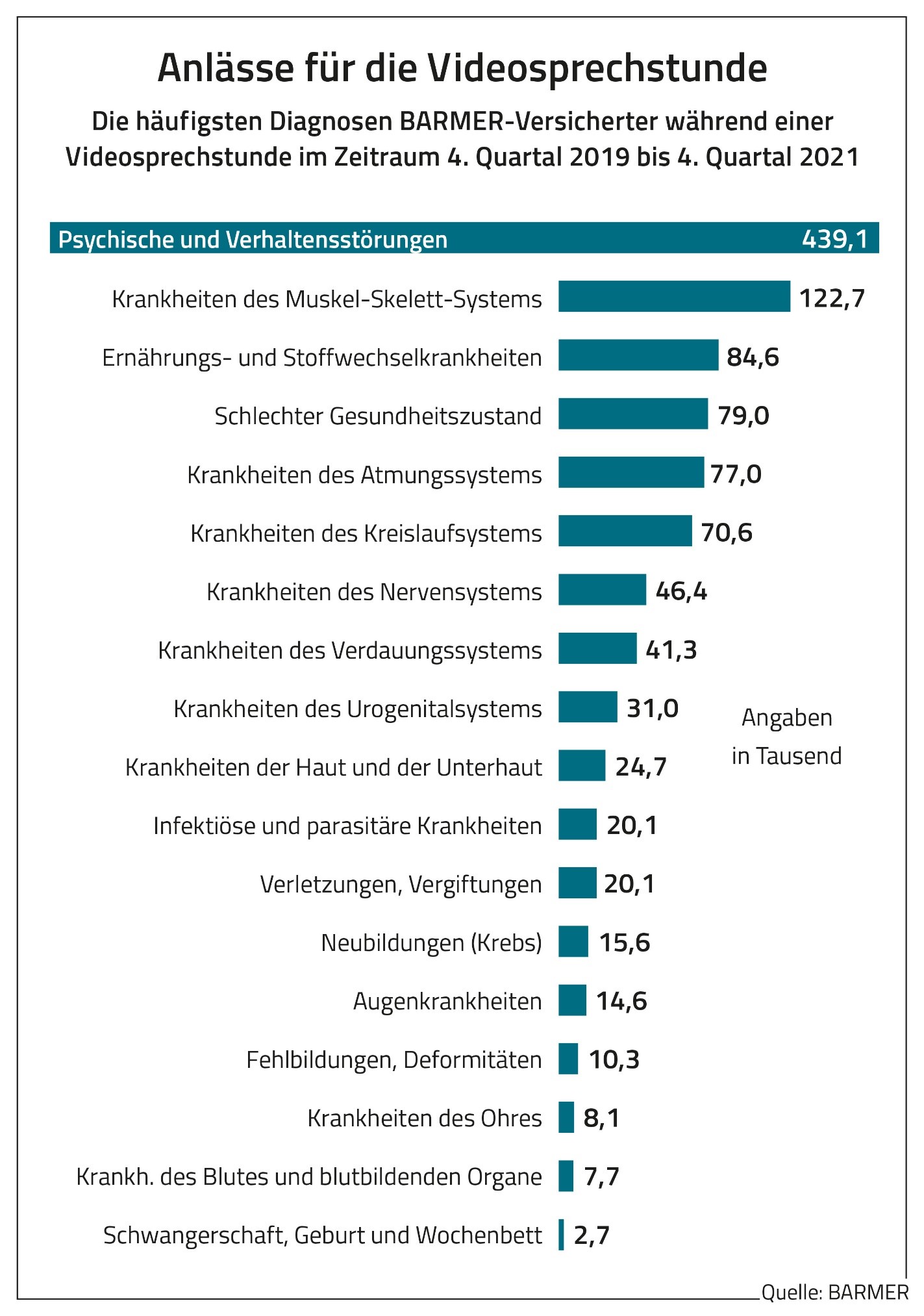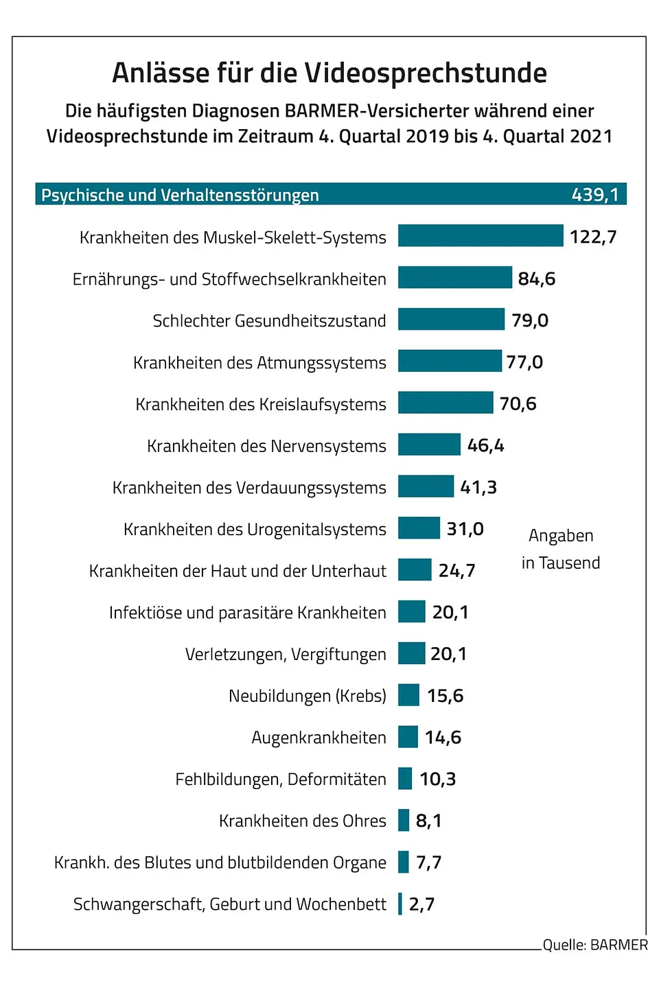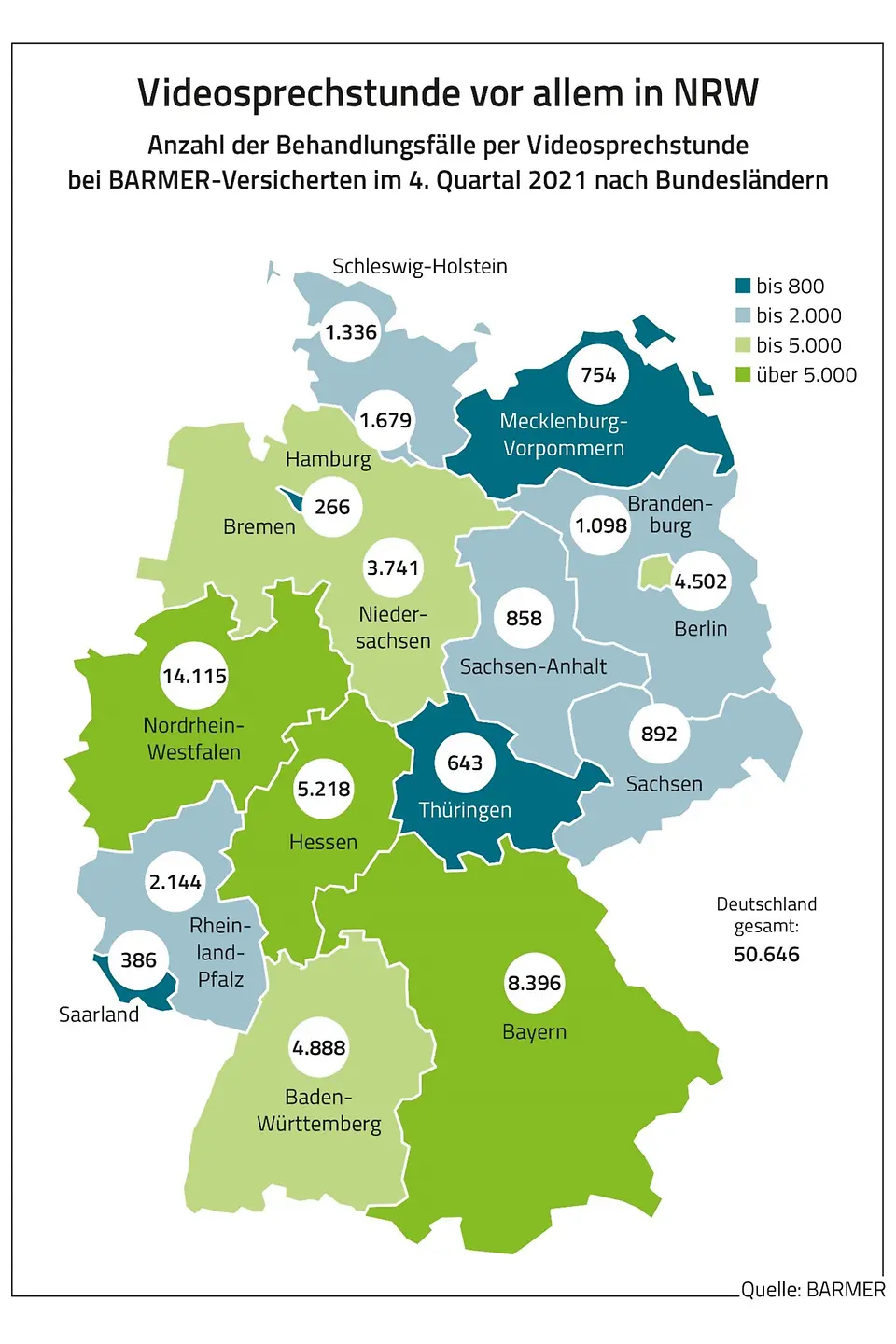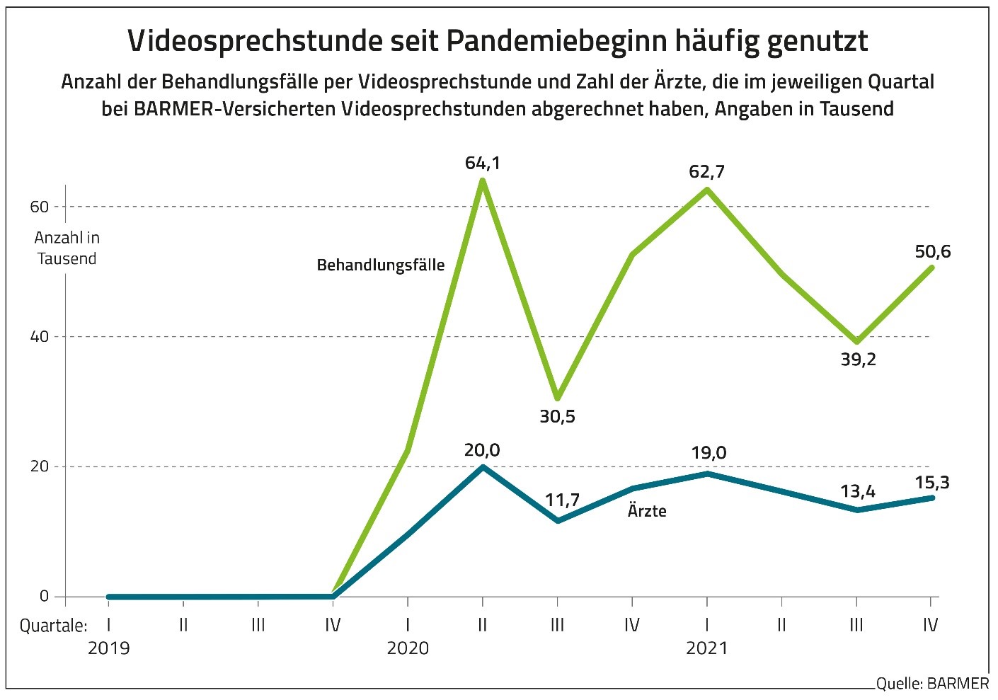 Laut der Barmer-Analyse rechneten rund 26.300 Ärzte im Jahr 2020 und rund 24.400 Ärzte im darauffolgenden Jahr die Kontakte per Video ab. Besonders oft kam die Videosprechstunde in der ambulanten Psychotherapie zum Einsatz. Allein hier gab es im Analysezeitraum etwa 177.500 Behandlungsfälle per Video. Sie wurden in den Jahren 2020 und 2021 von knapp 14.000 beziehungsweise etwa 14.400 Psychotherapeutinnen und Psychotherapeuten angeboten. „Psychotherapeutische Sitzungen per Video erweitern die Kontaktmöglichkeiten zwischen Ärzten und Therapeuten und ihren Patienten“, so Straub. Umso bedauerlicher sei es, dass die Psychotherapeutische Sprechstunde und die vorbereitenden Sitzungen vor dem Beginn der Psychotherapie seit April 2022 nicht mehr per Video stattfinden dürften. Auch hier sollten Restriktionen abgeschafft werden, damit die Videokonsultation weiter in Anspruch genommen werden könne, wo deren Nutzung sinnvoll sei.
