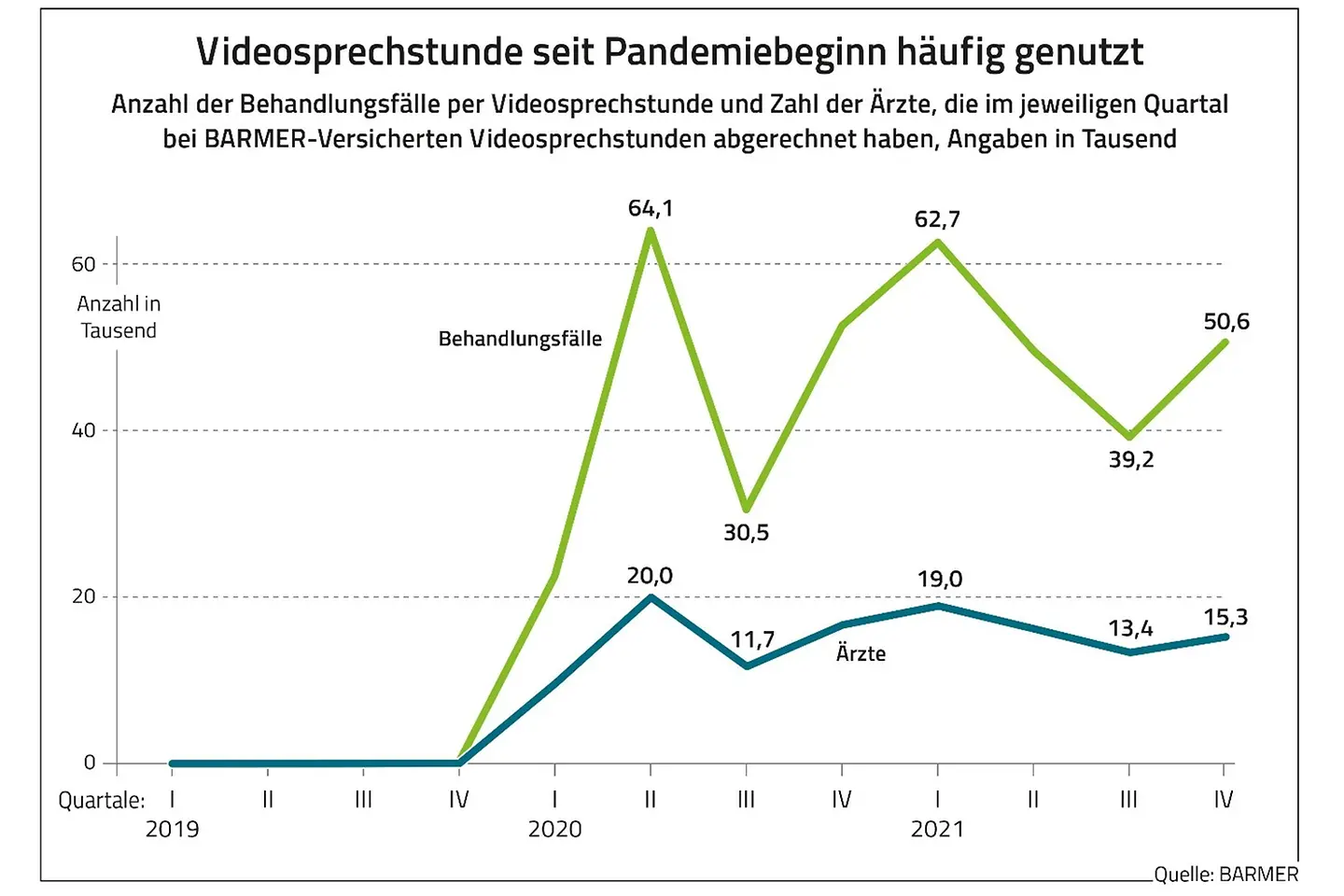 Berlin, 29. August 2022 – Die Nachfrage nach Videosprechstunden ist seit Beginn der Corona-Pandemie massiv gestiegen. Das zeigt eine Analyse der Barmer von Daten aus den Jahren 2019 bis 2021. Demnach beanspruchten Versicherte der Kasse die digitale Konsultation ihrer Ärztinnen und Ärzte in dieser Zeit mindestens 372.000 Mal. Am häufigsten geschah dies mit 64.000 Mal im zweiten Quartal 2020. Im Jahr 2019 war die Konsultation auf Distanz nur rund 250 Mal genutzt worden. „Videosprechstunden haben sich gerade in der Corona-Pandemie bewährt. Sie waren ein Baustein dafür, dass die medizinische Versorgung stabil blieb. Außerdem können sie flexibler in die Terminkalender der Betroffenen integriert werden und sparen Patienten und Ärzten vor allem auf dem Land weite Wege“, sagt Prof. Dr. med. Christoph Straub, Vorstandsvorsitzender der Barmer. Die Videosprechstunde sei während der Pandemie aufgrund einer Sonderregelung bis Ende März dieses Jahres unbegrenzt möglich gewesen. Sie sei bei allen Altersklassen zum Einsatz gekommen und entspreche auch dem Zeitgeist. Seit April 2022 gelte nun eine gesetzliche Beschränkung der Videotermine auf 30 Prozent der Kapazität einer Praxis. Das baue Schranken auf und bremse die Digitalisierung des Gesundheitswesens, so Straub. Aus Sicht der Barmer sei die starre Begrenzung daher unnötig.