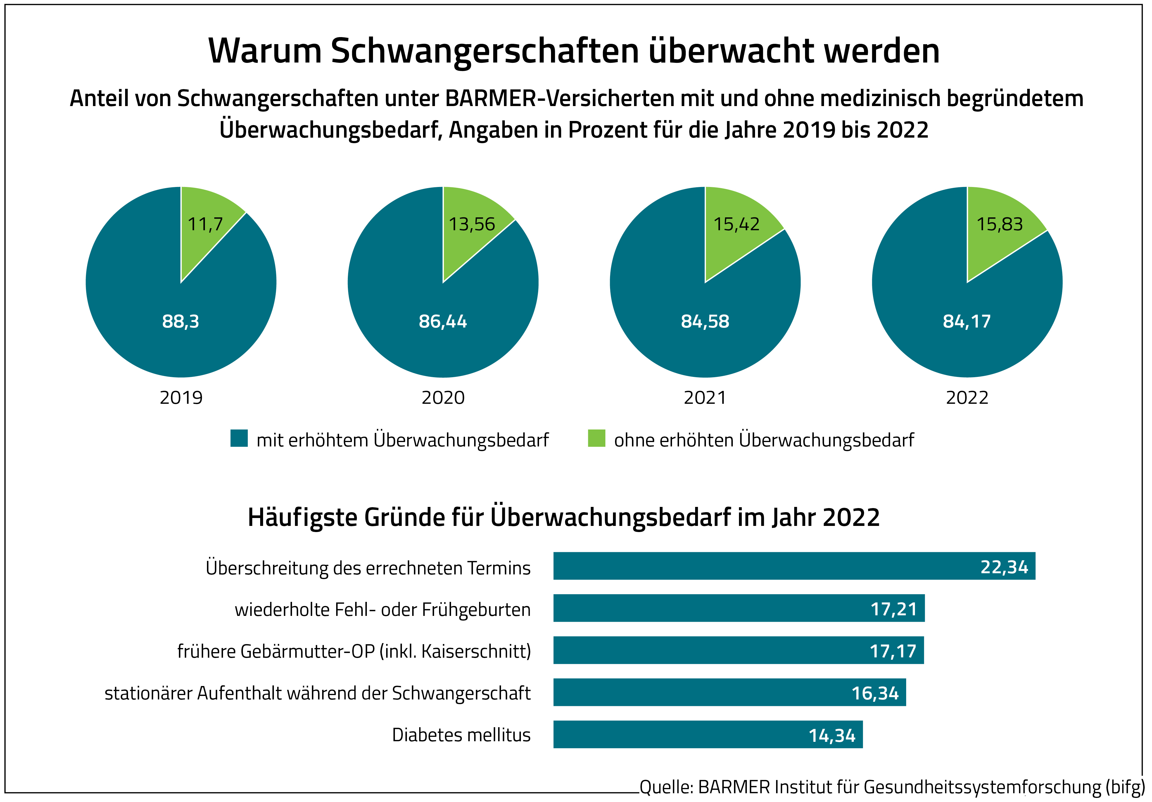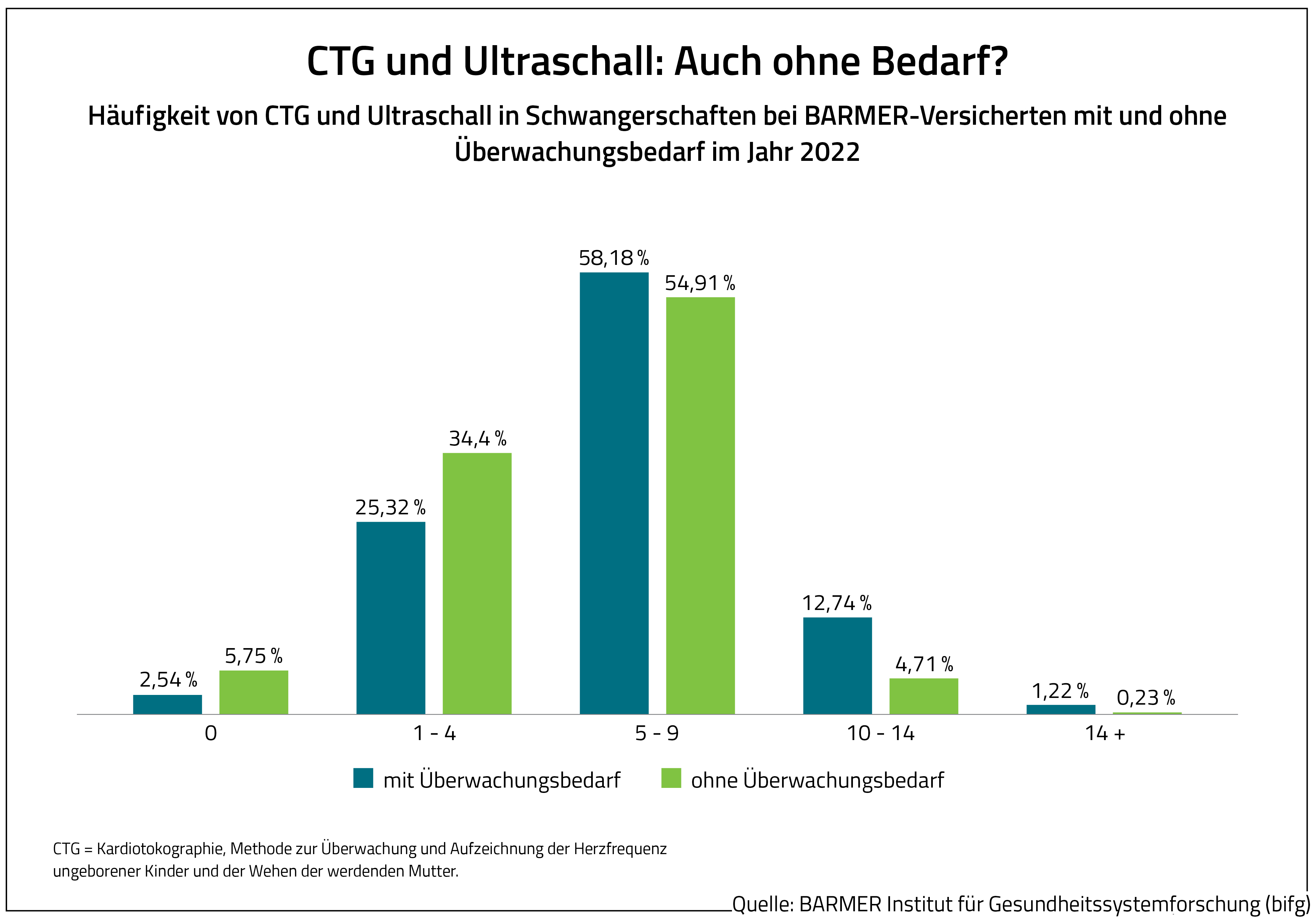 Dem Versorgungskompass zufolge erhalten gesunde Frauen in etwa genauso viele Untersuchungen wie Schwangere mit medizinischen Risikofaktoren, zum Beispiel Diabetes oder Früh- bzw. Fehlgeburten. Mehr als die Hälfte wurden fünf bis neun Mal mit Ultraschall und CTG untersucht. Nur 34,4 Prozent der Frauen ohne Risiken erhielten wie vorgesehen bis zu drei Ultraschalluntersuchungen. 4,7 Prozent der gesunden Schwangeren bekommen zwischen zehn und 14 Untersuchungen. Obwohl nicht empfohlen, wurden gesunde Frauen mit unauffälliger Schwangerschaft im Schnitt fünf Mal mit CTG kontrolliert. Die Analyse von BARMER-Routinedaten ergab zudem, dass im Jahr 2022 rund 84,2 Prozent aller Schwangerschaften mit mindestens einem Risikofaktor belegt waren. Auch wenn der Anteil gesunder Frauen mit unauffälliger Schwangerschaft seit dem Jahr 2019 von 11,7 auf 15,8 Prozent geringfügig gestiegen ist, bleibt der Anteil der mit Risiken belegten Schwangerschaften als Folge zahlreicher und in ihrer Bedeutung sehr unterschiedlicher Befunde weiterhin hoch.