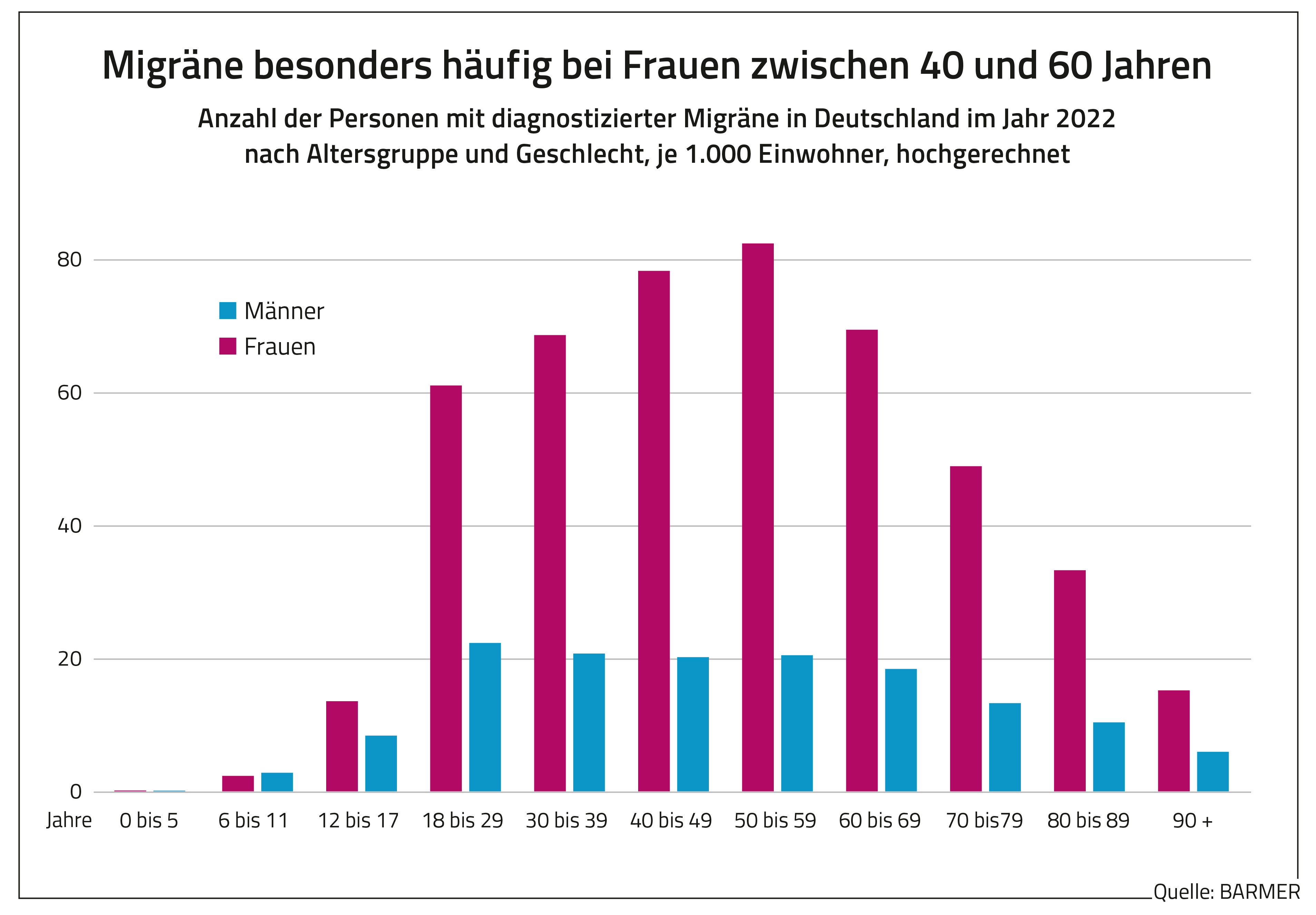Berlin, 28. Juni 2024 – Frauen leiden dreimal häufiger an Migräne als Männer. Das geht aus einer aktuellen Auswertung des BARMER Instituts für Gesundheitssystemforschung (bifg) hervor. Demnach erhielten im Jahr 2022 in Deutschland rund 55 Frauen je 1.000 Einwohnerinnen und 16 Männer je 1.000 Einwohner eine entsprechende Diagnose. Im Jahr 2021 waren es rund 56 je 1.000 Einwohnerinnen und 16 je 1.000 Einwohner. Die Erkrankung tritt in allen Berufsgruppen auf und kommt vor allem im mittleren Alter von 50 bis 59 Jahren vor. „Migräne hat viele Ursachen und Ausprägungen und kann die Lebensqualität erheblich beeinflussen. Daher ist es wichtig, dass Betroffene bei Bedarf eine passgenaue multimodale Schmerztherapie bekommen, die auf den konkreten Einzelfall abstellt“, sagt Prof. Dr. med. Christoph Straub, Vorstandsvorsitzender der BARMER. Das gelte ebenfalls für den chronischen Schmerz, der ein weiterer Bestandteil der Analyse sei.