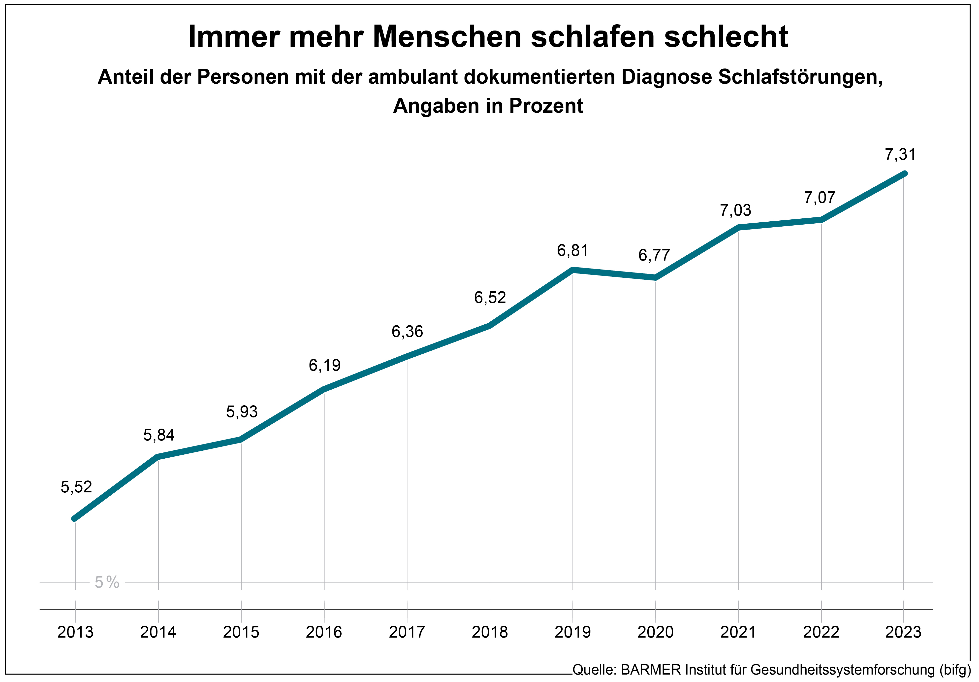Berlin, 25. Oktober 2024 – Immer mehr Menschen in Deutschland leiden an Schlafstörungen. Das geht aus einer aktuellen Analyse der BARMER hervor. Danach ist die Zahl der Versicherten der Krankenkasse mit entsprechender Diagnose in den Jahren 2013 bis 2023 von 5,52 auf 7,31 Prozent gewachsen.Das entspricht einem Anstieg um rund 32 Prozent. Die Fallzahl in der Gesamtbevölkerung erhöhte sich von 4,5 Millionen auf rund 6,2 Millionen. „Schlafstörungen werden offensichtlich immer mehr zum Volksleiden. Sie können verschiedene Ursachen haben, darunter Stress, Angstzustände, unregelmäßige Schlafgewohnheiten, gesundheitliche Probleme oder die Nutzung elektronischer Geräte vor dem Zubettgehen. Die Folgen können gravierend sein und reichen von mangelnder Konzentration über Reizbarkeit bis hin zu einem geschwächten Immunsystem“, sagt Dr. Ursula Marschall, leitende Medizinerin bei der BARMER. Die Zeitumstellung am kommenden Wochenende könne ein weiterer temporärer Faktor für Schlafstörungen sein und einen bereits gestörten Schlafrhythmus zusätzlich durcheinanderbringen.