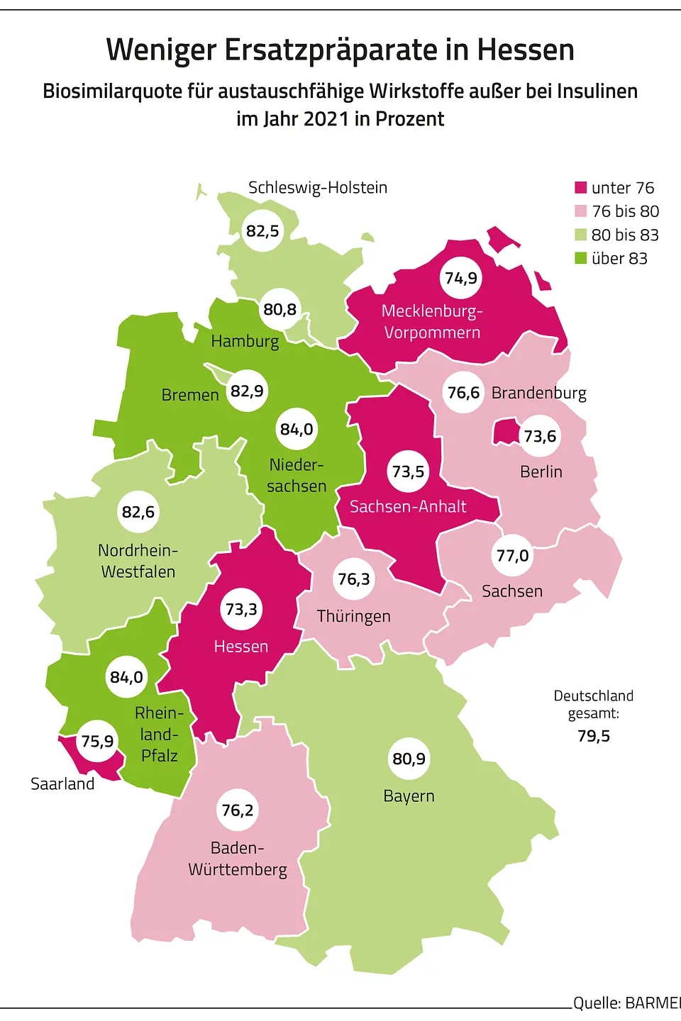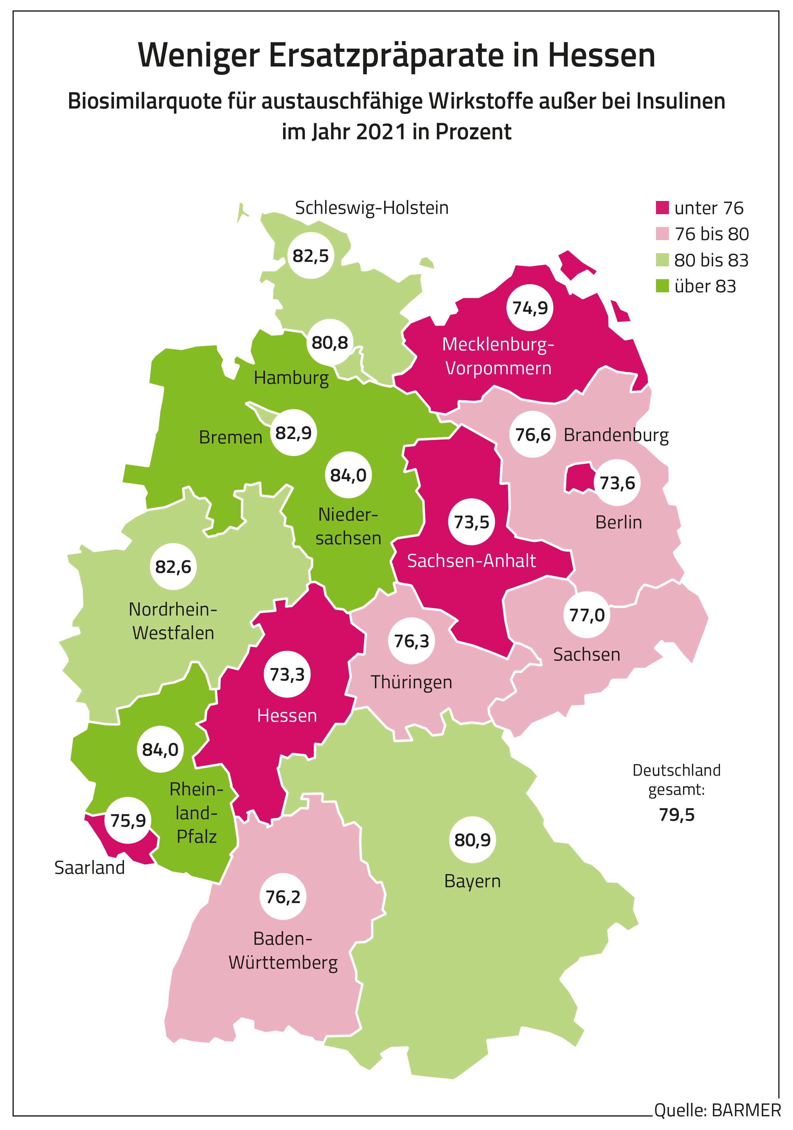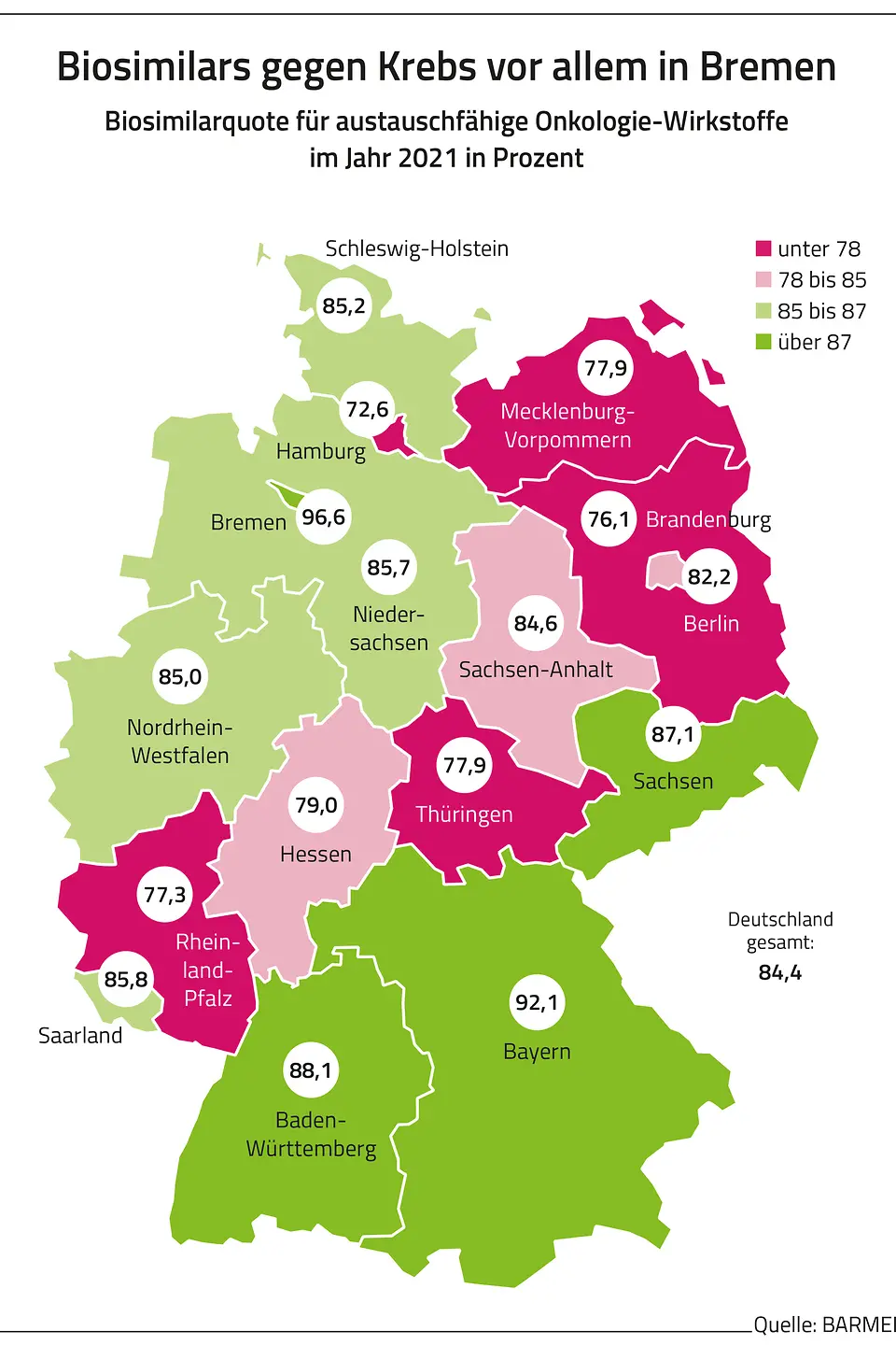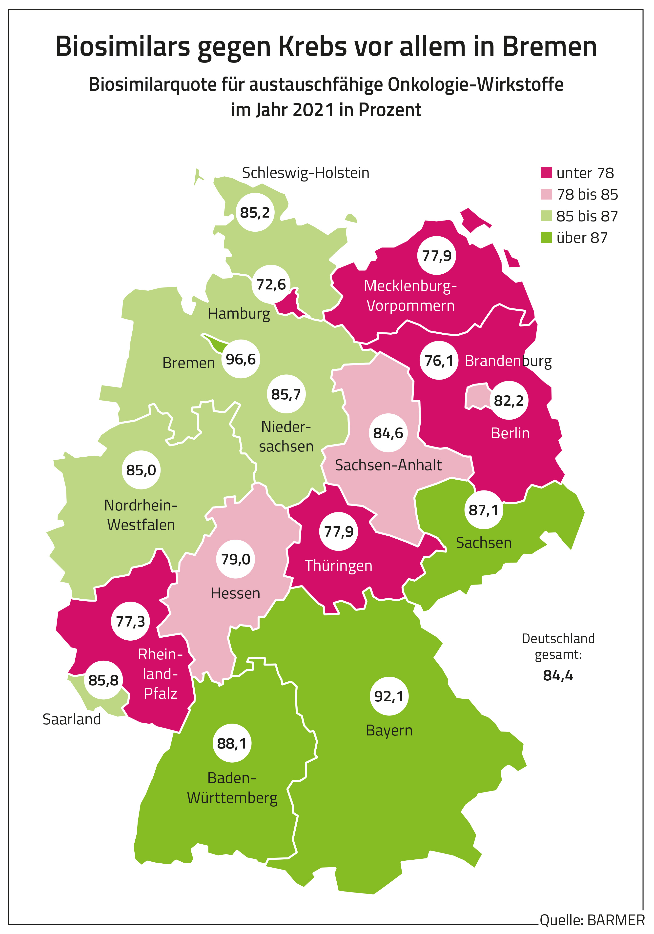 Derzeit gebe es 15 biosimilarfähige Wirkstoffe. Nach einer Analyse des Barmer Instituts für Gesundheitssystemforschung (bifg) beliefen sich deren Kosten im vergangenen Jahr allein bei der BARMER auf 536 Millionen Euro. GKV-weit waren es rund 3,8 Milliarden Euro. Ohne Insuline lag der Biosimilar-Anteil in den Bundesländern zwischen 73 Prozent in Hessen und 84 Prozent in Niedersachsen und Rheinland-Pfalz. Laut bifg-Analyse ist der Biosimilar-Anteil bei Insulinen deutlich niedriger. Dies führe aber für die Kassen nicht zu Mehrkosten im Vergleich zu Humaninsulin. Bei biosimilarfähigen Krebsmedikamenten erstreckte sich die Spanne gemäß der Auswertung von 73 Prozent in Hamburg bis hin zu 92 Prozent in Bayern und 97 Prozent in Bremen. „Die unterschiedlich hohen Biosimilar-Quoten zeigen, dass der geplante Austausch von Originalpräparaten und Biosimilars in Apotheken regionales Potenzial hat. Rein medizinisch sind so große Spannbreiten bei den Biosimilar-Quoten nicht erklärbar. Die geplanten Austauschregeln werden dazu beitragen, die bestehenden regionalen Unterschiede erheblich zu verringern“, so Straub.