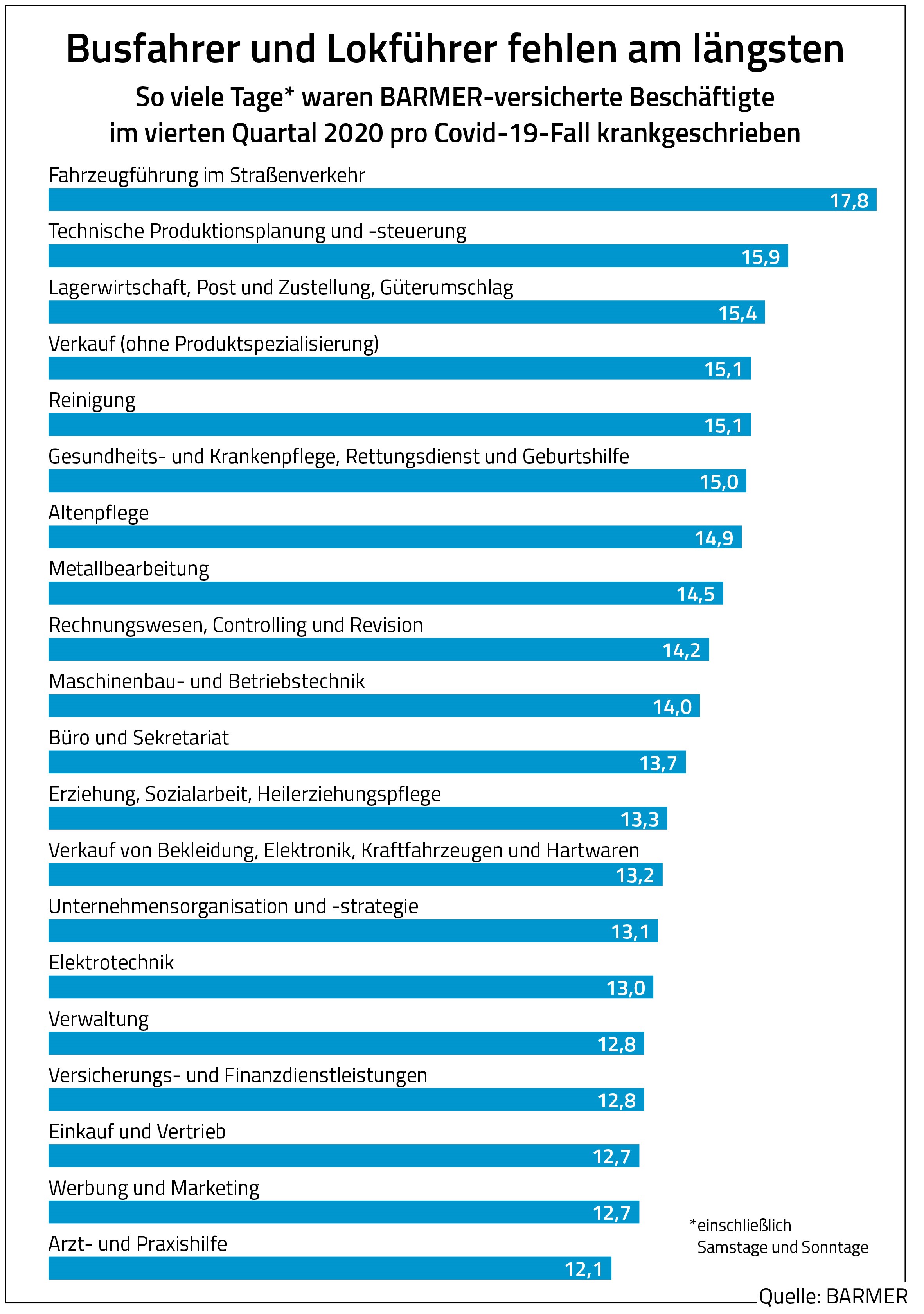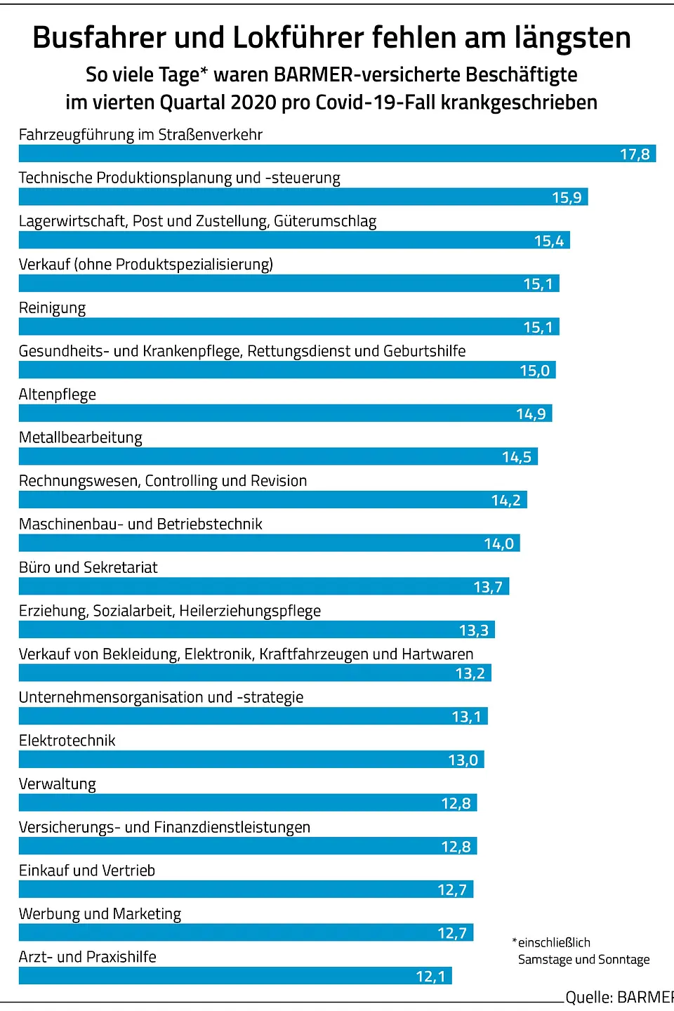 Massive Unterschiede zwischen den einzelnen Berufsbranchen gebe es aber nicht nur bei der Zahl der Barmer-versicherten am Coronavirus Erkrankten, sondern auch bei der Dauer der Krankschreibungen. So seien im vierten Quartal des vergangenen Jahres an Covid-19 erkrankte Fahrzeugführer im Schnitt 17,8 Tage arbeitsunfähig gewesen. Bei Beschäftigten in Gesundheits- und Krankenpflege, Rettungsdienst und Geburtshilfe seien es 15,0 Tage gewesen und in der Altenpflege 14,9 Tage. Die geringsten Fehlzeiten hätten Covid-19-erkrankte Beschäftigte in Werbung und Marketing mit 12,7 Tagen sowie in Arztpraxen mit 12,1 Tagen.