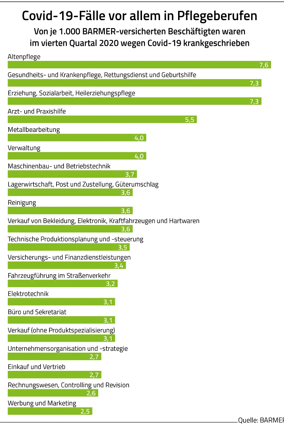 Berlin, 15. Februar 2021 – In keiner anderen Berufsgruppe Deutschlands sind so viele Beschäftigte am Coronavirus erkrankt wie in der Altenpflege. Dies geht aus einem aktuellen Branchenvergleich der Barmer hervor. Dabei wurden die 20 Berufsgruppen mit den anteilig meisten Covid-19-Erkrankten ermittelt. So waren im vierten Quartal vergangenen Jahres 7,6 je 1.000 Barmer-versicherten Erwerbstätigen in der Altenpflege wegen einer Covid-19-Infektion krankgeschrieben. Nur knapp dahinter folgen Beschäftigte in Gesundheits- und Krankenpflege, Rettungsdienst, Geburtshilfe sowie Erwerbstätige in Erziehung, Sozialarbeit und Heilerziehungspflege mit jeweils 7,3 je 1.000 Betroffenen.