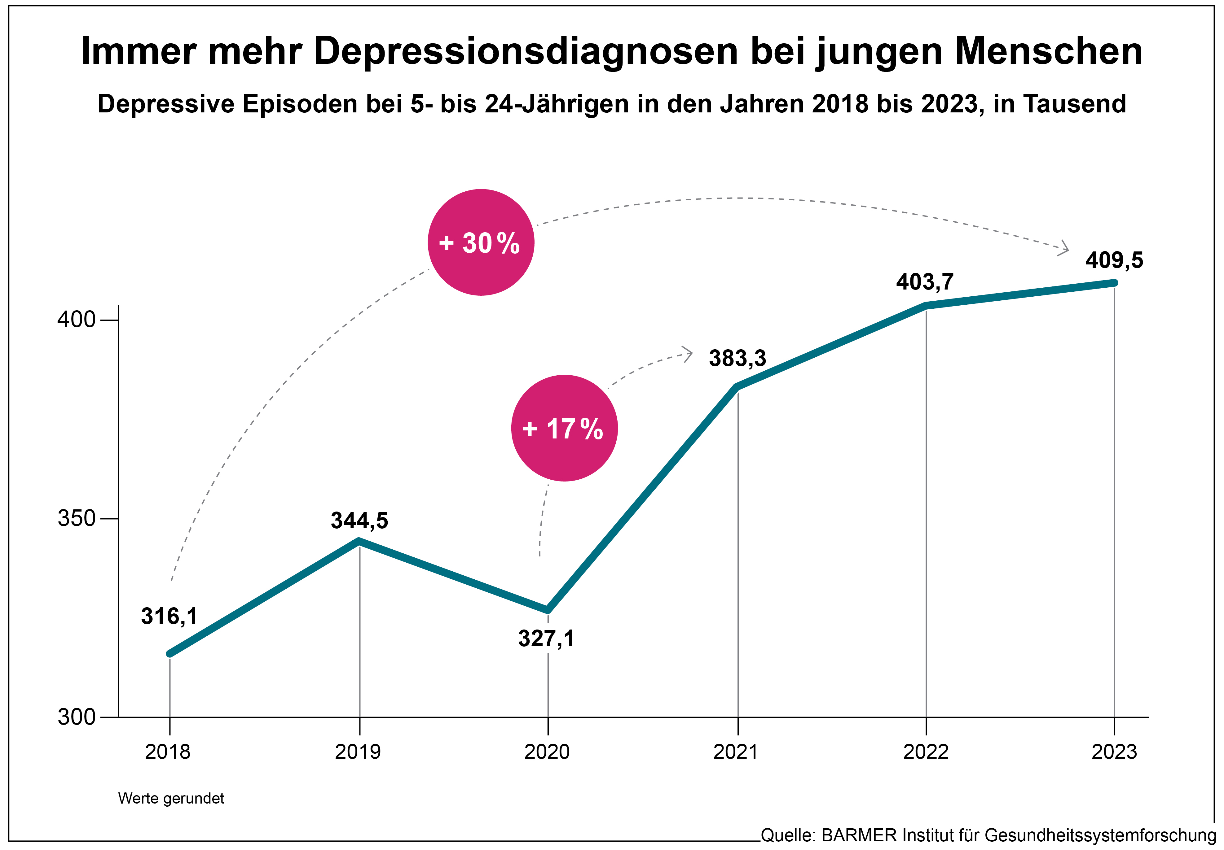 Berlin, 23. Oktober 2024 – Immer mehr junge Menschen erhalten die Diagnose Depression. Das geht aus einer aktuellen Auswertung des BARMER-Instituts für Gesundheitssystemforschung (bifg) hervor. Demnach bekamen im Jahr 2018 bundesweit gut 316.000 junge Menschen zwischen fünf und 24 Jahren eine depressive Episode diagnostiziert. Im vergangenen Jahr waren es mehr als 409.000 Betroffene. Das entspricht einem Zuwachs um knapp 30 Prozent binnen sechs Jahren. Den mit Abstand größten Anstieg innerhalb eines Jahres gab es mit Ausbruch der Corona-Pandemie von 2020 auf 2021 von etwa 327.000 auf gut 383.000 Fälle. „Die deutliche Zunahme an Depressionen bei jungen Menschen ist besorgniserregend. Dabei hat die Erkrankung viele Gesichter und wird nicht immer sofort erkannt. Selbst wenn Betroffene oder Angehörige merken, dass etwas nicht stimmt, fällt ihnen konkrete Unterstützung mitunter schwer“, sagt Prof. Dr. med. Christoph Straub, Vorstandsvorsitzender der BARMER. Vor diesem Hintergrund biete die BARMER in Kooperation mit der Stiftung Deutsche Depressionshilfe und Suizidprävention ab sofort kostenlose digitale „Mentale Erste Hilfe“-Seminare für Jugendliche und junge Erwachsene an. Dabei gehe es darum, erste Anzeichen psychischer Belastungen bei sich selbst und Anderen zu erkennen. Die Teilnehmenden lernten zum Beispiel, wie sie Belastungen von Erkrankungen unterschieden, wann, wo und wie professionelle Hilfe hinzuzuziehen sei und wie sie ihre psychische Gesundheit stärken könnten. Sie bekämen unter anderem Wege aufgezeigt, wie psychische Beschwerden im eigenen Umfeld adäquat angesprochen werden könnten und Angehörige unterstützen könnten, professionelle Hilfe zu suchen.
