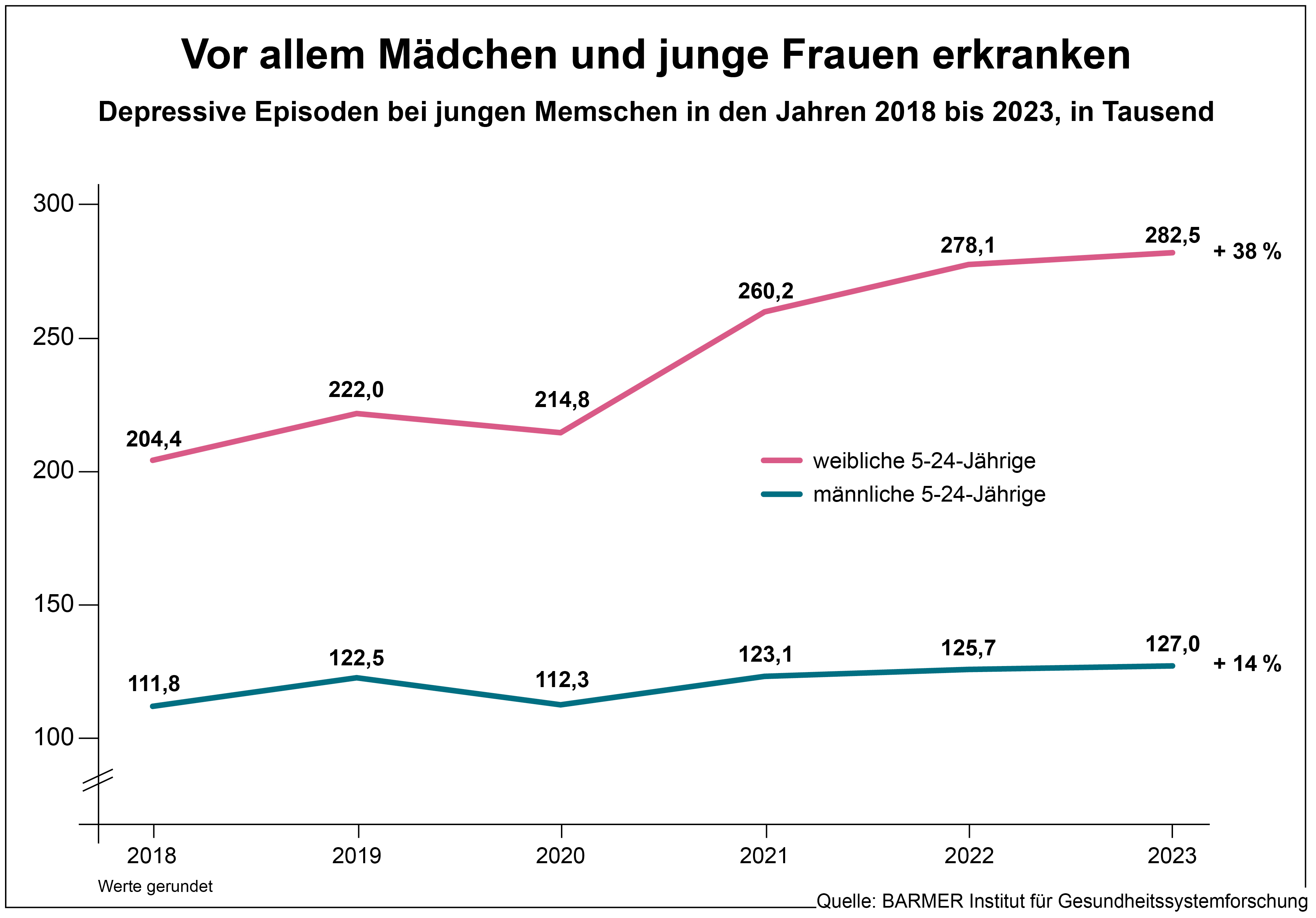 Wie aus der BARMER-Auswertung weiter hervorgeht, leiden vor allem Mädchen und junge Frauen an Depressionen. Demnach ist die Fallzahl zwischen den Jahren 2018 und 2023 von circa 204.000 auf rund 283.000 Betroffene gestiegen. Dies entspricht einem Plus von gut 38 Prozent. Bei Jungen und jungen Männern ist die Fallzahl von rund 112.000 auf fast 127.000 gestiegen, was einen Zuwachs von 14 Prozent ausmacht. „Wir wissen schon lange, dass es geschlechtsspezifische Unterschiede bei Depressionen gibt. Aber hierzu sind weitere Analysen erforderlich, um die Wirkzusammenhänge noch besser zu verstehen“, so BARMER-Chef Straub.