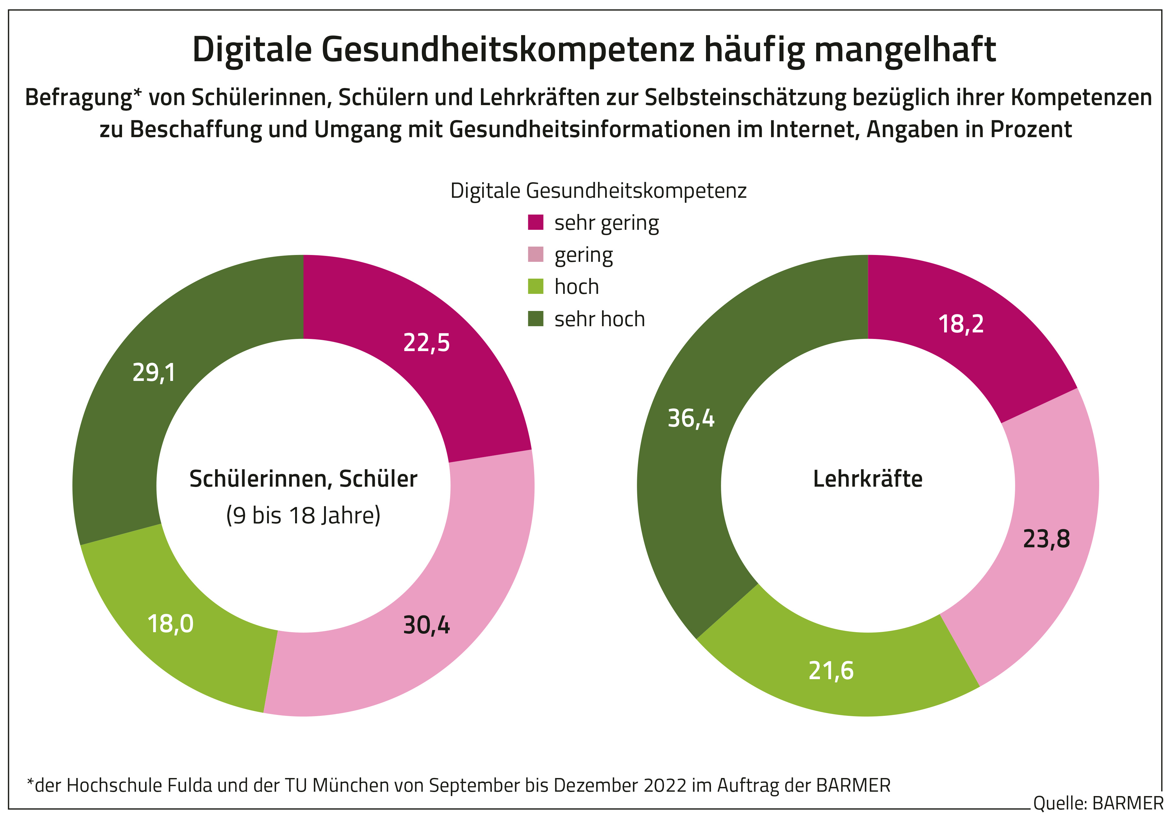 Berlin, 27. April 2023 – Mehr als die Hälfte aller Schülerinnen und Schüler zwischen neun und 18 Jahren bescheinigt sich selbst eine mangelhafte digitale Gesundheitskompetenz. Nur wenig besser ist das Bild bei ihren Lehrkräften. 42 Prozent unter ihnen sehen sich nur unzureichend für die Beschaffung und den Umgang mit Gesundheitsinformationen im Internet gerüstet. Zu diesem Ergebnis kommen Studien der Technischen Universität München und der Hochschule Fulda in Kooperation mit der Barmer, die heute in Berlin vorgestellt wurden. Den aktuellen Defiziten abhelfen soll ein neues Präventionsprojekt der Barmer, das die Gesundheitskompetenz von Schülern, deren Eltern und Lehrkräften mit praxisnahem Lehrmaterial zu vielfältigen digitalen Themen stärkt. „Digitale Gesundheitskompetenz entscheidet mit darüber, ob wir gesund leben, Risiken für die Gesundheit vermeiden und Verhaltensweisen stärken, die der Gesundheit gut tun. Hier setzen wir mit unserem Präventionsprojekt ‚DURCHBLICKT!‘ an“, sagte Prof. Dr. med. Christoph Straub, Vorstandsvorsitzender der Barmer. Auf diesem Wege wolle die Kasse in den nächsten Jahren 2.500 Schulen der Sekundarstufe 1 jährlich erreichen. Ziel sei es, gesundheitsfördernde Prävention direkt in die Lebenswelt Schule zu tragen. Schon jetzt hätten sich rund 1.900 Schulen bundesweit für das Projekt interessiert.