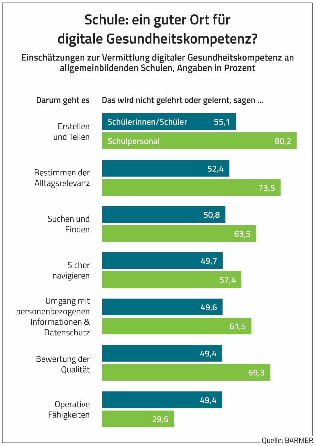 Zwischen 30 und 80 Prozent des befragten Schulpersonals geben den Befragungsergebnissen zufolge an, dass verschiedene Aspekte der digitalen Gesundheitskompetenz in der Schule nicht oder kaum gelehrt werden.