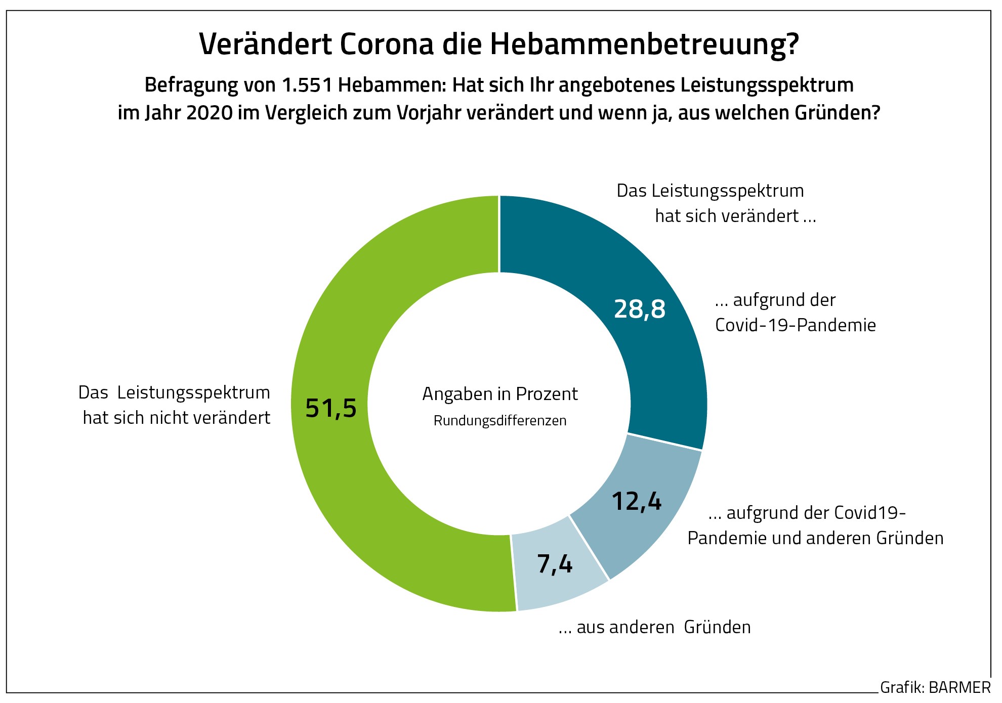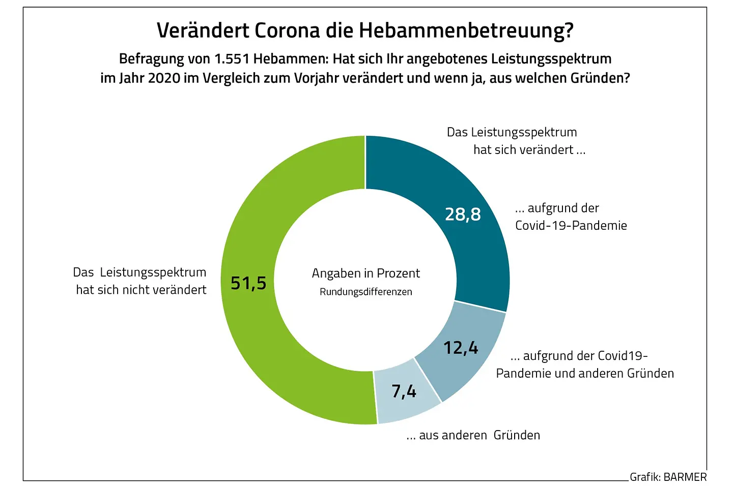 - Umfang der Befragung: Für die Befragung wurden über 18.000 Barmer-versicherte Frauen angeschrieben, die zwischen Mai und November 2020 geboren haben. Neben 1.821 Frauen nutzen auch 1.551 Hebammen die Gelegenheit, sich an der Umfrage zu beteiligen. Die Hebammen wurden durch den Deutschen Hebammenverband und die Hochschule für Gesundheit zu der Befragung eingeladen.