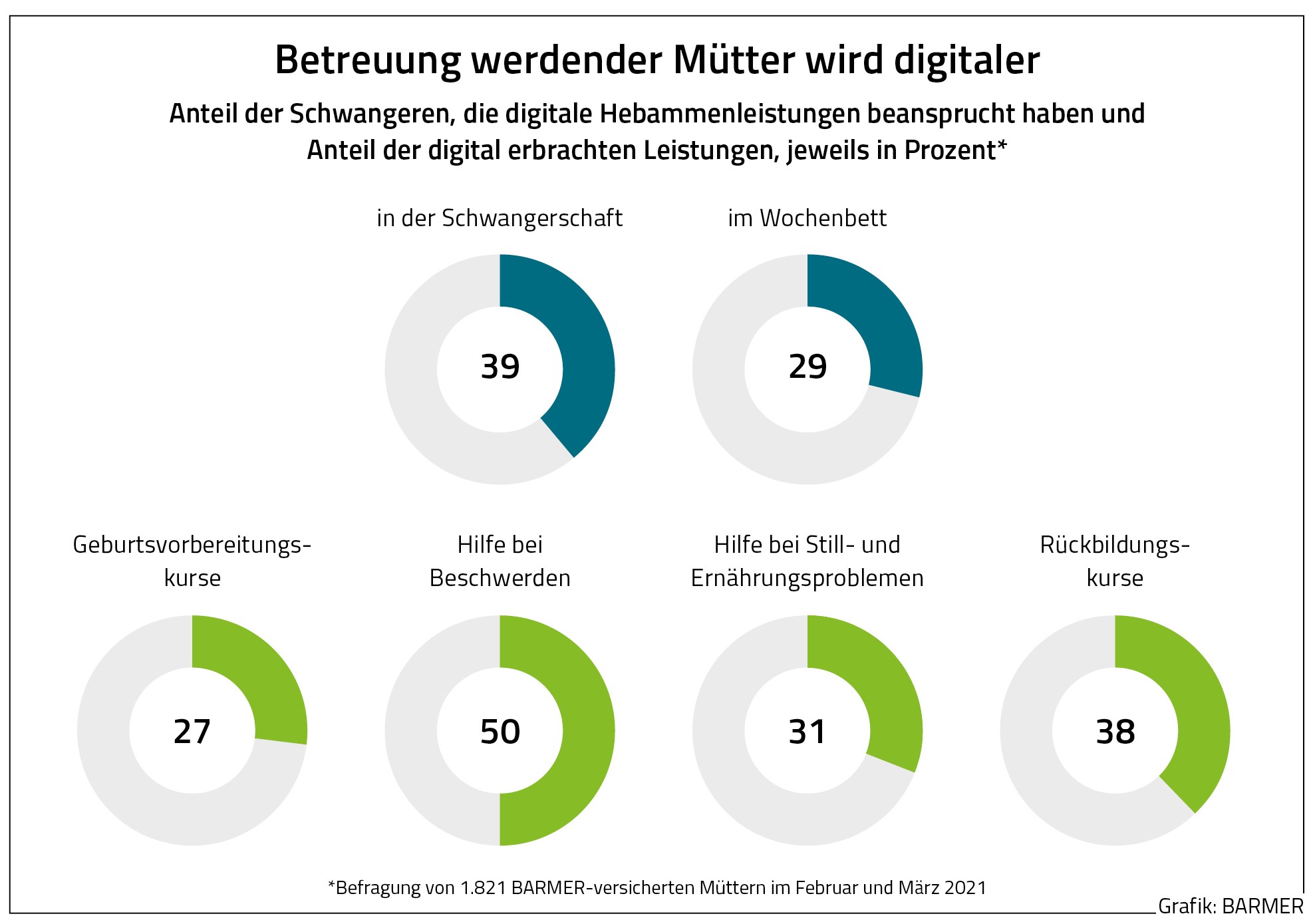 Die Corona-Pandemie habe, so zeige die Befragung, das Leistungsangebot der Hebammen erweitert. „Rund zwei Drittel der Hebammen schafften Geräte wie Webcams, Headsets oder Computer an, um ihre Leistungen digital anbieten zu können. Dies geschah in sehr kurzer Zeit und stellte die Hebammen aber auch vor Herausforderungen bezüglich Finanzierung, Technik und Datenschutz“, sagt Jahn-Zöhrens. Wie die befragten Frauen sähen auch die befragten Hebammen Wege- und Zeitersparnis als klare Vorteile der Digitalangebote. Das ermögliche unter anderem auch, mehr Frauen zu betreuen. Schwangere wie Hebammen sähen die digitale Hebammenbetreuung in der Schwangerschaft und im Wochenbett als sinnvolle Ergänzung zum persönlichen Kontakt. Der Ausbau der digitalen Betreuung dürfe aber nicht zu Lasten der aufsuchenden Betreuung gehen. „Die Corona-Pandemie hat sich auch in der Betreuung Schwangerer als Treiber der Digitalisierung erwiesen. Kassen und Hebammenverbände haben schnell gute Lösungen im Sinne der Schwangeren gefunden. Daraus wurden gute Erfahrungen gewonnen und Hemmschwellen abgebaut, was letztlich den Schwangeren und Hebammen gleichermaßen hilft“, resümiert Barmer-Vorstandschef Straub.