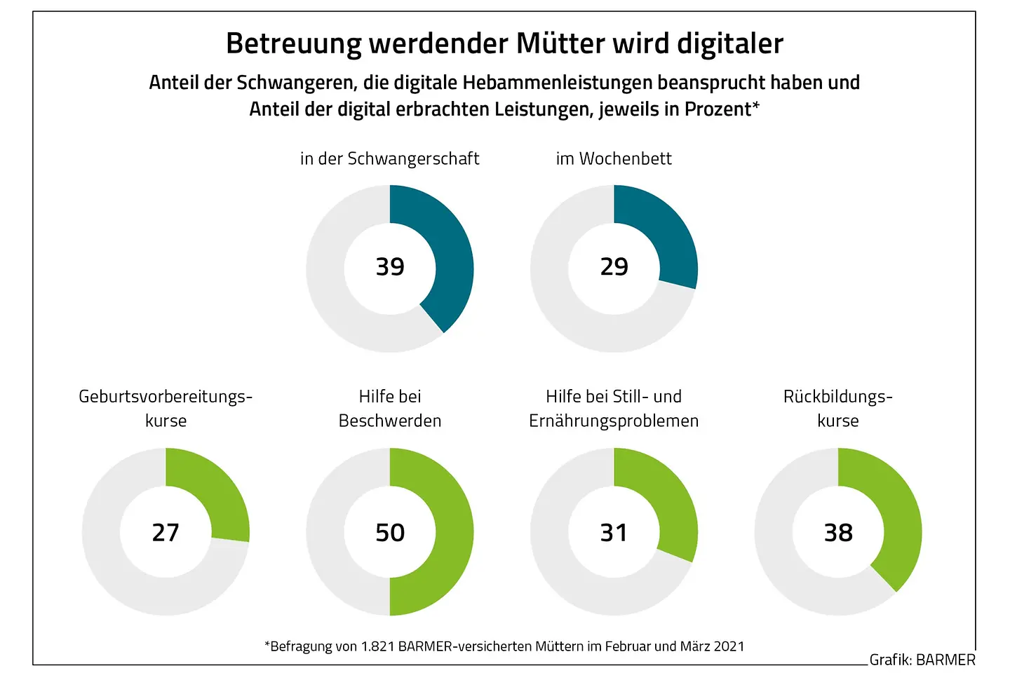 Berlin, 30. September 2021 – Die Betreuung Schwangerer durch Hebammen mithilfe digitaler Technik hat sich in der Pandemie gut bewährt. Das zeigt ein aktueller Forschungsbericht der Hochschule für Gesundheit in Bochum in Kooperation mit dem Barmer Institut für Gesundheitssystemforschung und dem Deutschen Hebammenverband. Darin wurden erstmals das Angebot und die Akzeptanz digitaler Hebammenbetreuung in einer großen Befragungsstudie untersucht. Befragt wurden Barmer-versicherte Frauen, die zwischen Mai und November 2020 geboren haben, und freiberuflich tätige Hebammen. Demnach beurteilt eine Mehrheit der Frauen, die digitale Hebammenversorgung in Anspruch genommen hat, solche Angebote mit „sehr gut“ (74,1 Prozent) und „gut“ (18,8 Prozent). „Wie vieles andere, hat Corona auch die bisher übliche Präsenzbetreuung werdender Mütter durch Hebammen aufgrund der Kontaktbeschränkungen erschwert. Wir freuen uns, dass sich die digitale Hebammenbetreuung als Ergänzung zum persönlichen Kontakt etabliert hat“, sagt Prof. Dr. Christoph Straub, Vorstandsvorsitzender der Barmer. Für die Studie seien Antworten von 1.821 Frauen und 1.551 Hebammen ausgewertet worden. Der GKV-Spitzenverband und die Berufsverbände der Hebammen hatten schnell auf die Pandemiebedingungen reagiert und schon im März 2020 die digitale Hebammenbetreuung ermöglicht.