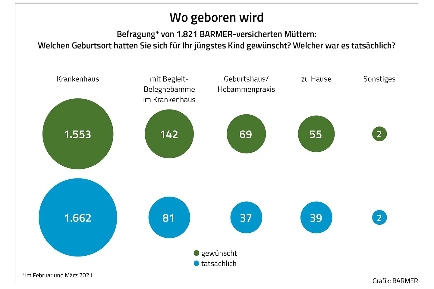- Frauen können den Geburtsort wählen. Der gewünschte Geburtsort kann aber aus verschiedenen Gründen nicht immer realisiert werden. In Deutschland werden die meisten Kinder im Krankenhaus geboren. Im Jahr 2020 kamen laut der Gesellschaft für Qualität in der außerklinischen Geburtshilfe 13.969 Kinder außerhalb der Klinik zur Welt, das sind 1,8 Prozent.