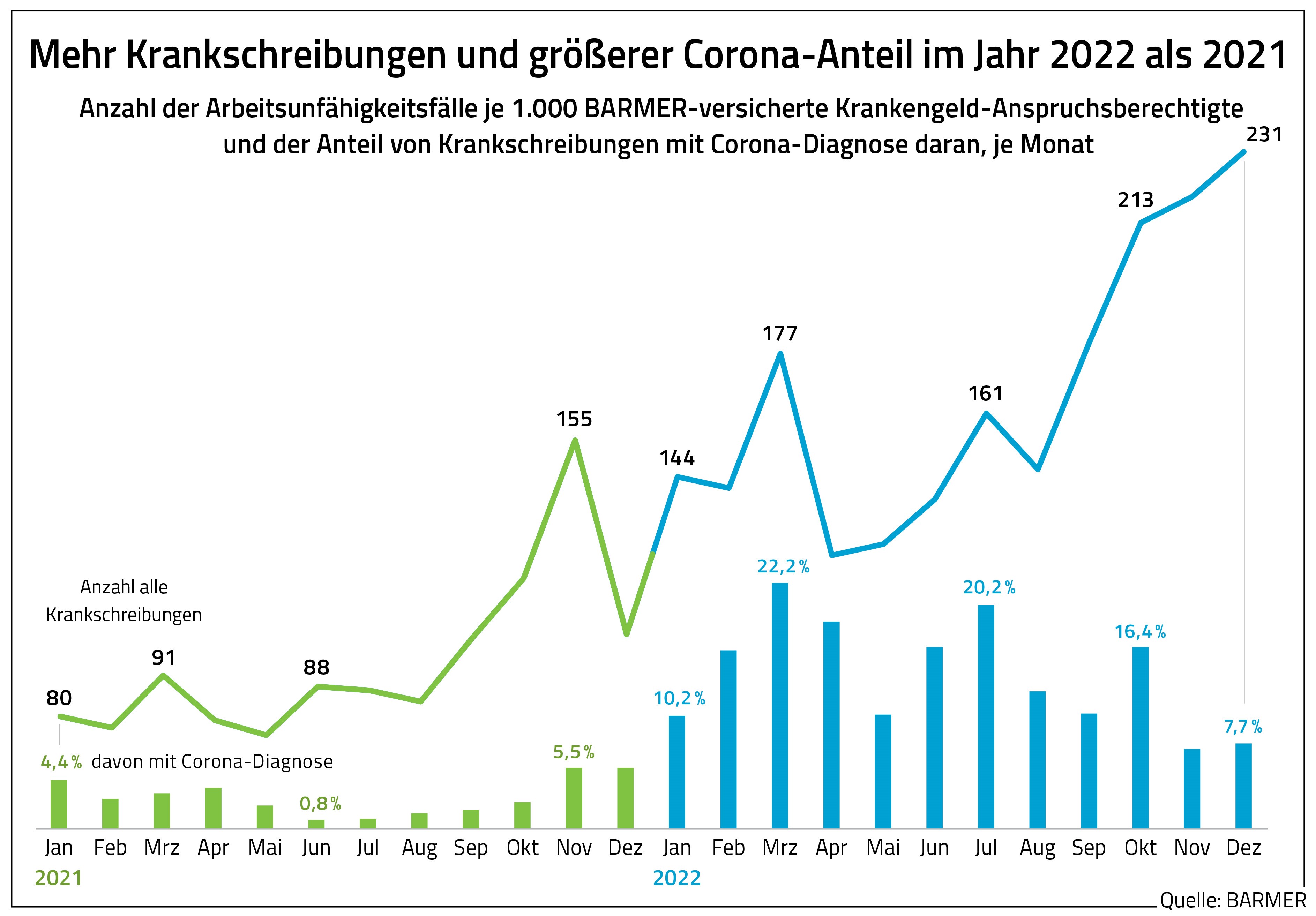 Berlin, 21. Februar 2023 – Im vergangenen Jahr gab es bei Barmer-versicherten Beschäftigten jeden Monat mehr Krankschreibungen als im jeweiligen Vorjahresmonat. Das geht aus einer aktuellen Analyse des Barmer Instituts für Gesundheitssystemforschung (bifg) hervor. Im Dezember 2022 gab es demnach 231 Krankschreibungen je 1.000 Versicherte mit Krankengeldanspruch. Das sind mehr als doppelt so viele wie im Dezember 2021 mit 102 Krankschreibungen je 1.000 Arbeitnehmer. Den höchsten Wert im Jahr 2021 gab es im November mit 155 Arbeitsunfähigkeitsfällen je 1.000 Versicherte mit Anspruch auf Krankengeld.
