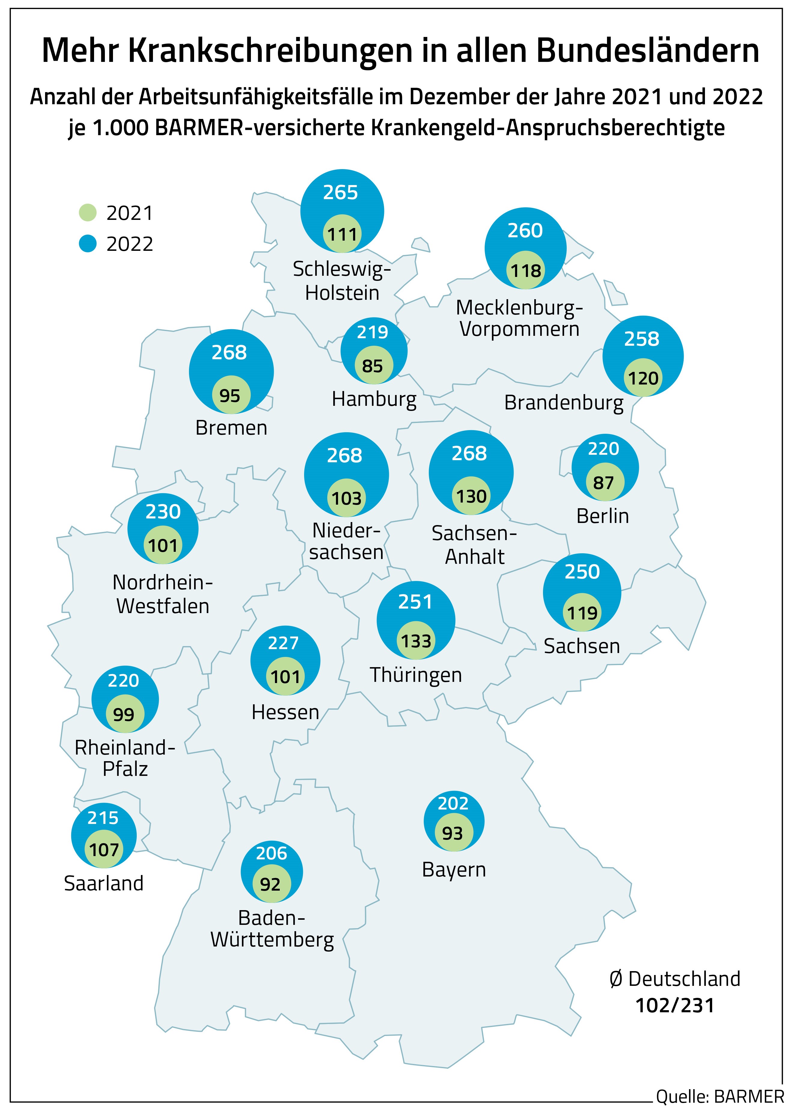 Laut der Barmer-Analyse gab es in den Jahren 2021 und 2022 deutliche regionale Unterschiede bei den Krankschreibungen. Während im Dezember vergangenen Jahres in Sachsen-Anhalt 268 Krankschreibungen je 1.000 Anspruchsberechtigte vorlagen, waren es in Bayern nur 202 je 1.000 Anspruchsberechtigte. Damit lag der Wert jeweils mehr als doppelt so hoch wie im Dezember 2021 mit 130 beziehungsweise 93 Arbeitsunfähigkeiten je 1.000 möglichen Krankengeldbeziehenden.