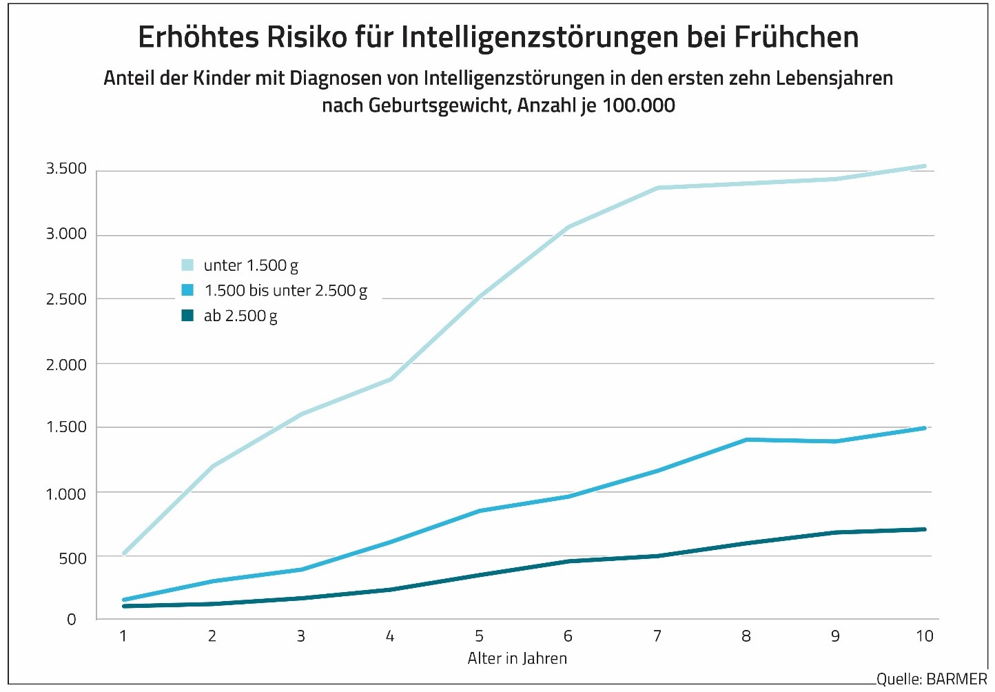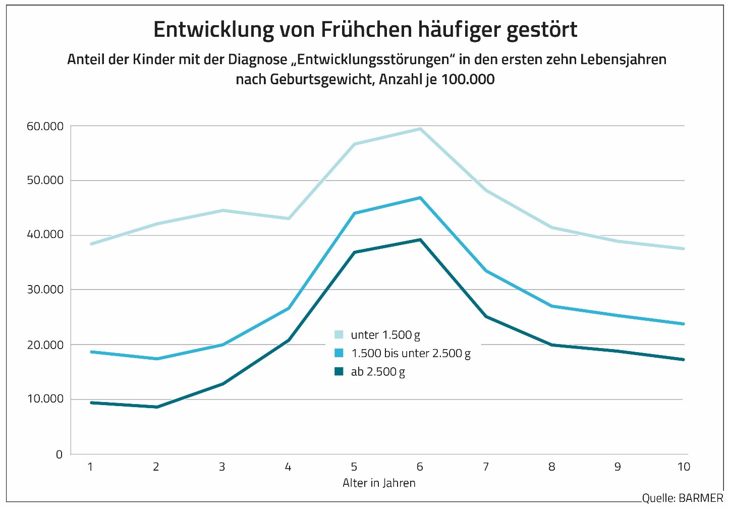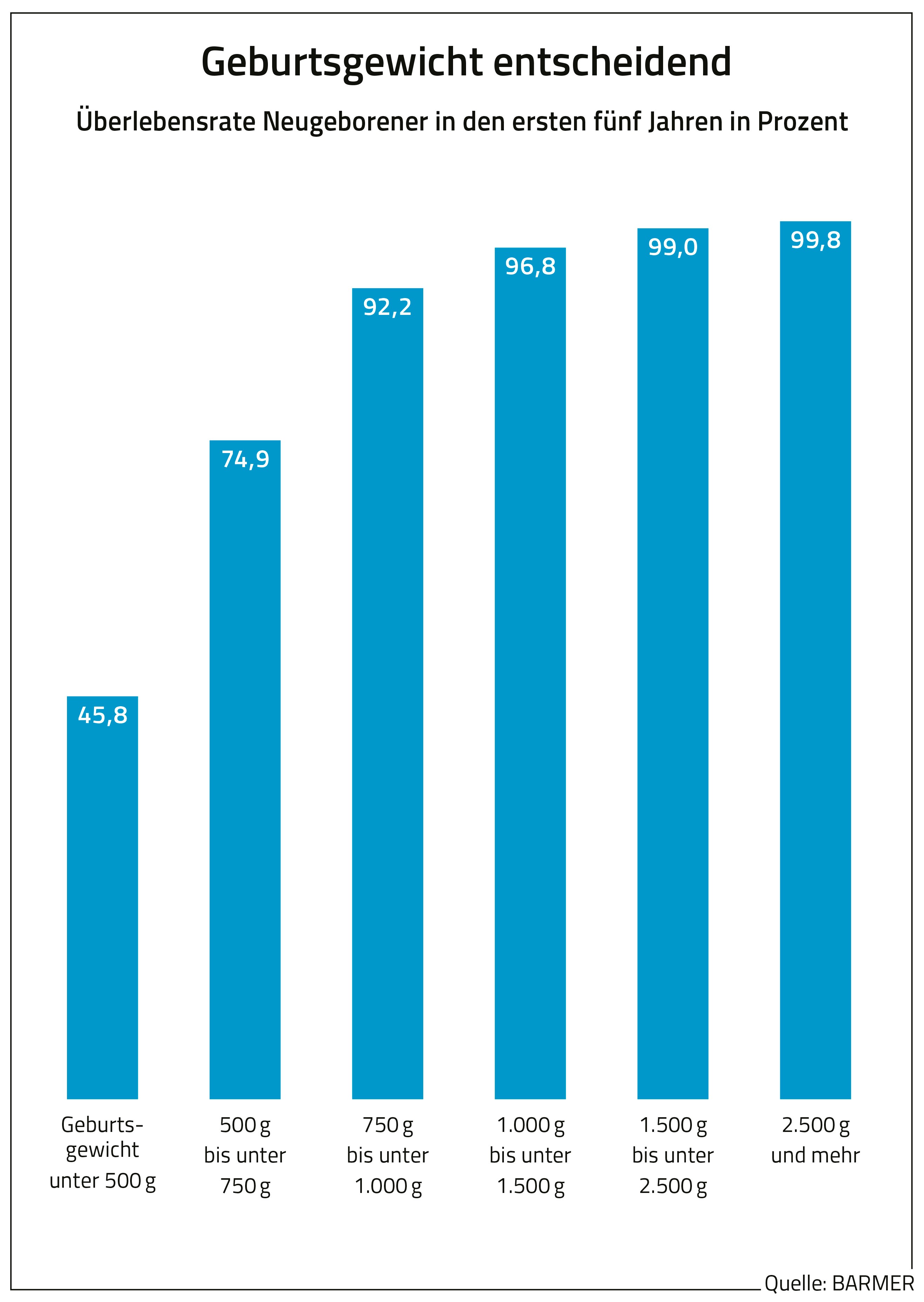 Im Barmer-Arztreport wurden ebenfalls die Überlebenschancen Neugeborener untersucht. Von den Kindern mit einem Geburtsgewicht unter 500 Gramm überlebten lediglich 45,8 Prozent die ersten fünf Lebensjahre. Bei einem Gewicht von 750 bis 999 Gramm waren es bereits 92,2 Prozent. Ab 2.500 Gramm Geburtsgewicht lag die Fünf-Jahres-Überlebensrate bei 99,8 Prozent. „Die Säuglings- und Kleinkindersterblichkeit in Deutschland ist glücklicherweise gering. Dennoch zeigt die Analyse, welche zentrale Rolle das Geburtsgewicht für die Überlebens- und Entwicklungschancen von Frühchen spielt“, sagt Straub. Es hänge vor allem von der Dauer der Schwangerschaft ab. Sie beeinflusse darüber hinaus auch die Reife des frühgeborenen Kindes und damit dessen Chance, zu überleben. Ein sehr früh geborenes und damit unreifes Kind habe bei identischem Geburtsgewicht schlechtere Überlebenschancen als ein später geborenes reiferes, da einzelne Organsysteme wie etwa die Lunge noch nicht voll ausgebildet seien.