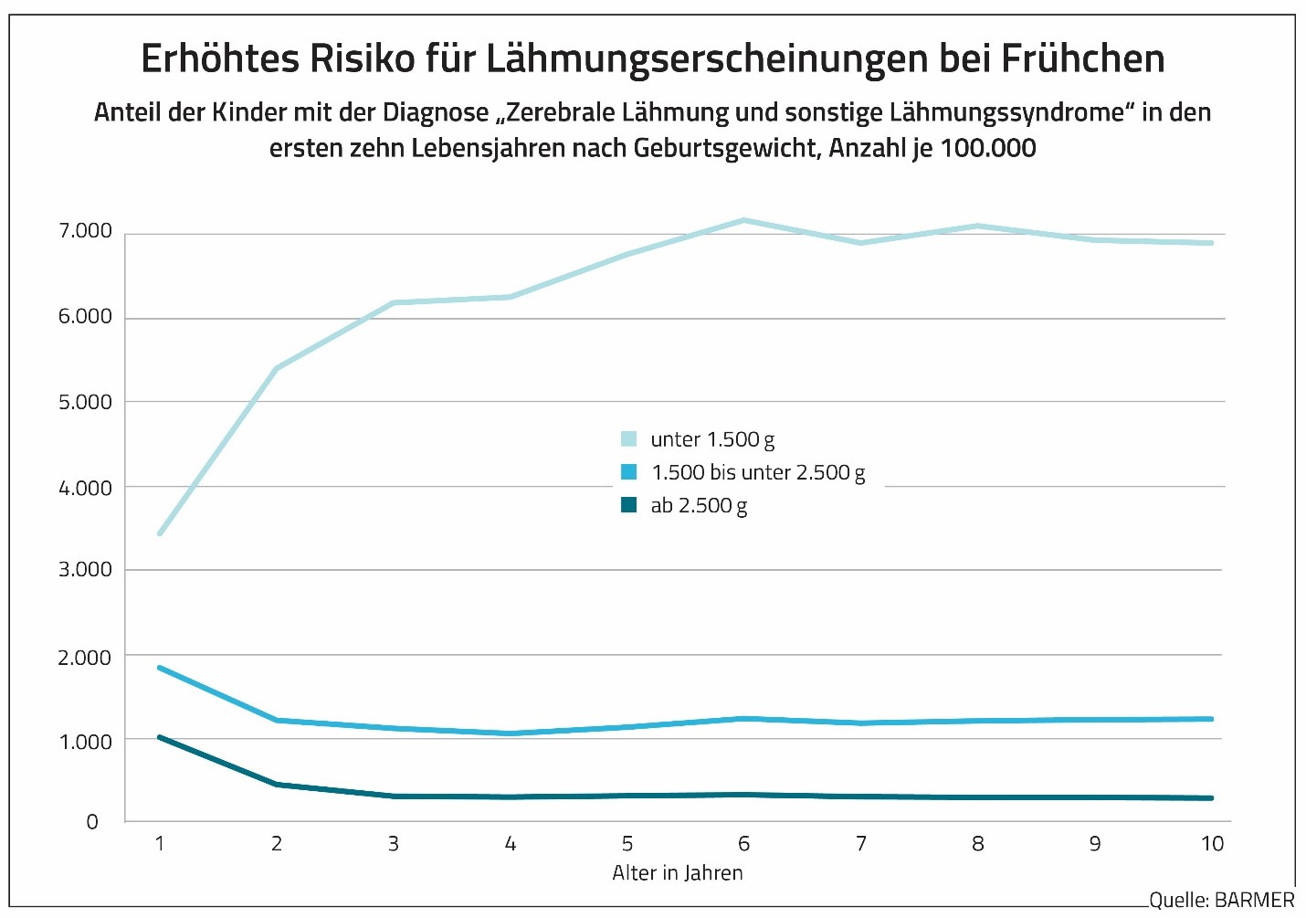 Berlin, 16. Juni 2023 – Frühgeborene mit niedrigem Geburtsgewicht haben häufiger Gesundheits- und Entwicklungsstörungen als Kinder, die mit normalem Gewicht geboren werden. Ein erheblicher Teil der Probleme wird erst in späteren Lebensjahren offensichtlich. Das zeigt eine aktuelle Analyse des Barmer-Arztreports. Dabei wurden Daten von rund 274.000 Kindern ausgewertet, die zwischen den Jahren 2006 und 2011 zur Welt kamen. „Die moderne Geburtsmedizin gibt heute frühgeborenen Kindern gute Überlebenschancen. Allerdings leiden Frühchen häufig auch später an Gesundheitsbeeinträchtigungen. Deshalb ist es wichtig, betroffene Kinder frühzeitig zu unterstützen“, sagt Prof. Dr. med. Christoph Straub, Vorstandsvorsitzender der Barmer. Frühgeborene Kinder mit einem Geburtsgewicht unter 1.500 Gramm wiesen gegenüber Normalgewichtigen nach fünf Jahren ein um 53,6 Prozent erhöhtes Risiko einer Beeinträchtigung oder Verzögerung der sprachlichen oder motorischen Entwicklung auf. Hier könnten zunächst die Physiotherapie oder etwas später die Logopädie oder Ergotherapie unterstützen. Zudem würden bei diesen Frühchen nach zehn Jahren kognitive Störungen fünfmal häufiger diagnostiziert als bei Kindern mit normalem Geburtsgewicht. Die Möglichkeit zerebraler Lähmungen, die zu Bewegungsstörungen führten, seien um mehr als den Faktor 20 erhöht.