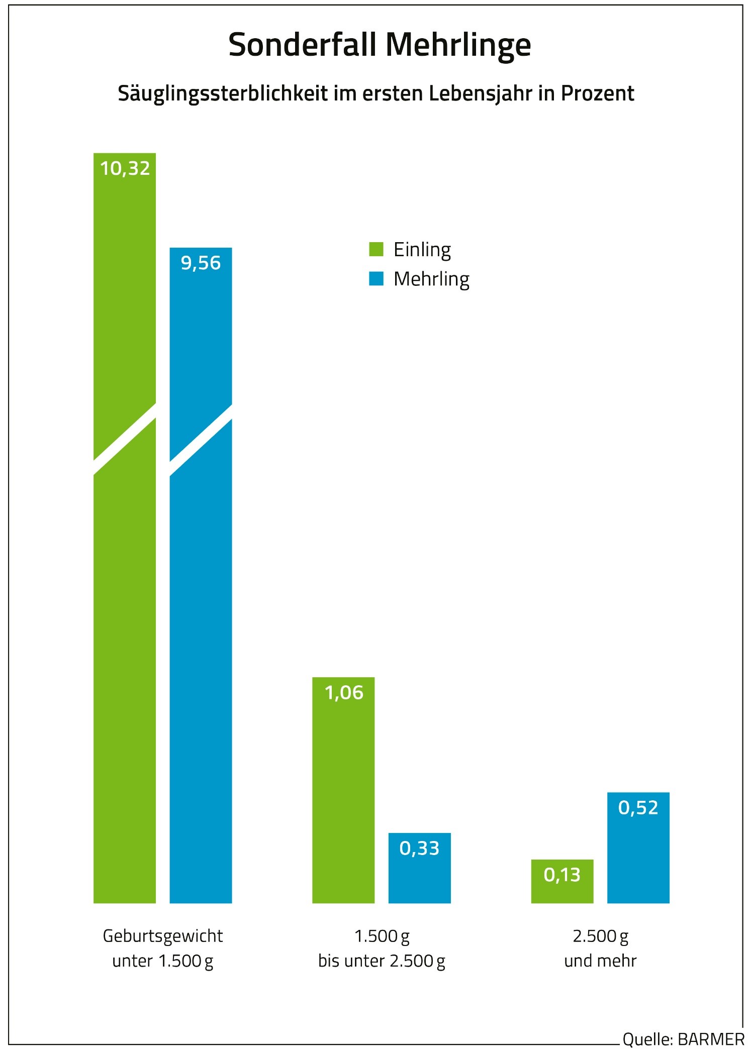 Das Sterblichkeitsrisiko zu früh geborener Kinder hängt laut der Analyse des Arztreports darüber hinaus stark davon ab, ob sie aus einer Mehrlingsschwangerschaft stammen. So hatten Mehrlinge mit einem Geburtsgewicht ab 2.500 Gramm gegenüber allein im Mutterleib herangewachsenen Kindern gleichen Gewichts ein etwa vierfach höheres Sterberisiko. Bessere Überlebenschancen hätten dagegen leichtere Mehrlinge mit einem Gewicht von 1.500 bis 2.499 Gramm. Bei ihnen sei das Sterblichkeitsrisiko lediglich um das Zweieinhalbfache erhöht. „Bei Zwillingen gilt ein Geburtsgewicht um 2.400 Gramm als normal, bei Drillingen sind es sogar nur knapp 2.000 Gramm. Das dürfte einen Grund für die vergleichsweise niedrige Sterblichkeit in dieser Gewichtsgruppe darstellen“, so Straub.