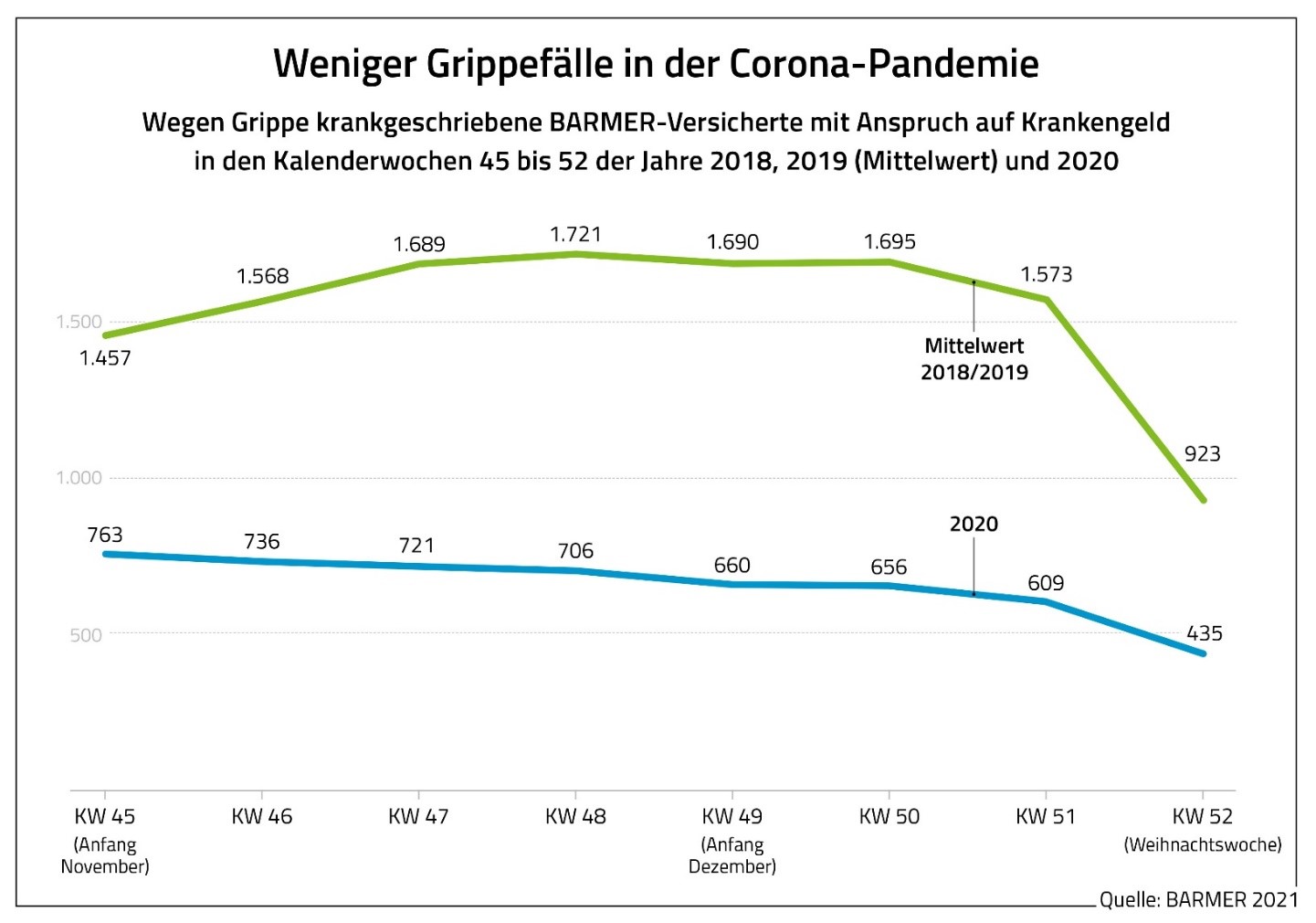 Berlin, 2. Februar 2021 – In der Corona-Pandemie hat sich die Zahl der Krankschreibungen wegen Grippe mehr als halbiert. Das geht aus einer Auswertung der Barmer hervor. Demnach waren zwischen November und Weihnachten der Jahre 2018 und 2019 durchschnittlich 923 bis 1.721 Barmer-Versicherte pro Woche wegen Influenza krankgeschrieben. Im selben Zeitraum des Jahres 2020 waren im Mittel lediglich 661 Personen pro Woche wegen einer Grippe arbeitsunfähig. Teilweise lagen die wöchentlichen Rückgänge sogar bei mehr als 60 Prozent. Auch nach Angaben des Robert Koch-Instituts ist die Grippe aktuell kaum spürbar. „Die Grippe spielt zu Beginn dieses Jahres bisher eine sehr geringe Rolle. Die Abstand- und Hygieneregeln zum Schutz vor Corona senken offensichtlich auch das Influenzarisiko“, sagt Dr. Ursula Marschall, Leitende Medizinerin bei der Barmer. Dies sei ein positiver und immens wichtiger Effekt. Denn je weniger schwere Grippe-Fälle es gebe, desto mehr der dringend erforderlichen Kapazitäten blieben den Krankenhäusern, um Corona-Kranke zu versorgen. Nun gelte es, nicht nachzulassen und die Abstands- und Hygieneregeln weiterhin konsequent einzuhalten.