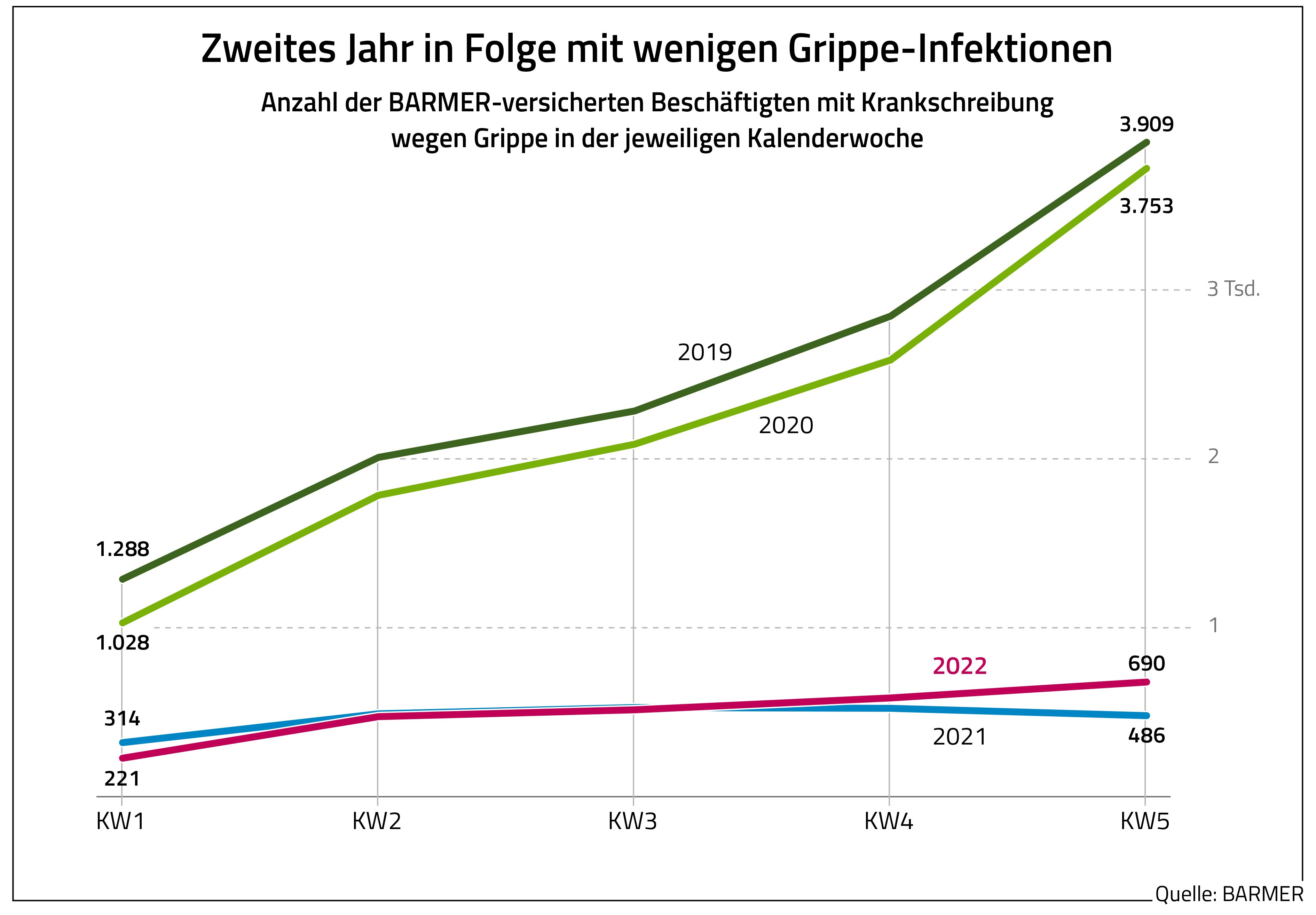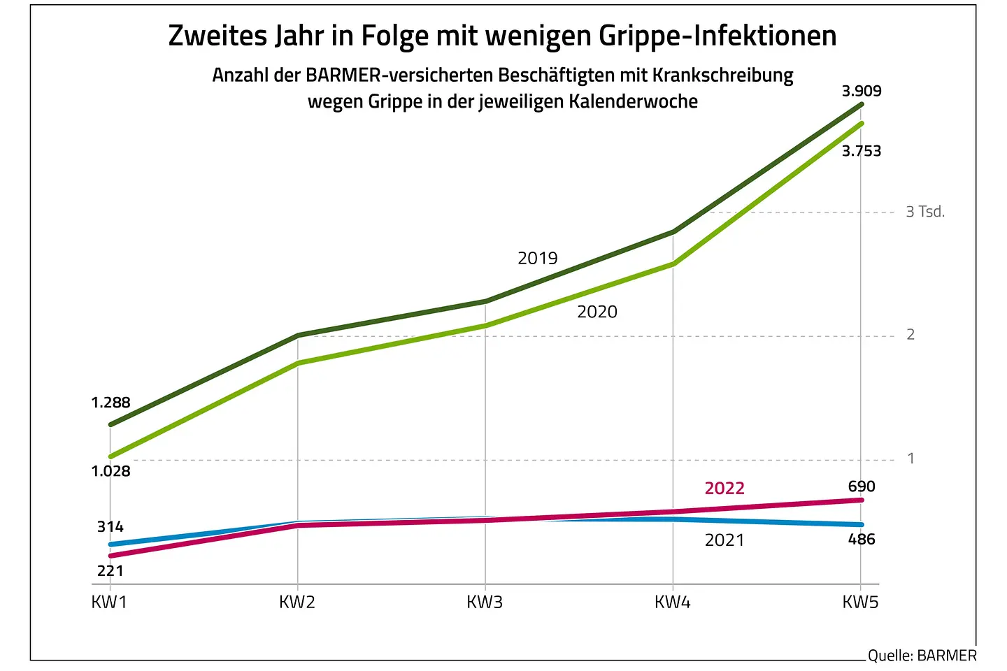 Berlin, 14. März 2022 – Die Grippewelle fällt voraussichtlich im zweiten Jahr in Folge aus. Zu diesem Ergebnis kommt eine aktuelle Auswertung des Barmer Instituts für Gesundheitssystemforschung unter Barmer-versicherten Erwerbstätigen. Demnach waren in der fünften Kalenderwoche dieses Jahres (30. Januar bis 5. Februar) 690 Krankengeld-Anspruchsberechtigte wegen Influenza arbeitsunfähig und im Jahreszeitraum zuvor rund 490 Personen. In den Jahren 2018 bis 2020 lag die Zahl der Krankschreibungen in der fünften Kalenderwoche zwischen 3.750 und 5.960 Betroffenen. „Anfang Februar gab es 85 Prozent weniger Grippekranke als in den Jahren 2018 bis 2020. Da die Grippewelle jetzt schon zum zweiten Mal ausfällt, gerät die Bevölkerung mit dem Influenzavirus weniger in Kontakt. Deshalb wird die Grippeschutzimpfung vor allem im kommenden Herbst wichtig, da das Immunsystem nun über zwei Jahre weniger trainiert wurde“, sagt Prof. Dr. Christoph Straub, Vorstandsvorsitzender der Barmer. Die Grippewelle starte normalerweise im November und erreiche ihren Höhepunkt im Februar und März, bevor sie wieder stark abflaue. Im Jahr 2018 habe es bis zu 22.000 Barmer-versicherte Grippe-Erkrankte in einer Woche gegeben. Derzeit spreche nichts dafür, dass es auch nur zu annähernd hohen Fallzahlen in den folgenden Wochen komme.