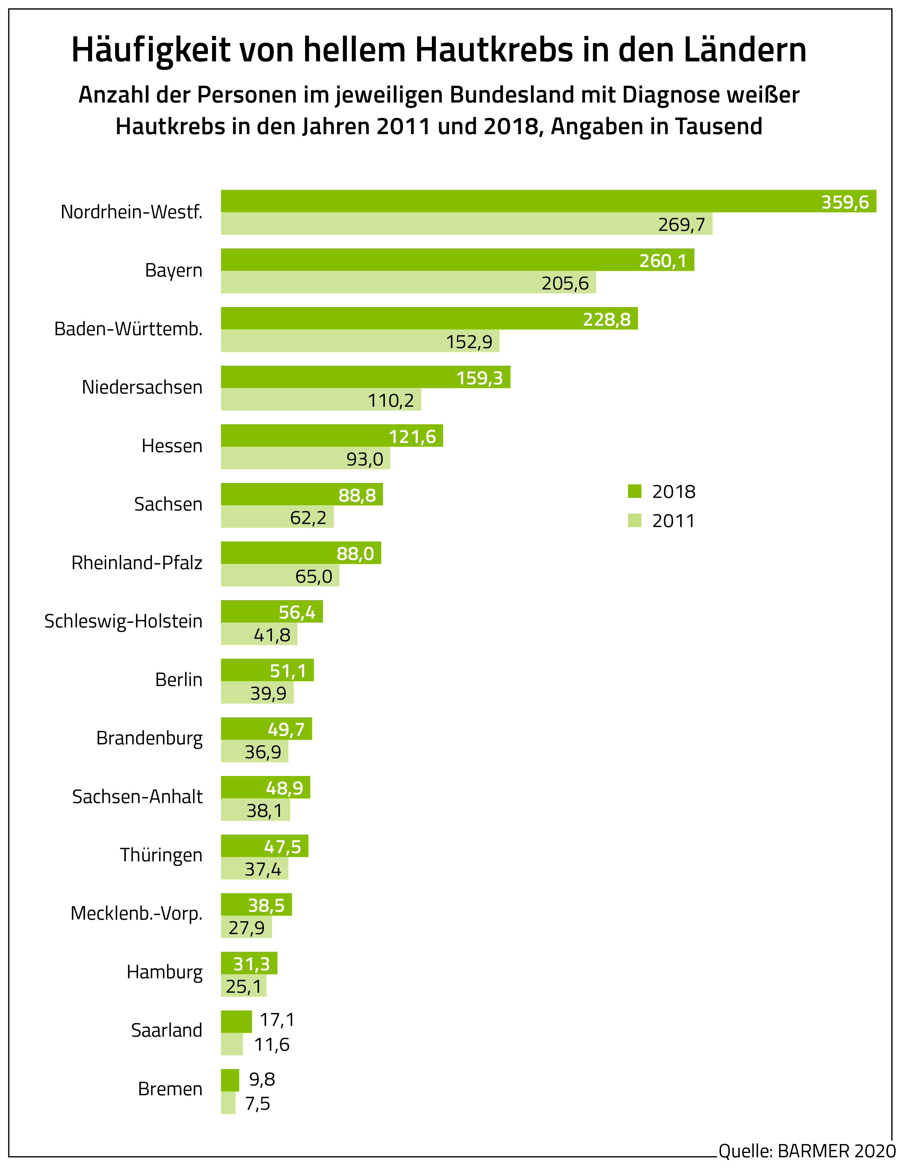 Die Fallzahlen beim hellen Hautkrebs seien im Betrachtungszeitraum 2011 bis 2018 mit dem Plus von 35 Prozent schneller gestiegen als bei schwarzem Hautkrebs. Hier habe sich die Fallzahl im selben Zeitraum um 24,7 Prozent von rund 300.000 auf 374.000 Personen erhöht. Zudem gebe es massive regionale Unterschiede beim Auftreten des hellen Hautkrebses. Während Baden-Württemberg zwischen den Jahren 2011 und 2018 einen Anstieg um 49,6 Prozent von 152.900 auf 228.800 Patienten verzeichnete, betrug das Plus in Hamburg 24,7 Prozent, und zwar von 25.100 auf 31.300 Betroffene. „Dass die Anzahl der Hautkrebspatienten in manchen Bundesländern so stark gestiegen ist und in anderen deutlich weniger, ist rein medizinisch nicht zu erklären“, so Petzold. Unterschiede bei der jeweiligen Sonneneinstrahlung und UV-Belastung könnten dabei ebenso wie die unterschiedliche Inanspruchnahme der Hautkrebs-Früherkennung eine Rolle spielen.
