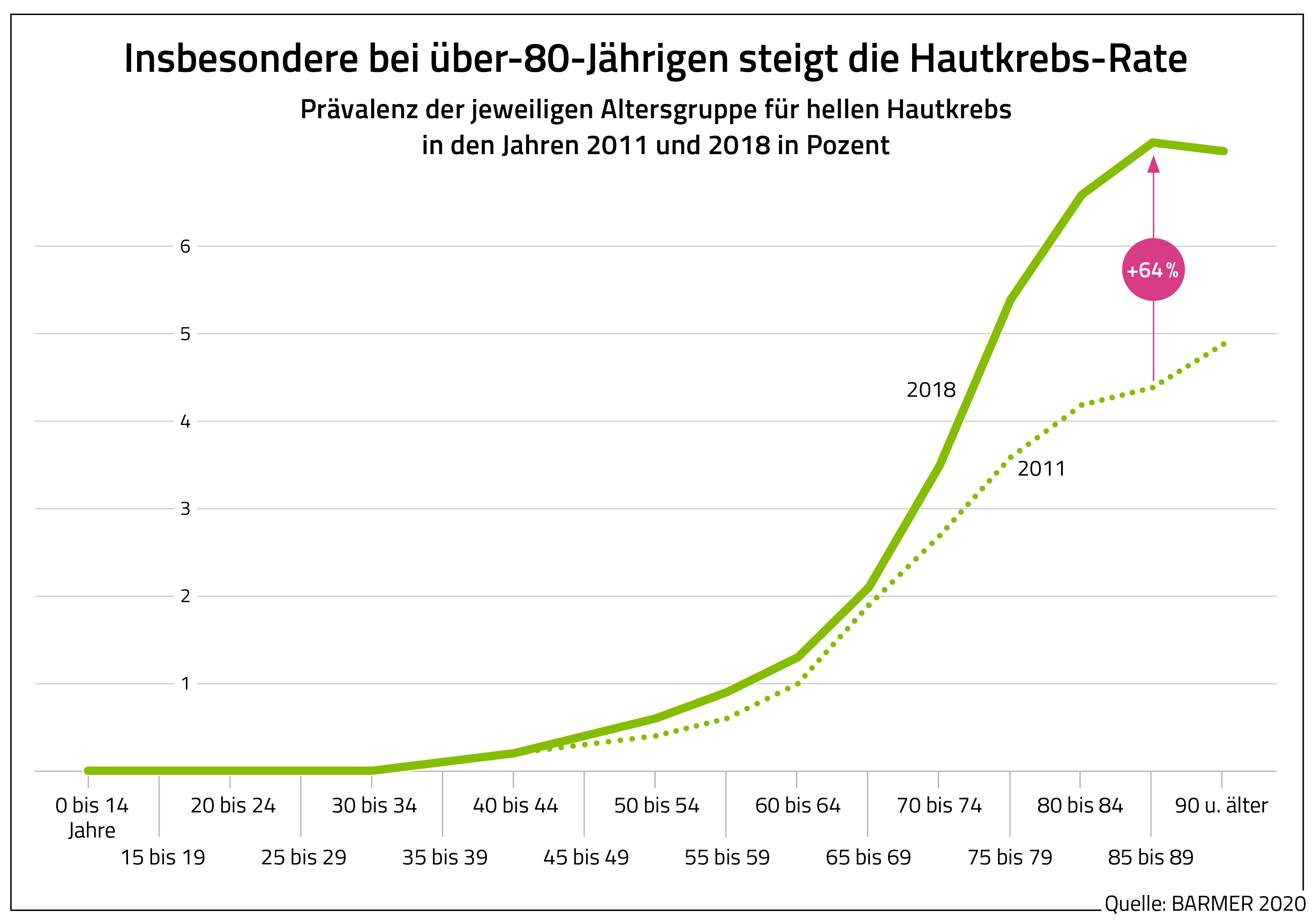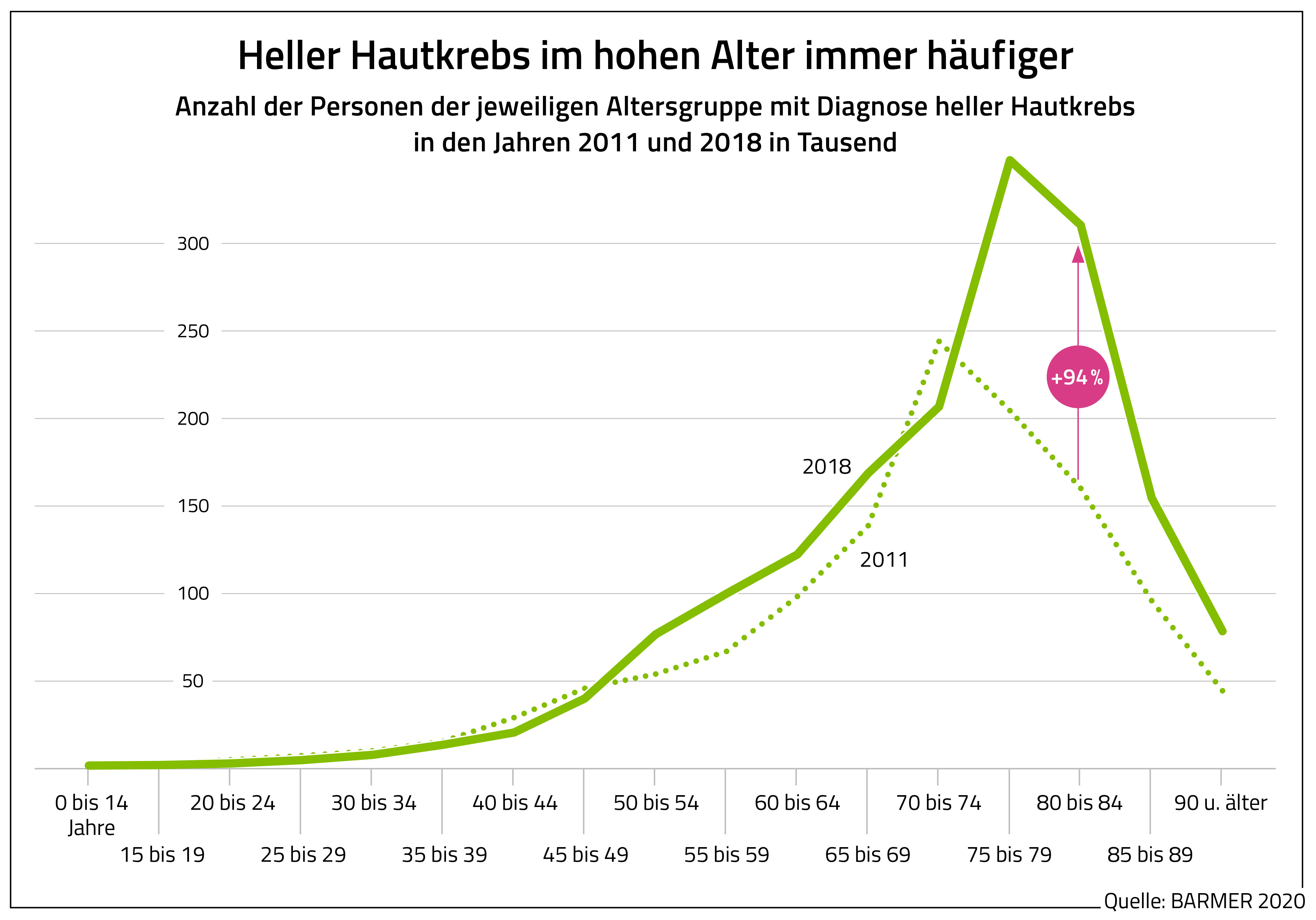 Berlin, 9. September 2020 – Immer mehr Menschen in Deutschland erhalten die Diagnose heller Hautkrebs. Zwischen den Jahren 2011 und 2018 erhöhten sich die Betroffenenzahlen um 35 Prozent von rund 1,23 Millionen auf 1,66 Millionen. Das geht aus einer aktuellen Barmer-Analyse hervor, die die Kasse anlässlich des europäischen Tags des Hautkrebses (13. September) angefertigt hat. In den Jahren 2017 und 2018 sind die Fallzahlen nur noch geringfügig gestiegen, und zwar um 2,1 beziehungsweise 1,9 Prozent. „In Deutschland scheint die Zahl der Personen mit hellem Hautkrebs inzwischen auf sehr hohem Niveau zu stagnieren. Das ist zwar eine positive Tendenz. Dennoch bleiben die Fallzahlen viel zu hoch angesichts dessen, dass sich keine andere Krebsart so leicht vermeiden lässt wie Hautkrebs“, betonte Dr. Utta Petzold, Dermatologin bei der Barmer. Ohne entsprechenden Schutz sollte sich niemand zu lange in der Sonne aufhalten. Petzold: „Die Haut vergisst keinen einzigen Sonnenstrahl.“