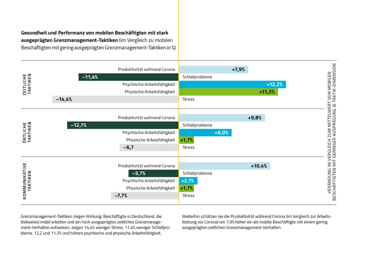 Denn das Homeoffice ist für viele Arbeitnehmerinnen und Arbeitnehmer eine völlig neue Herausforderung, nicht nur für ihre sozialen Beziehungen, sondern auch für ihre Arbeitsprozesse. „Mitarbeiterinnen und Mitarbeiter müssen Eigenverantwortung für ihre Zeiteinteilung übernehmen. Wer keine klaren Grenzen setzt, kann in der Freizeit schlecht abschalten und leidet schnell unter Stress“, betont Prof. Dr. Stephan Alexander Böhm, Professor für Diversity Management und Leadership an der Universität St. Gallen. Die Studie zeigt: Beschäftigte in Deutschland, die (teilweise) mobil arbeiten und den Arbeitstag zeitlich gut abgrenzen, haben 14,4 Prozent weniger Stress, 11,4 Prozent weniger Schlafprobleme, eine um 11,3 Prozent gesteigerte physische und um 12,2 Prozent höhere psychische Arbeitsfähigkeit.