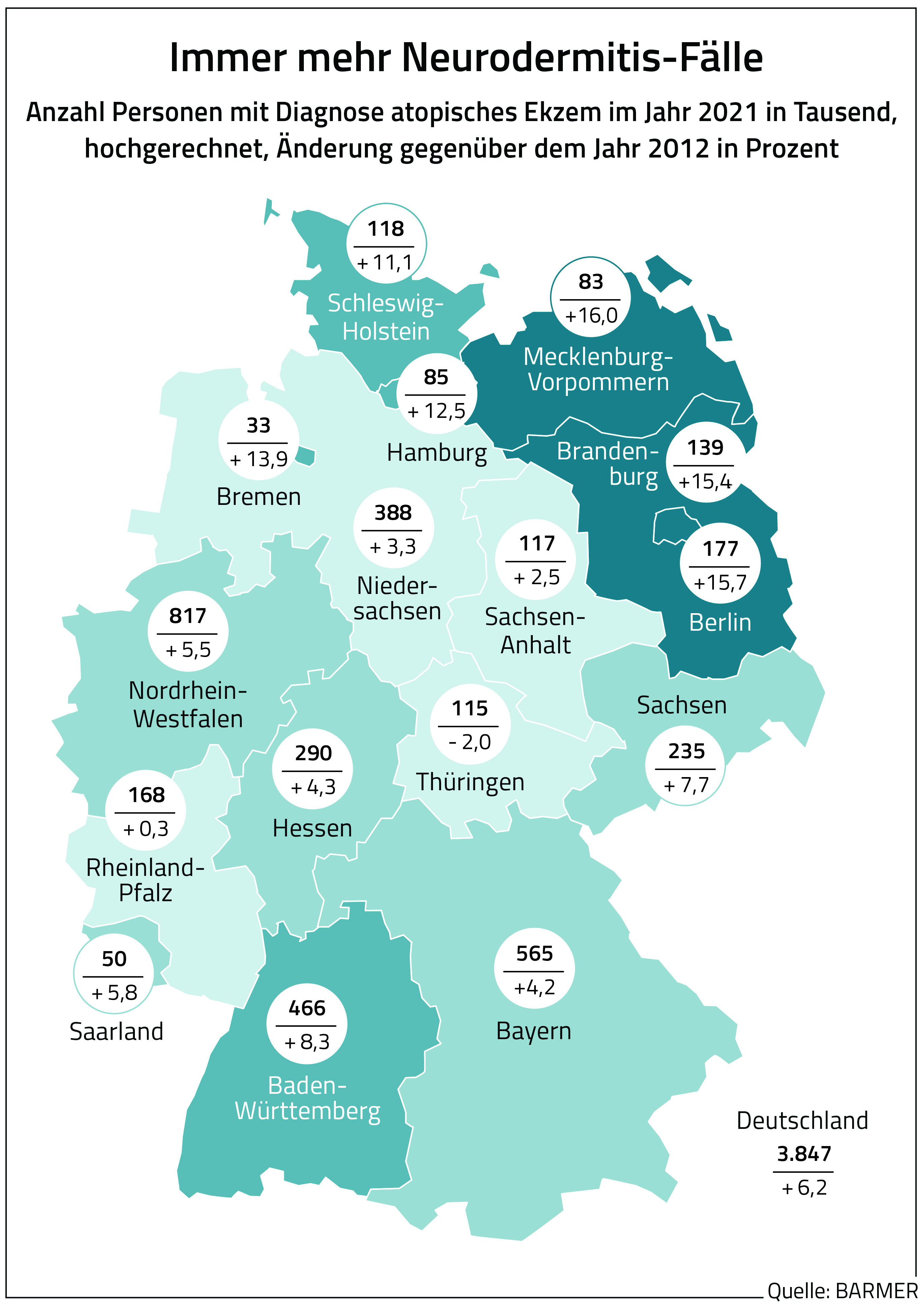 Berlin, 14. Juli 2023 – Immer mehr Menschen in Deutschland bekommen Neurodermitis diagnostiziert. Das zeigt eine aktuelle Analyse des BARMER Instituts für Gesundheitssystemforschung mit Daten aus den Jahren 2012 bis 2021. Demnach stieg die Zahl der Betroffenen bundesweit von rund 3,6 Millionen auf knapp 3,8 Millionen. Den größten Anstieg verzeichnet Mecklenburg-Vorpommern mit einem Plus von 16 Prozent und einem Anstieg der Betroffenenzahl von rund 72.000 auf 83.500. „Unsere ambulanten Arztdaten zeigen, dass die Zahl der an Neurodermitis Erkrankten in einigen Bundesländern deutlich ansteigt. Die Ursachen dafür müssen eingehender untersucht werden, um auslösenden Faktoren nach Möglichkeit besser im Vorfeld begegnen zu können. Denn die Erkrankung schränkt die Betroffenen häufig stark in ihrer Lebensqualität ein“, sagt Prof. Dr. med. Christoph Straub, Vorstandsvorsitzender der BARMER.