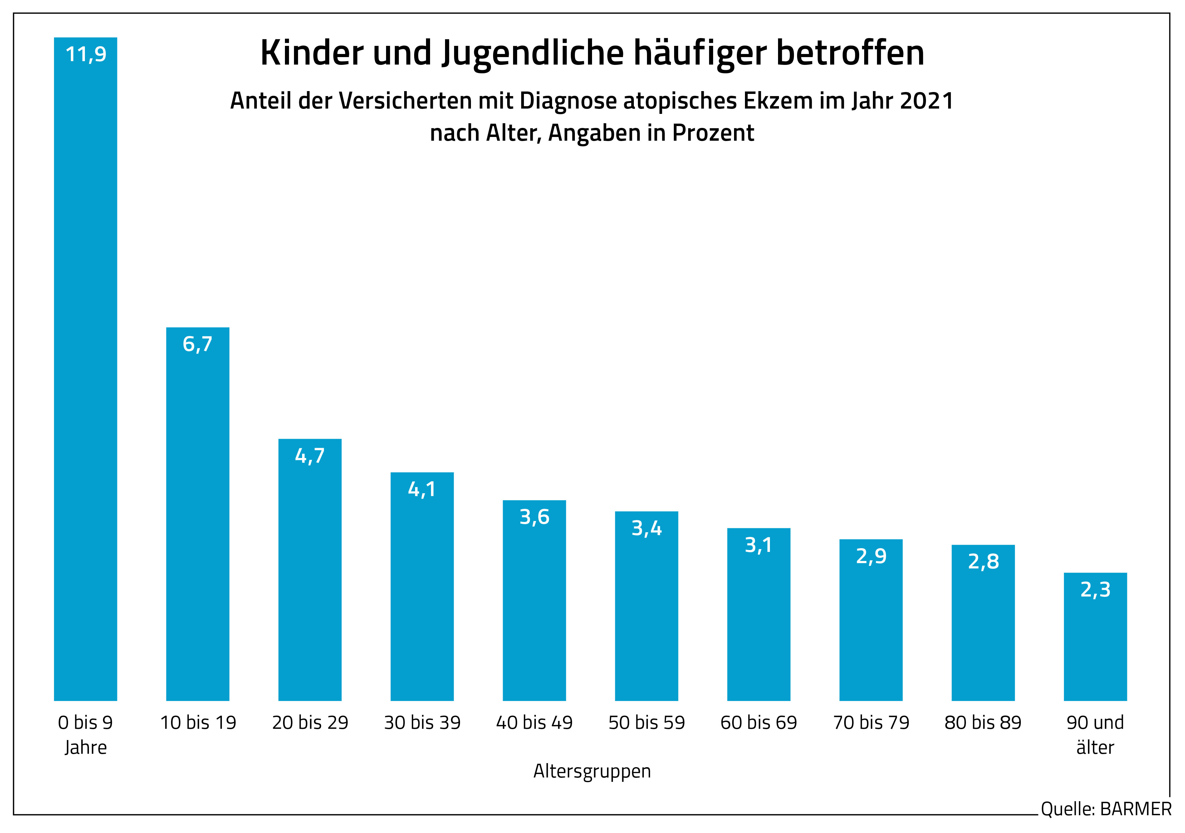 Laut der BARMER-Auswertung verteilen sich die Neurodermitis-Diagnosen auch stark nach Alter. Am häufigsten sind Kinder bis neun Jahre betroffen, von denen 11,9 Prozent die Diagnose Neurodermitis erhalten. Auf sie folgt die Gruppe der 10- bis 19-Jährigen mit einem Anteil von 6,7 Prozent. Ab dem 20. Lebensjahr sinkt die Betroffenenrate stetig bis auf ein Niveau von unter drei Prozent. „Neurodermitis wird vor allem bei Säuglingen, Kindern und Jugendlichen diagnostiziert. Das mag auch daran liegen, dass beim erstmaligen Auftreten die Symptome ärztlich abgeklärt werden wollen. Neurodermitis ist zwar nicht heilbar. Im Erwachsenenalter kommt es aber häufiger zu symptomfreien Phasen“, sagt Straub. Neurodermitis sei nicht ansteckend. Eines der schwerwiegendsten Symptome sei juckender Hautausschlag, der auch psychisch sehr belaste. Faktoren wie Rauchen, Umweltverschmutzung und übertriebene Hygiene könnten das Krankheitsbild verstärken. Im Jahr 2021 litten im Durchschnitt 5,2 Prozent der Frauen und 4,1 Prozent der Männer an der Hautkrankheit.