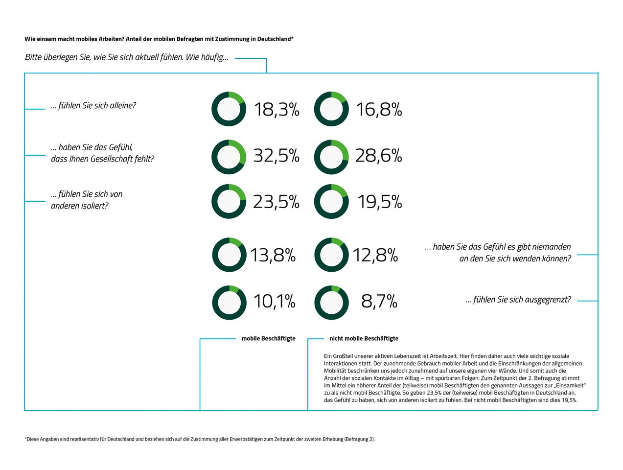 „18,3 Prozent der mobil Beschäftigten geben an, dass sie sich alleine fühlen. Ganzen 32,5 Prozent der Befragten fehlt Gesellschaft“, sagt Prof. Dr. Stephan Alexander Böhm, Professor für Diversity Management und Leadership an der Universität St. Gallen. Neben den Auswirkungen der Corona-Pandemie spielt vor allem die fehlende Inklusion in Teams eine Rolle. Den Eindruck, sich an niemanden wenden zu können, haben 13,8 Prozent der mobil Beschäftigten. 10,1 Prozent der Befragten fühlen sich sogar ausgegrenzt. Nicht nur Führungskräfte stehen deshalb in einer besonderen Verantwortung, den Austausch unter den Kolleginnen und Kollegen zu fördern. Auch Arbeitnehmende können selbst etwas für ihr Wohlbefinden tun: „Bewegung, beispielsweise in der Mittagspause, hilft, um Stress zu reduzieren und sich wieder zu fokussieren“, so Dr. Ulrike Körner, Leiterin des internen betrieblichen Gesundheitsmanagements bei der Barmer. Folgende Tipps wirken gegen die Einsamkeit im Arbeitsalltag: