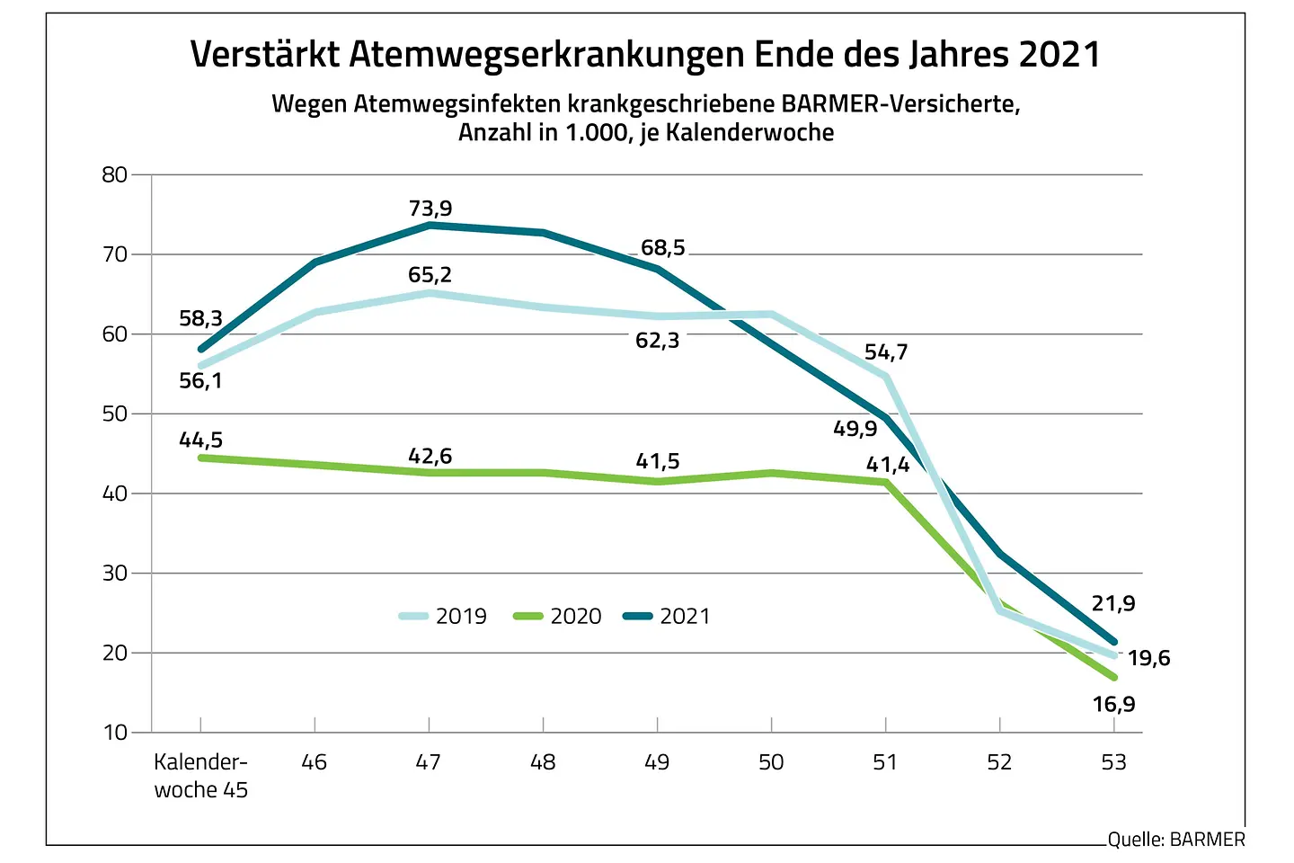 Berlin, 7. Februar 2022 – Atemwegsinfekte haben in den letzten beiden Monaten des Jahres 2021 zu besonders vielen Krankschreibungen geführt. Das geht aus einer Barmer-Analyse der Kalenderwochen (KW) 45 bis 53 über mehrere Jahre hervor. In der Spitze waren demnach in KW 47 des vergangenen Jahres (20. bis 27. November) knapp 74.000 Barmer-Versicherte wegen typischer saisonaler Atemwegsinfekte arbeitsunfähig. Laut der Analyse, in der keine Corona-, Grippe- oder Pneumonie-Fälle enthalten sind, entspricht dies 195 je 10.000 Krankengeld-Anspruchsberechtigten. In KW 47 des Jahres 2020 gab es dagegen knapp 43.000 Betroffene und im Vergleichszeitraum des Jahres 2019, also wenige Monate vor Pandemiebeginn, gut 65.000 arbeitsunfähige Barmer-Versicherte. „Die Erkältungswelle war im vergangenen Winter vergleichsweise flach. Deshalb dürfte der Antikörperschutz bei vielen Menschen nun etwas geringer sein, wodurch Atemwegsinfekte leichter auftreten können“, sagt Prof. Dr. Christoph Straub, Vorstandsvorsitzender der Barmer. Auch in den letzten beiden Kalenderwochen des Jahres 2021 habe es mehr Atemwegsinfekte gegeben als in den Vorjahreszeiträumen. Hier sei die Zahl der Krankschreibungen wegen der Weihnachtsferien aber grundsätzlich geringer.