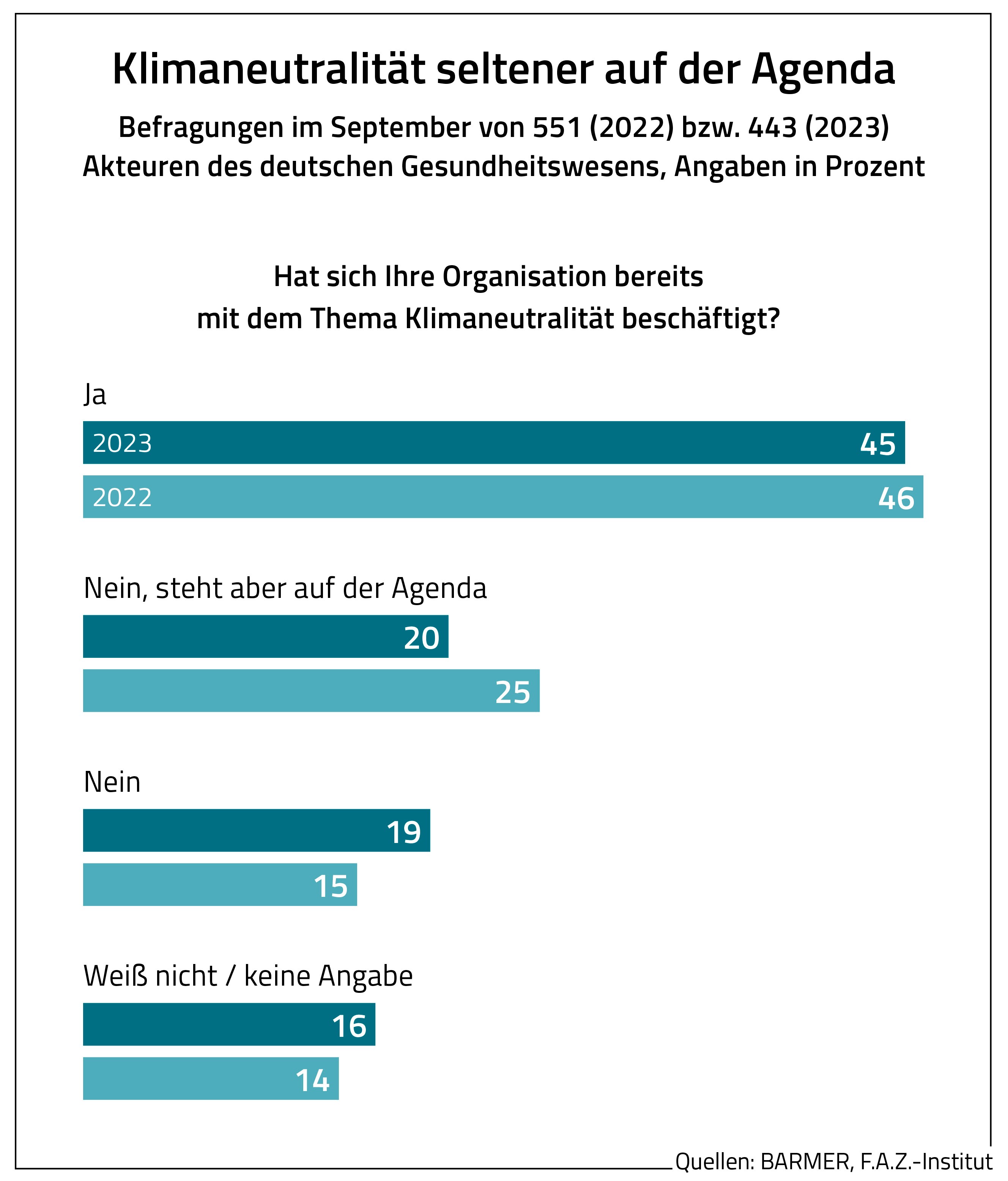 Berlin, 24. November 2023 – Nur jede zehnte Organisation im deutschen Gesundheitswesen rechnet damit, dass dieses bereits im Jahr 2030 klimaneutral sein wird. Das geht aus der jährlichen Studienreihe „Klimaneutraler Gesundheitssektor“ der Barmer und des F.A.Z. -Instituts hervor. Im Sommer 2023 wurden dazu rund 440 Personen aus Praxen, Krankenkassen, Kliniken, Apotheken, Sanitätshäusern und der medizinischen Industrie interviewt. Demnach haben sich bis Mitte des Jahres erst 45 Prozent der Organisationen mit Klimaneutralität befasst. Bei weiteren 20 Prozent steht das auf der Agenda. Im Jahr zuvor lag der Wert noch bei 25 Prozent. „Das Gesundheitswesen trägt in Deutschland stärker zum Klimawandel bei als der Flugverkehr. Deshalb müssen Klimaschutz und Nachhaltigkeit hier auch mehr Bedeutung bekommen. Nachhaltigkeit muss im Gesundheitswesen zur Basis des Verwaltungshandelns und im Sozialgesetzbuch verankert werden“, fordert Simone Schwering, stellvertretende Vorstandsvorsitzende der Barmer, heute auf dem Deutschen Nachhaltigkeitstag in Düsseldorf. So hätten zuletzt 29 Prozent der Befragten regulatorische Vorgaben als wesentlichen Treiber für den klimaneutralen Betrieb ihrer Organisation genannt. Das seien zehn Prozentpunkte mehr als im Jahr zuvor. Der wichtigste Antrieb sei aber nach wie vor die gesellschaftliche Bedeutung des Themas Nachhaltigkeit.