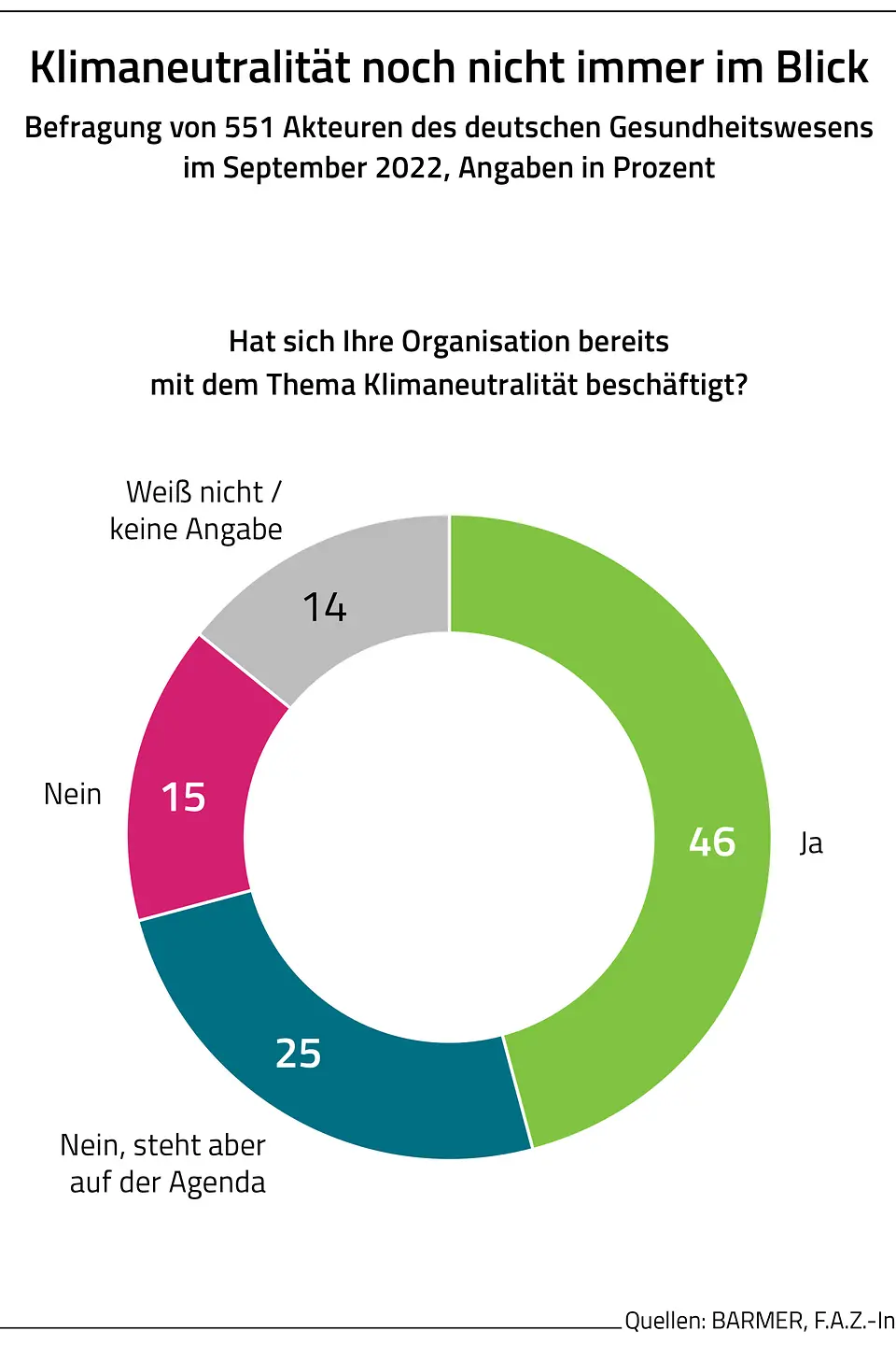 Berlin, 6. Januar 2023 – Der Klimaschutz hat im Gesundheitswesen in Deutschland bisher nur eine untergeordnete Rolle gespielt. So haben sich bis Mitte vergangenen Jahres erst 46 Prozent der Organisationen im Gesundheitssektor mit dem Thema Klimaneutralität befasst. Bei weiteren 25 Prozent steht es auf der Agenda. Das geht aus der Studienreihe „Klimaneutraler Gesundheitssektor“ der Barmer und des F.A.Z.-Instituts hervor. Im Sommer 2022 wurden dazu erstmals rund 550 Akteure aus Praxen, Krankenkassen, Kliniken, Apotheken, Sanitätshäusern und der medizinischen Industrie interviewt. Demnach rechnen lediglich elf Prozent der Befragten bis zum Jahr 2030 mit einem klimaneutralen Gesundheitswesen. Dabei verursacht es mehr als fünf Prozent der nationalen Treibhausgasemission und trägt damit stärker zum Klimawandel bei als der Flugverkehr. „Politik und alle Akteure im Gesundheitssektor müssen Nachhaltigkeit und Klimaschutz deutlich höher priorisieren, Hürden in der Gesetzgebung beseitigen und gezielt Anreize schaffen. Nachhaltigkeit sollte Grundbedingung des Verwaltungshandelns sein und im Sozialgesetzbuch verankert werden“, sagt Prof. Dr. med. Christoph Straub, Vorstandsvorsitzender der Barmer.