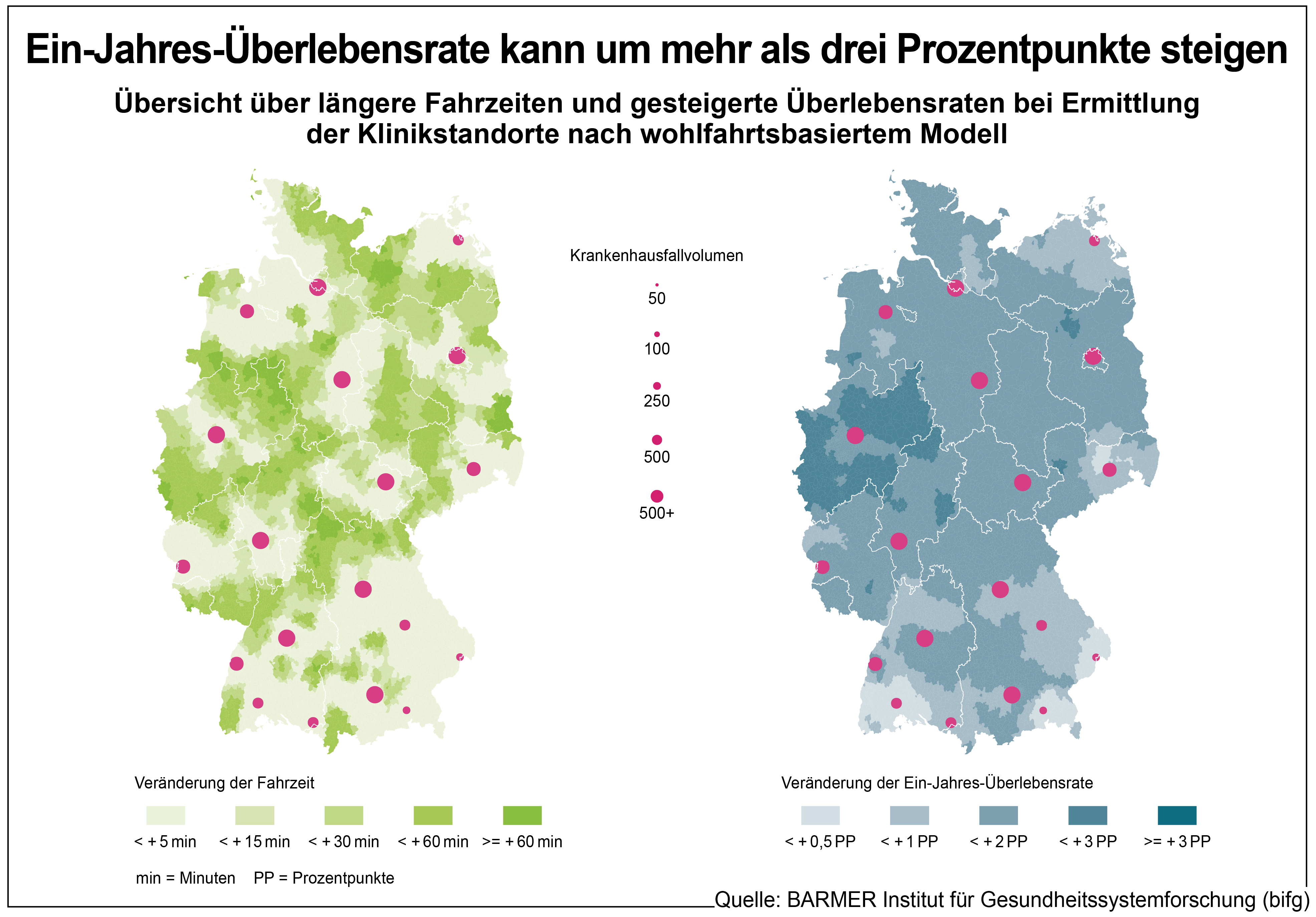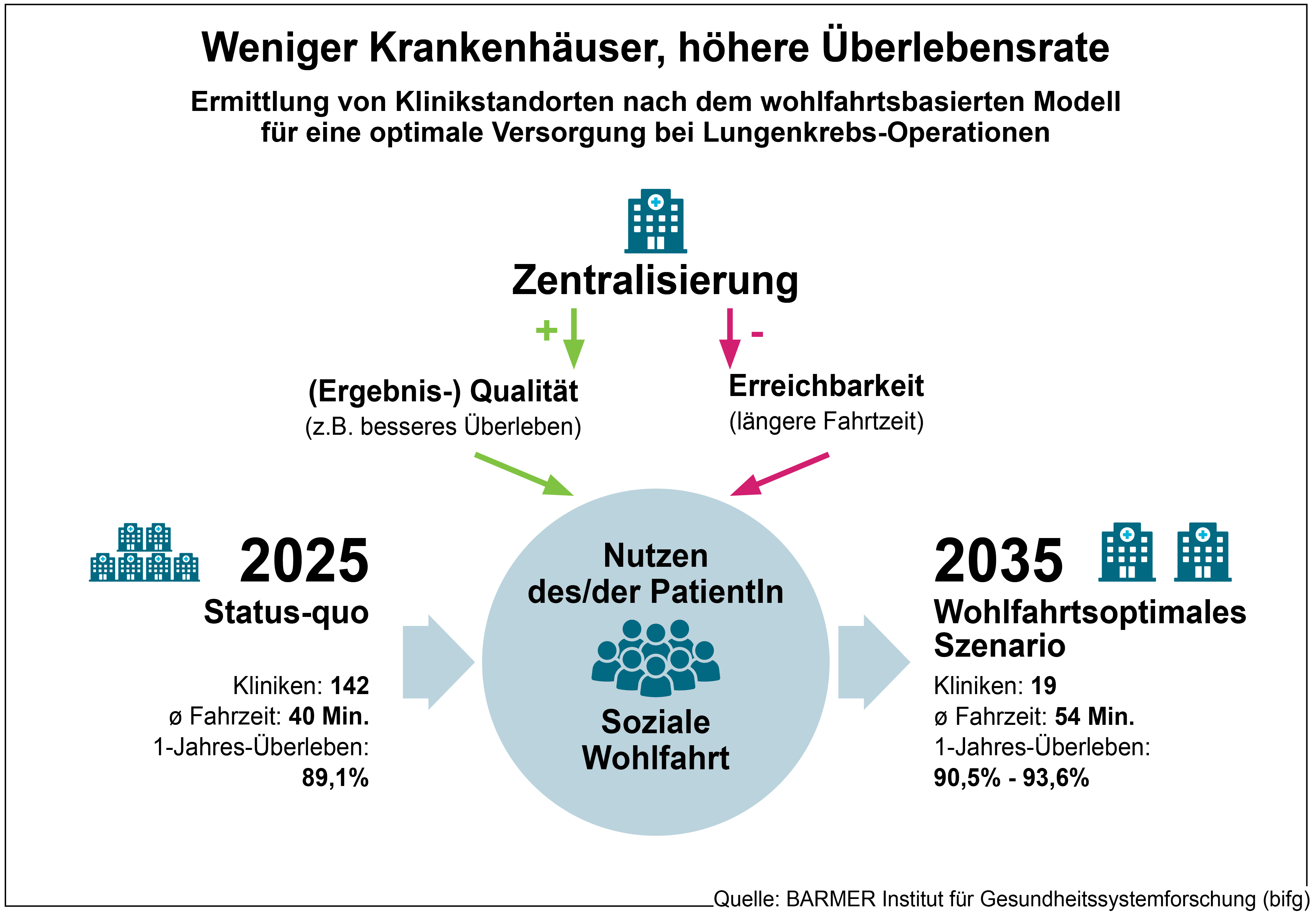 Die Studie zeigt, dass eine höhere Fallzahl und größere Erfahrung eines Krankenhauses bei der chirurgischen Behandlung von Lungenkrebs zu besseren Überlebenschancen führt. Dies deutet auf eine gesteigerte Versorgungsqualität durch Zentralisierung hin. Zudem wurden 1.000 Personen unter anderem dazu befragt, welche Entfernung zu einer Klinik je nach Qualität der dortigen Versorgung aus ihrer Sicht angemessen sei. Anhand dieser Wechselwirkung wurde anschließend bestimmt, an welchen Standorten Lungenkrebs chirurgisch idealerweise behandelt werden sollte. Diese so gewählten Behandlungsorte stellten für die Gesamtheit der Betroffenen die optimale Balance zwischen Behandlungsqualität und räumlicher Nähe dar. „Patientinnen und Patienten legen großen Wert auf eine qualitativ hochwertige Versorgung. Dafür sind sie bereit, auch längere Fahrtwege in Kauf zu nehmen. Diese Erkenntnisse sollten künftig in eine patientenzentrierte Planung von Versorgungsstrukturen einfließen“, so BARMER-Chef Straub.