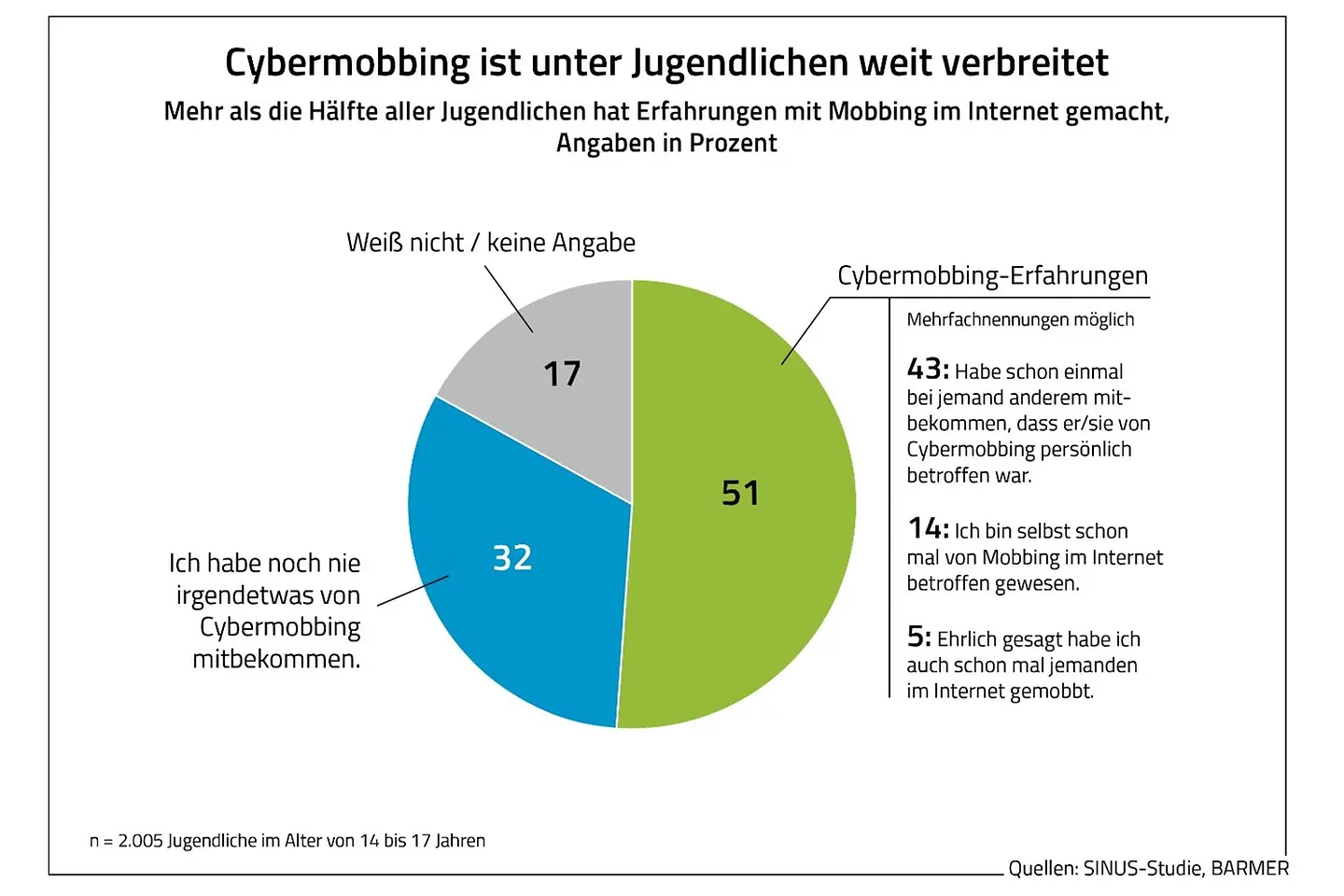 Berlin, 30. Dezember 2021 – Ob als Täter, Opfer oder Beobachter, 51 Prozent der Jugendlichen zwischen 14 und 17 Jahren in Deutschland haben Erfahrungen mit Cybermobbing. Das zeigen Ergebnisse der im Auftrag der Barmer entstandenen Sinus-Jugendstudie 2021. Darin berichten 14 Prozent der rund 2.000 Befragten, direkt von Cybermobbing betroffen gewesen zu sein. Immerhin fünf Prozent gestanden ein, selbst gemobbt zu haben. Am häufigsten bejahten die Teenager, bei anderen Mobbingattacken beobachtet zu haben (43 Prozent). „Cybermobbing ist im Leben der Jugendlichen nach wie vor inakzeptabel weit verbreitet. Die Prävention muss intensiviert werden. Betroffene brauchen leichten Zugang zu Hilfe und vor allem Anlaufstellen, denen sie vertrauen können. Denn allein sind Mobbingattacken nur schwer zu bestehen“, sagt Prof. Dr. Christoph Straub, Vorstandsvorsitzender der Barmer.