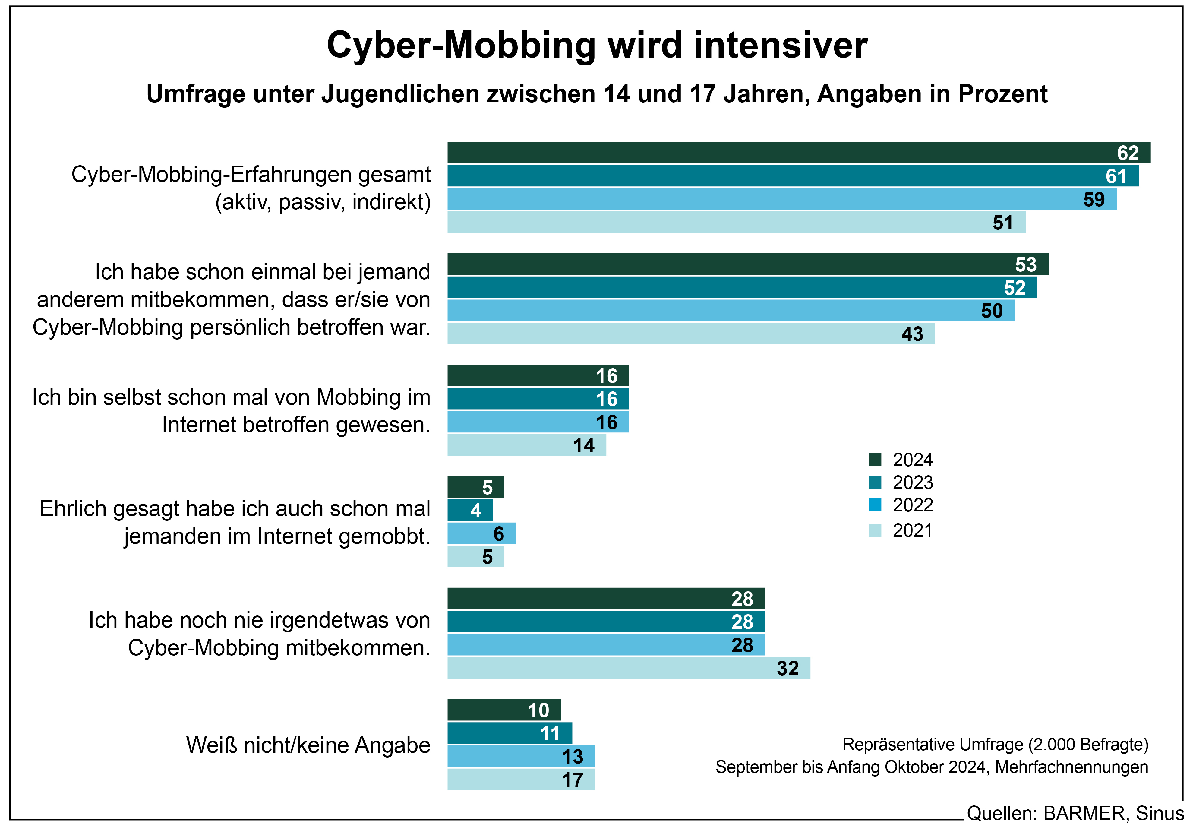 Besonders alarmierend sei ein Teilergebnis der Sinus-Jugendstudie, nach dem 25 Prozent der Betroffenen keinerlei Unterstützung bei Cyber-Mobbing-Attacken erhalten haben sollen. Dieser Wert lag im Jahr 2023 mit 15 Prozent, in 2022 mit 19 Prozent und 2021 mit 16 Prozent noch deutlich niedriger und kann damit als dramatische Verschlechterung bewertet werden.