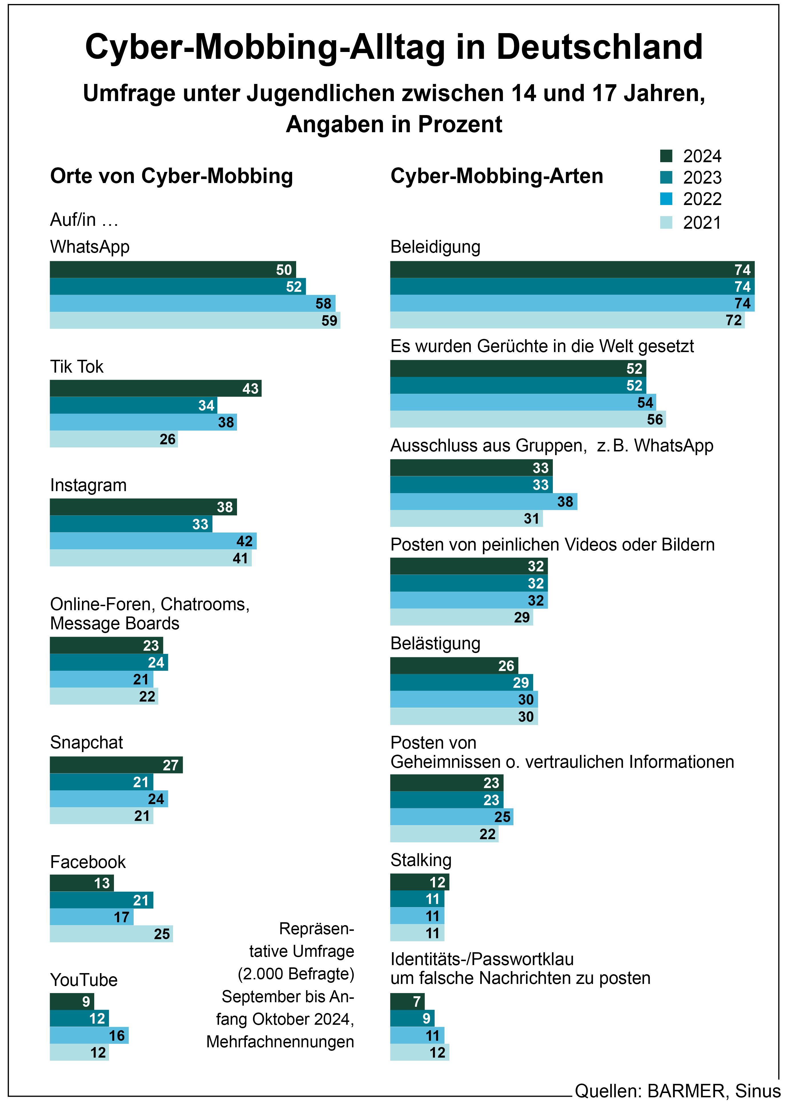 Berlin, 23. März 2025 – Immer mehr junge Menschen in Deutschland sind von Cyber-Mobbing betroffen. Das geht aus der repräsentativen Sinus-Jugendstudie 2024/2025 im Auftrag der BARMER hervor, für die im Herbst 2024 bundesweit rund 2.000 Jugendliche zwischen 14 und 17 Jahren befragt wurden. 16 Prozent der Befragten gaben an, selbst Opfer von Cyber-Mobbing geworden zu sein. Das ist ein Anstieg um zwei Prozentpunkte im Vergleich zum Jahr 2021. Mehr als jeder zweite Jugendliche (53 Prozent) berichtete davon, dass jemand aus seinem direkten Umfeld Ziel von Cyber-Mobbing wurde. Dieser Wert lag im Jahr 2021 noch bei 43 Prozent. „Cyber-Mobbing ist für Jugendliche eine erhebliche Gefahr, da es tiefgreifende psychische und soziale Auswirkungen haben kann. Betroffene leiden häufig unter Stress, Angst und vermindertem Selbstwertgefühl, was im schlimmsten Fall zu Depressionen oder gar Suizidgedanken führen kann“, sagt Prof. Dr. med. Christoph Straub, Vorstandsvorsitzender der BARMER. Auch könnten ständige Belästigungen in sozialen Medien schulische Leistungen beeinträchtigen und zu sozialer Isolation führen.