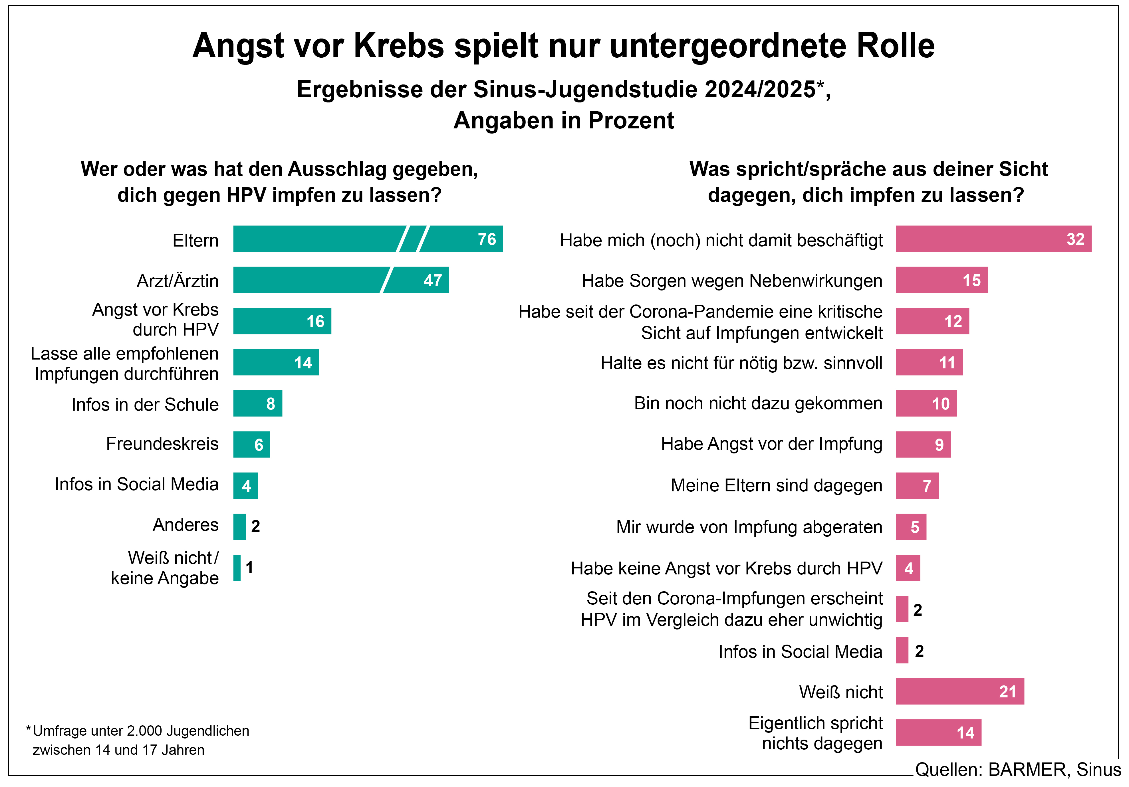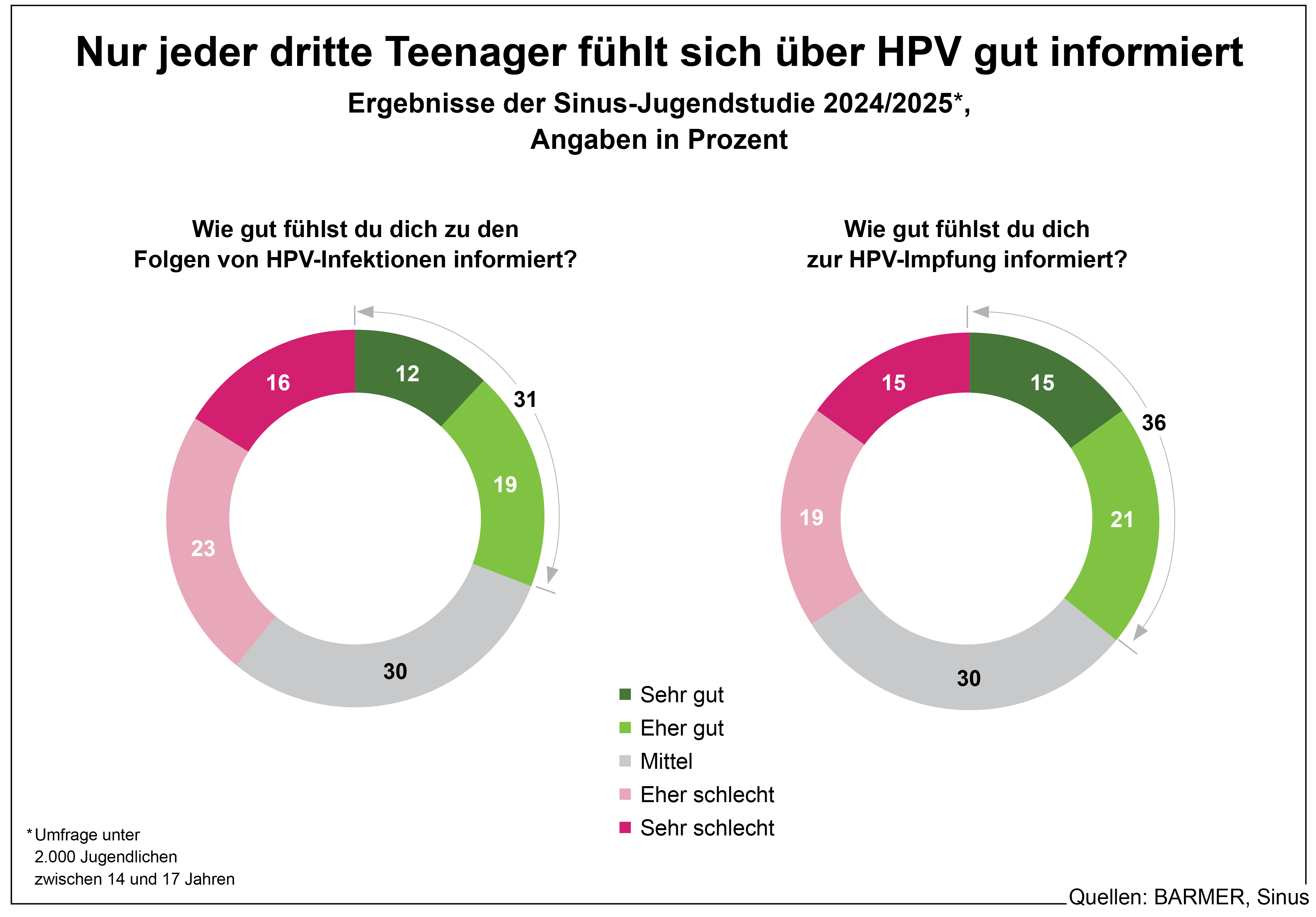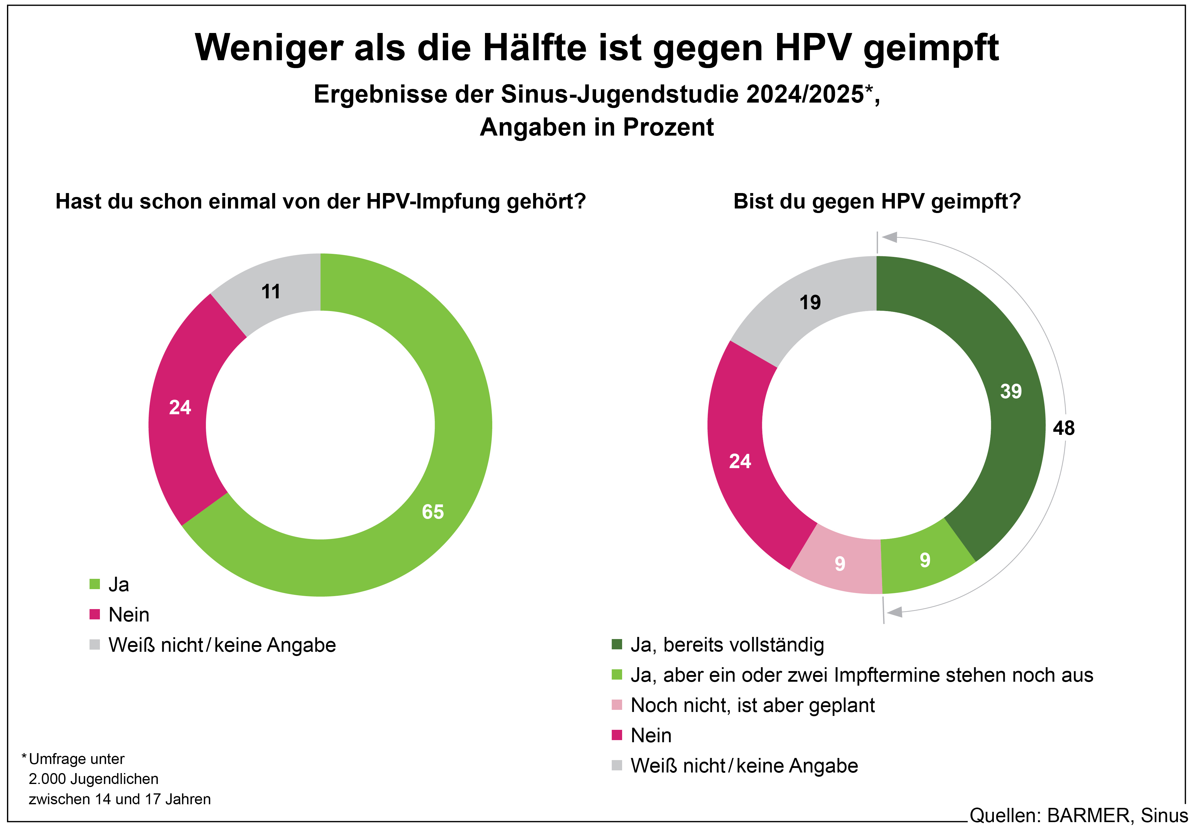 Berlin, 28. August 2025 – Nicht einmal jede zweite Person zwischen 14 und 17 Jahren ist gegen das humane Papillomavirus (HPV) geimpft, das der Hauptverursacher von Gebärmutterhalskrebs ist. Das geht aus der repräsentativen Sinus-Jugendstudie 2024/2025 im Auftrag der BARMER hervor, für die im Herbst 2024 bundesweit 2.000 Jugendliche befragt wurden. Demnach waren nur 48 Prozent zumindest einmal gegen HPV geimpft. Bei weiteren neun Prozent war die Immunisierung geplant. 55 Prozent der weiblichen und 42 Prozent der männlichen Teenager waren zumindest einmal geimpft. „Noch immer sind zu wenige junge Menschen gegen das humane Papillomavirus geimpft. Dabei kann die Impfung Krebs verhindern und Todesfälle vermeiden. HPV ist für die Hälfte aller virusbedingten bösartigen Tumore und für fast 100 Prozent der Fälle von Gebärmutterhalskrebs verantwortlich“, sagt Prof. Dr. med. Christoph Straub, Vorstandsvorsitzender der BARMER. Nicht ohne Grund empfehle die Ständige Impfkommission am Robert Koch-Institut die HPV-Impfung bei Mädchen und Jungen zwischen neun und 14 Jahren.