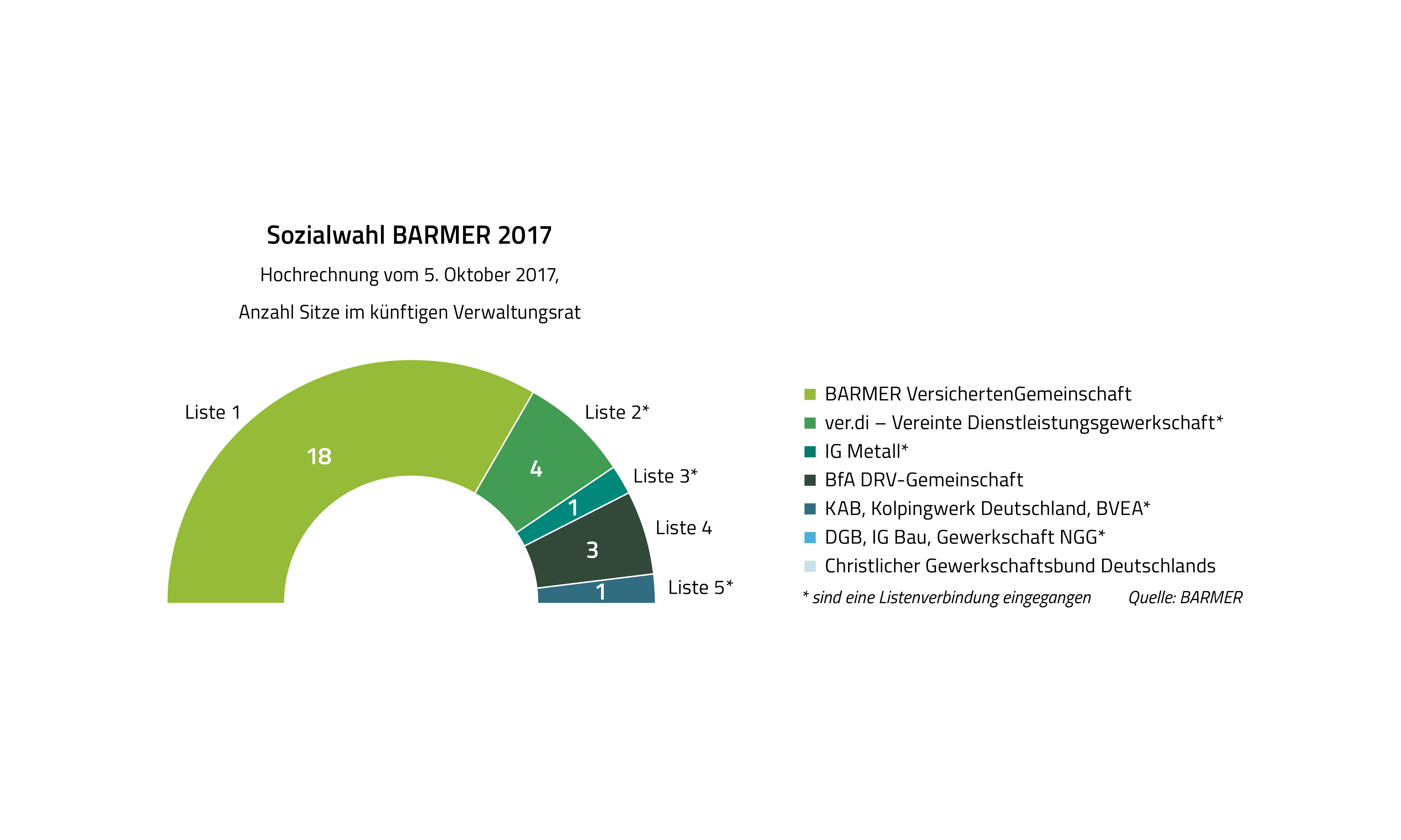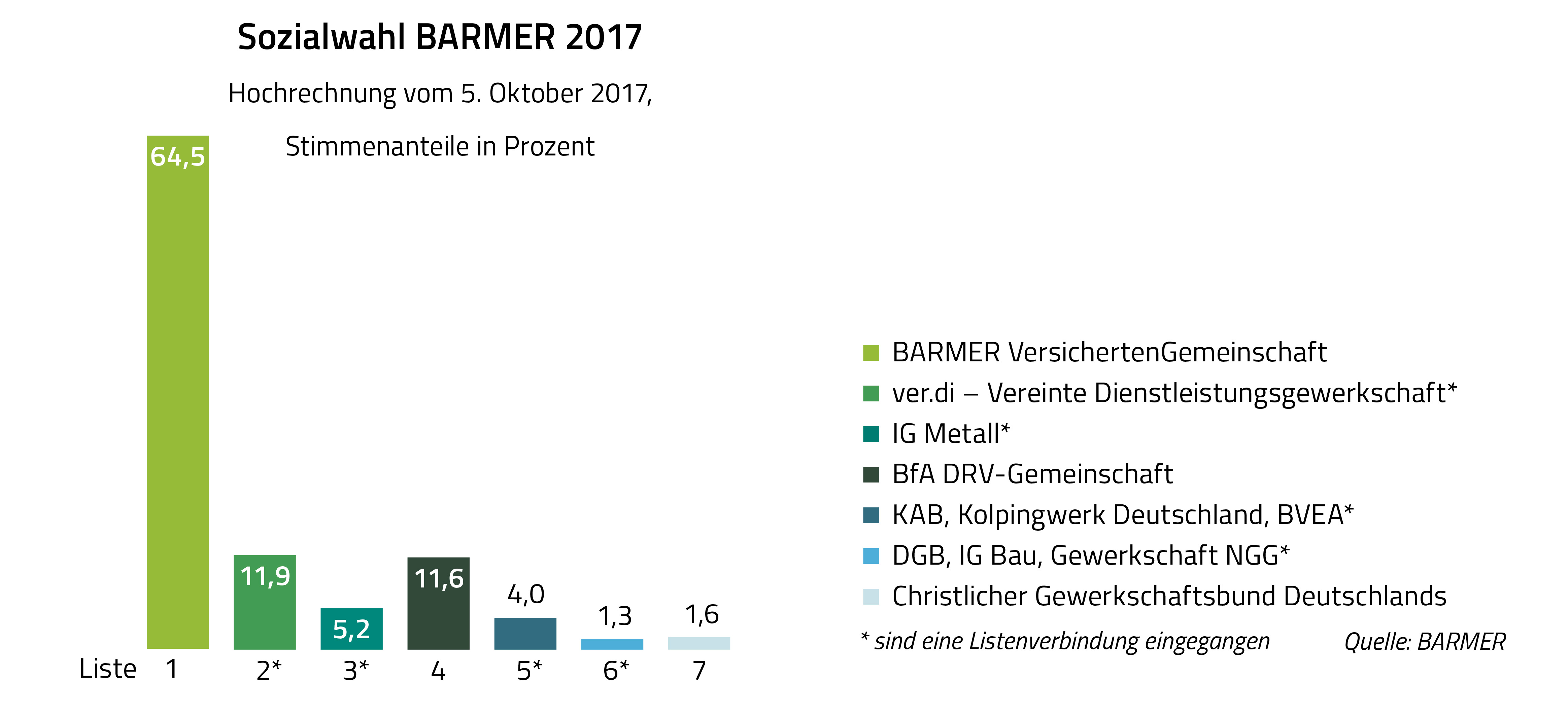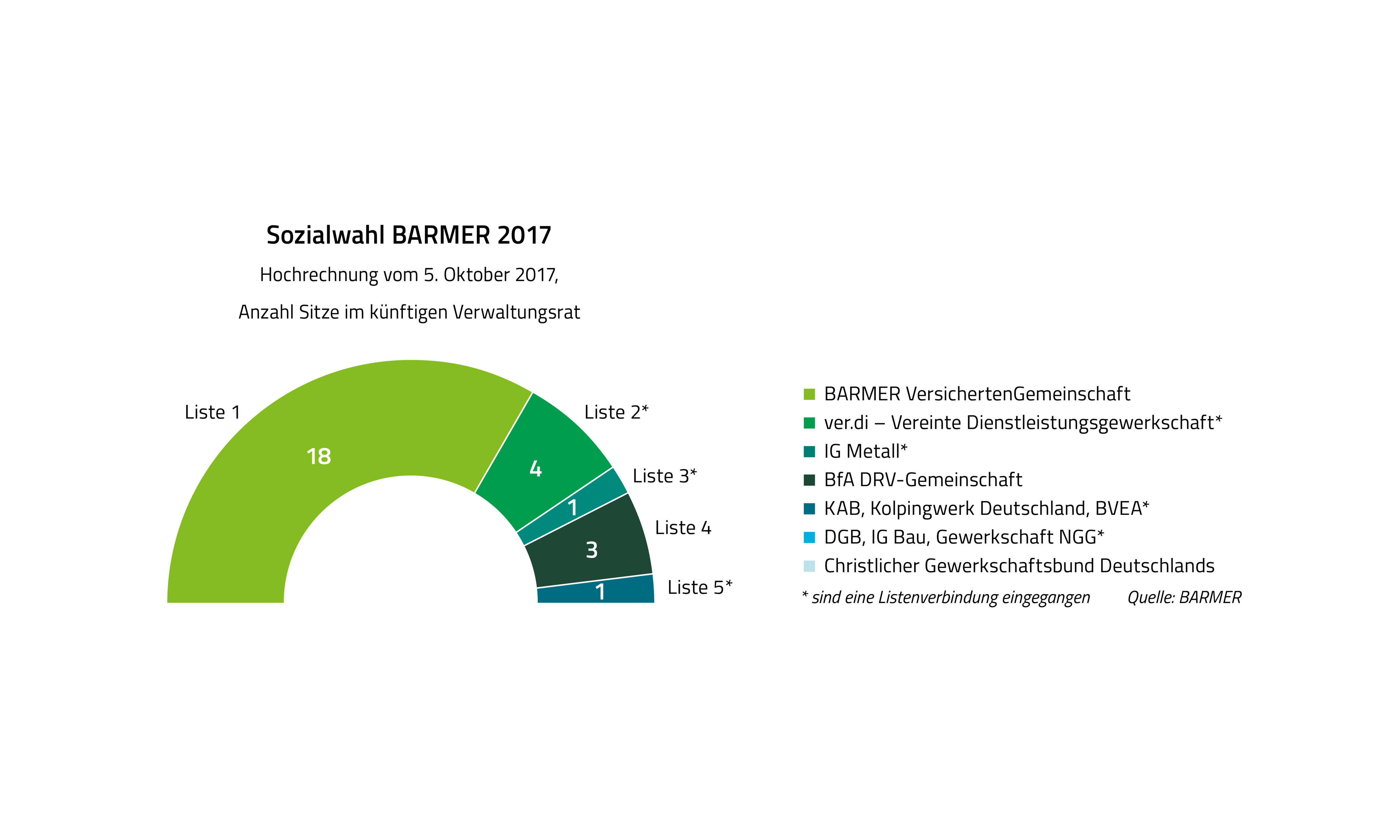 Die aktuelle Hochrechnung basiert auf der Auszählung von mehr als 100.000 Stimmen. Das Endergebnis wird am 17. Oktober 2017 festgestellt. Der neu gewählte Verwaltungsrat der Barmer konstituiert sich am 17. November 2017 in Berlin.