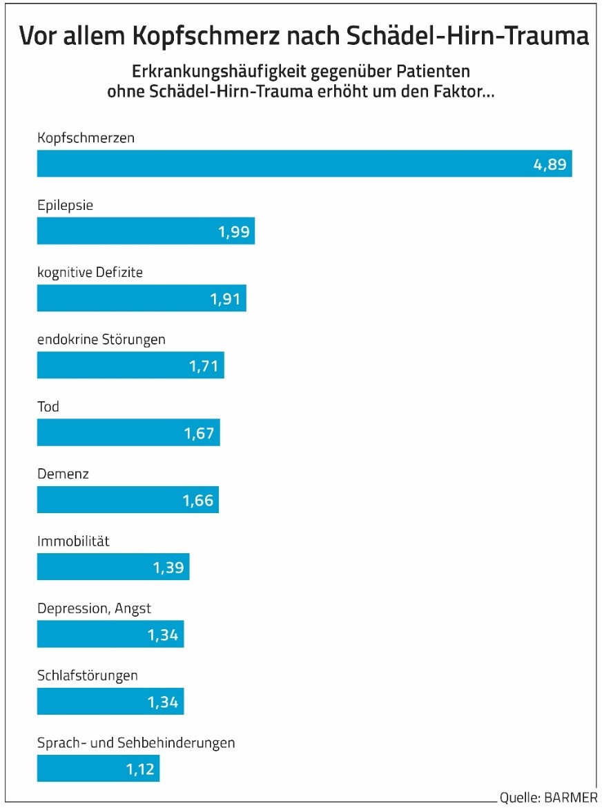 Die Studienautoren analysierten die Krankheitshistorie der beiden Patientengruppen über einen Zeitraum von zehn Jahren. Dabei fanden sie heraus, dass sich nach einem Schädelhirntrauma grundsätzlich höhere Inzidenzraten bei verschiedenen Erkrankungen zeigten. So litten die Betroffenen knapp fünfmal häufiger an Kopfschmerzen als Personen der Kontrollgruppe. Epilepsien und kognitive Defizite traten fast doppelt so häufig auf, endokrine Störungen (etwa durch Verletzungen der Hypophyse) und Demenz rund 1,7 Mal so oft, Immobilität rund 1,4 Mal, Depressionen und Angst sowie Schlafstörungen gut 1,3 Mal und Sprach- und Sehbehinderungen etwa 1,1 Mal so oft wie in der Kontrollgruppe. „Die Studie zeigt deutlich, dass Schädelhirntrauma-Patientinnen und -Patienten nicht nur von erheblichen Kurzzeitfolgen betroffen sind, sondern ihr Leben lang unter den Folgen leiden. Die Betroffenen sterben früher als ohne SHT, und alle untersuchten Erkrankungen treten (auch bei einem leichten SHT) häufiger auf als in der Allgemeinbevölkerung“, erklärt Prof. Wolf Ingo Steudel von der ZNS – Hannelore Kohl Stiftung.