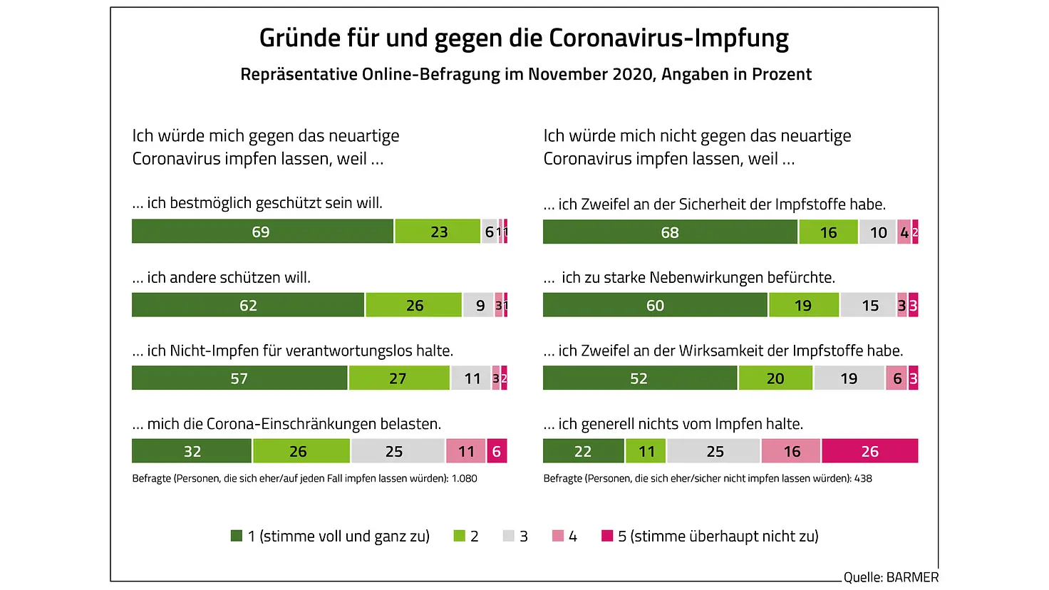 Laut Umfrage wollen sich 69 Prozent der Befragten impfen lassen, um bestmöglich geschützt zu sein. 62 Prozent wollen es tun, um andere zu schützen. Ältere Personen stehen einer Impfung insgesamt offener gegenüber. So wollen sich bei den Befragten ab 60 Jahren knapp zwei Drittel impfen lassen. Bei den 16- bis 39-Jährigen hingegen ist sich nur knapp ein Viertel vollkommen sicher. Für gut ein Fünftel der Befragten (22 Prozent) kommt eine Coronavirus-Impfung nicht in Frage. Dabei stellen Zweifel an der Sicherheit der Impfstoffe (68 Prozent), die Furcht vor Nebenwirkungen (60 Prozent) und Zweifel an der Wirksamkeit (52 Prozent) die größten Hürden dar. Eine generelle Ablehnung von Impfungen spielt mit 22 Prozent eine geringere Rolle.