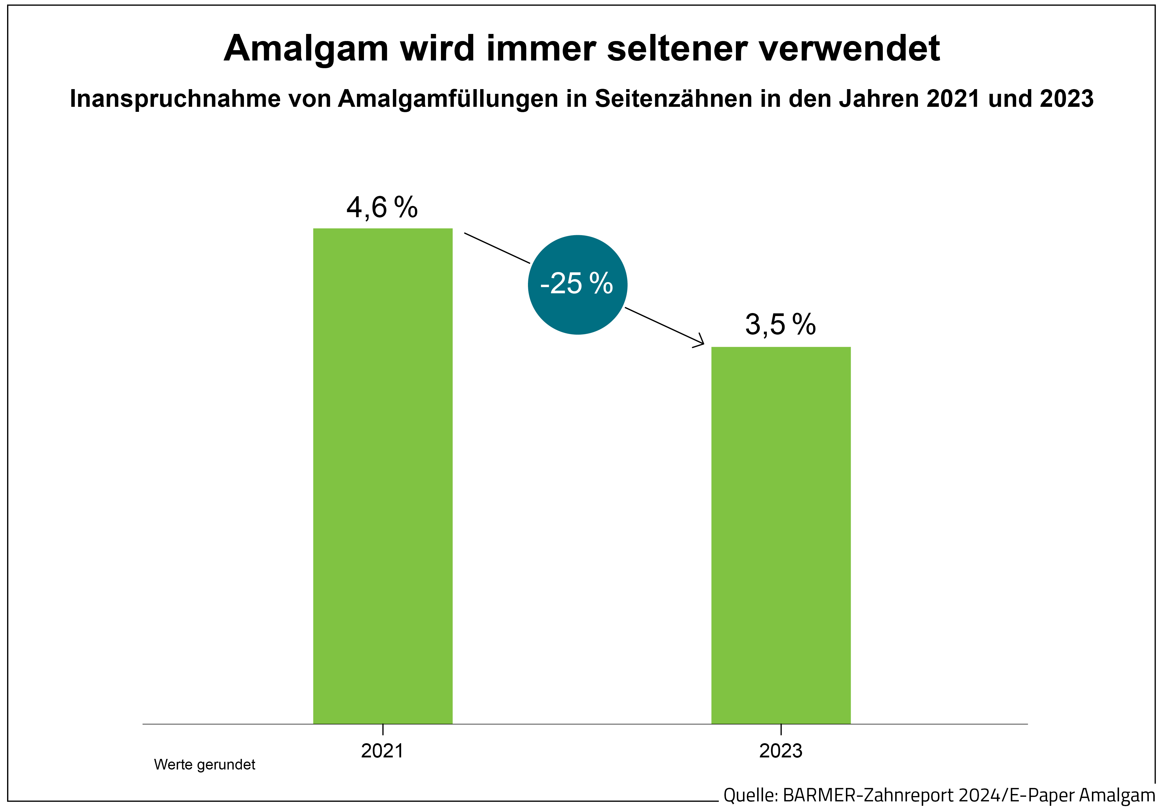 Dem Zahnreport der BARMER zufolge bekamen im Jahr 2023 bundesweit noch 3,5 Prozent der Patientinnen und Patienten in ihren Seitenzähnen eine Amalgamfüllung. Im Jahr 2021 lag dieser Wert noch bei 4,6 Prozent. In dem genannten Zeitraum ergibt sich also eine relative Abnahme von etwa 25 Prozent. Untersucht wurden für diese Werte rund 1,7 Millionen Patienten mit einer Seitenzahnfüllung.